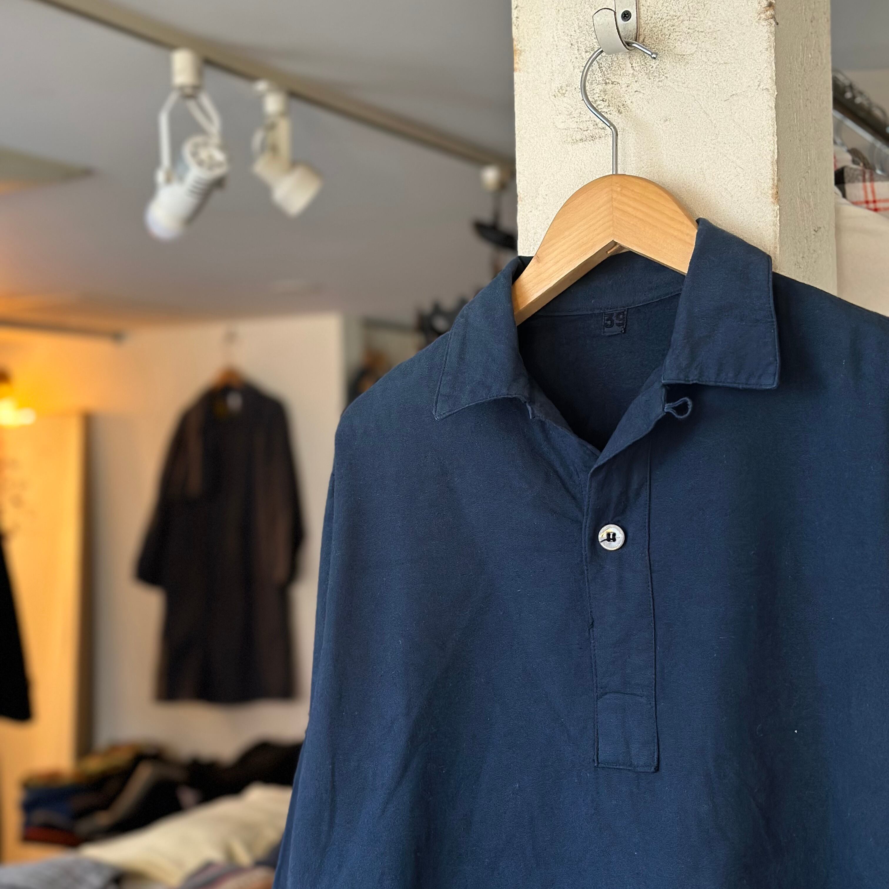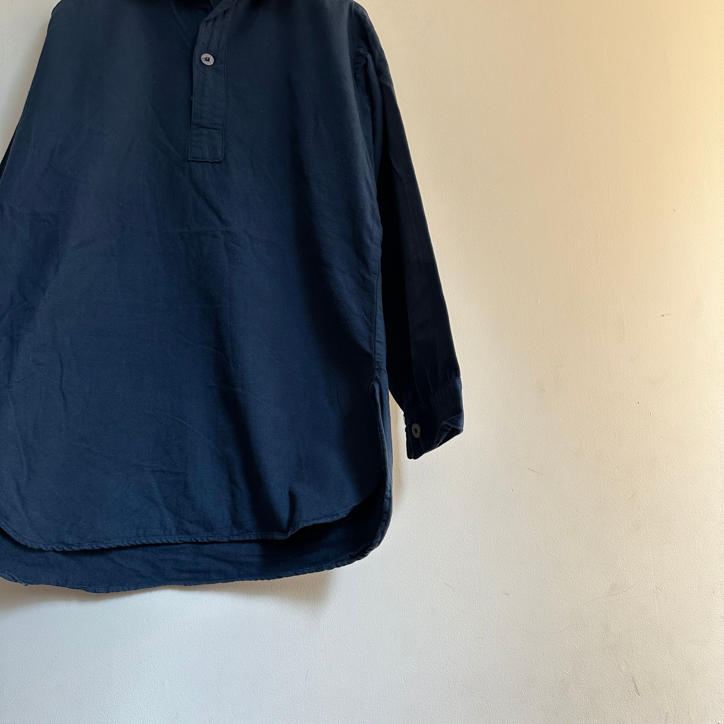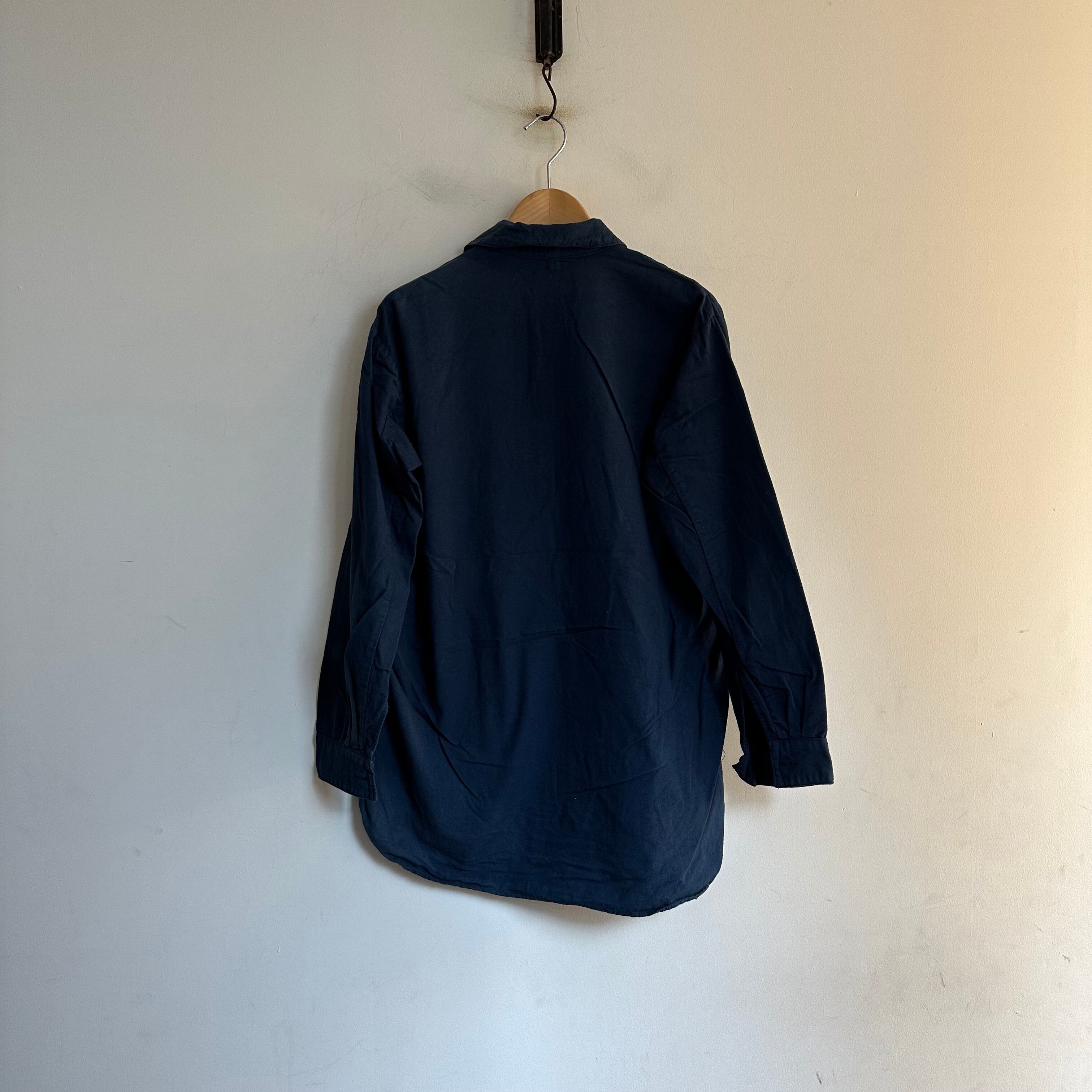 ユーロミリタリーのロングスリーブシャツです。プルオーバーtype。後染めネイビー。着丈長めの形を生かしたシルエットで。お好きな方、いかがでしょうか。