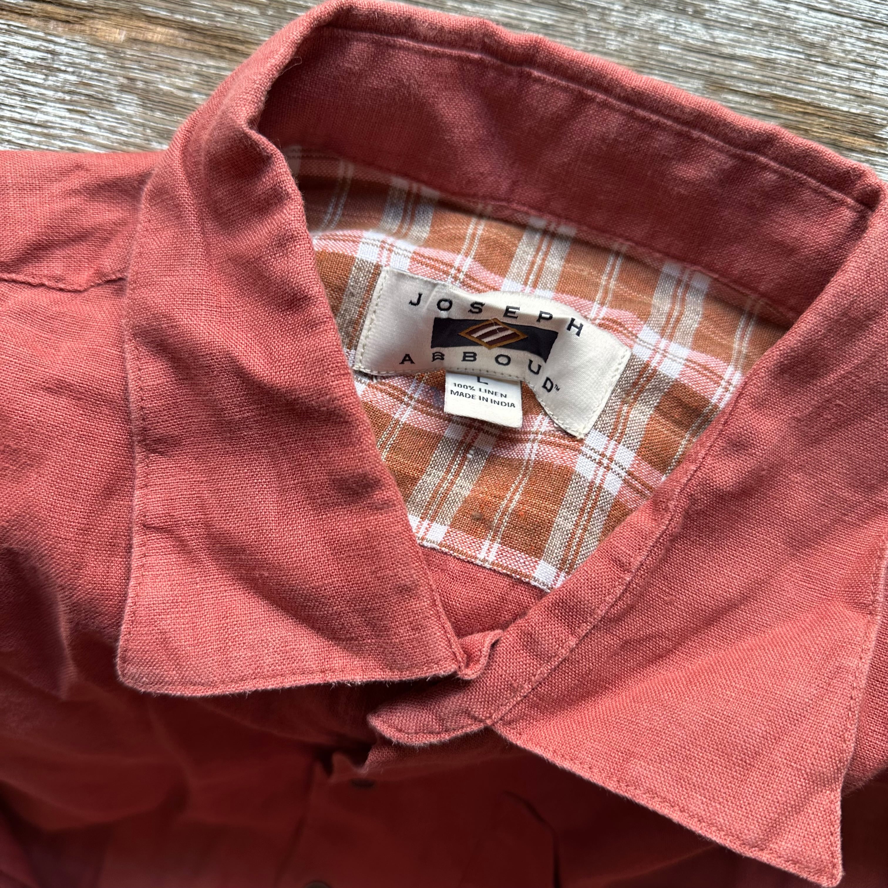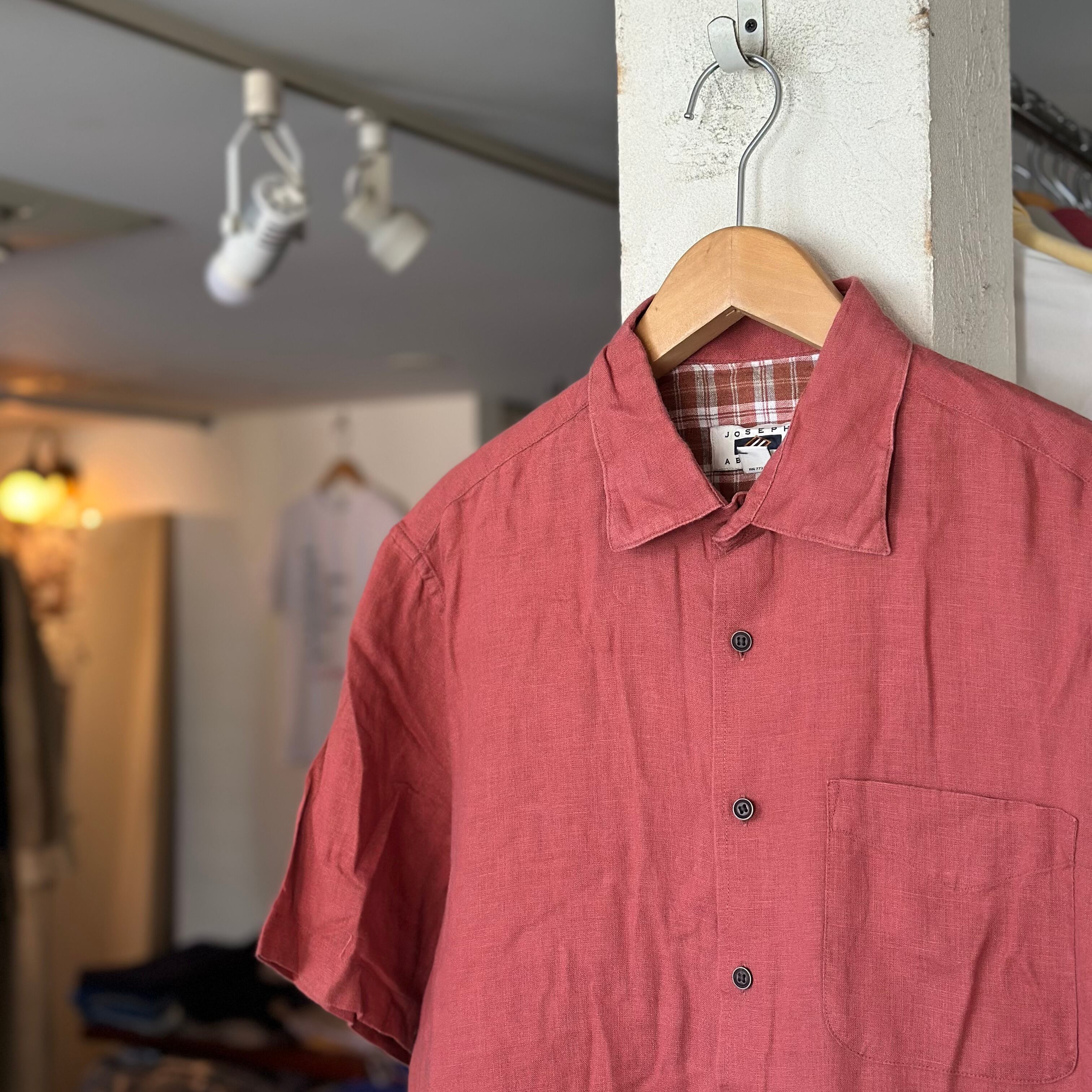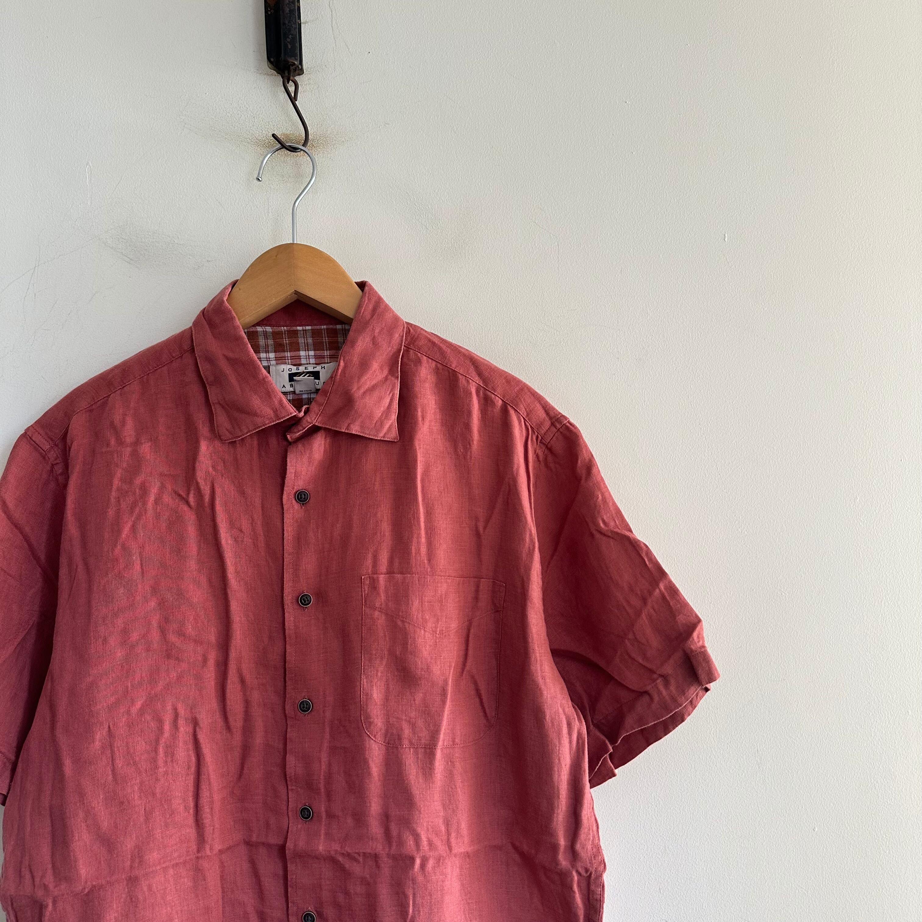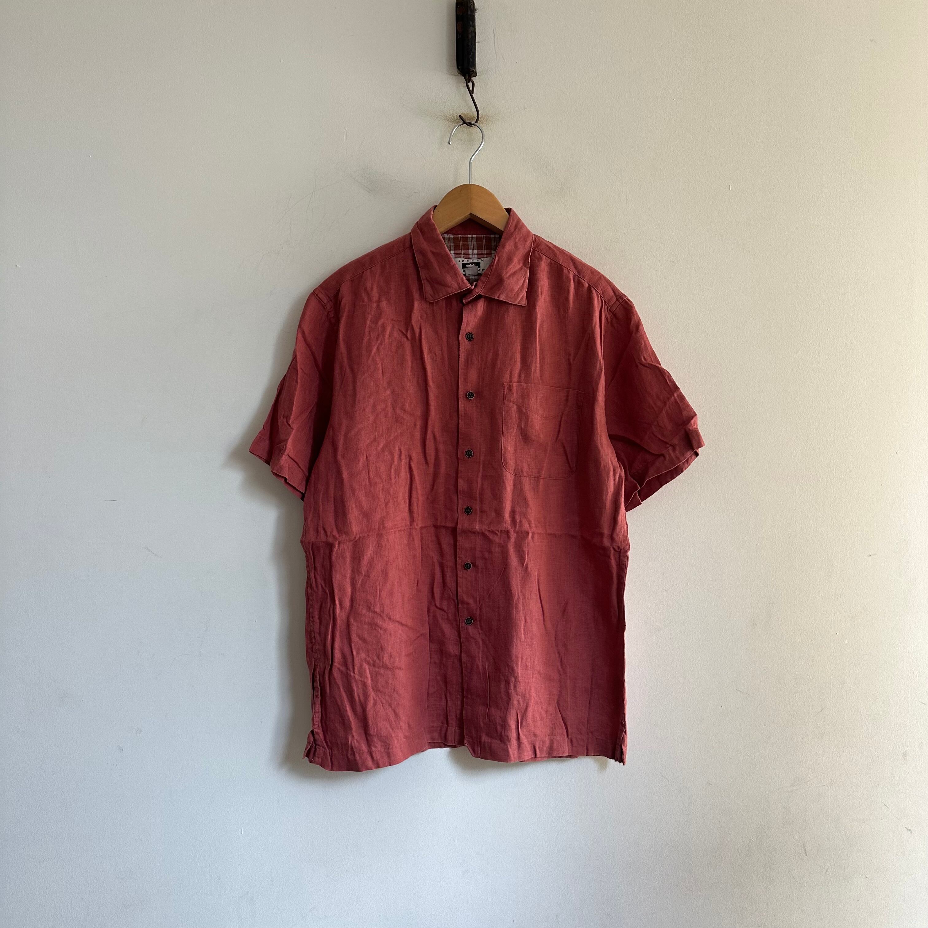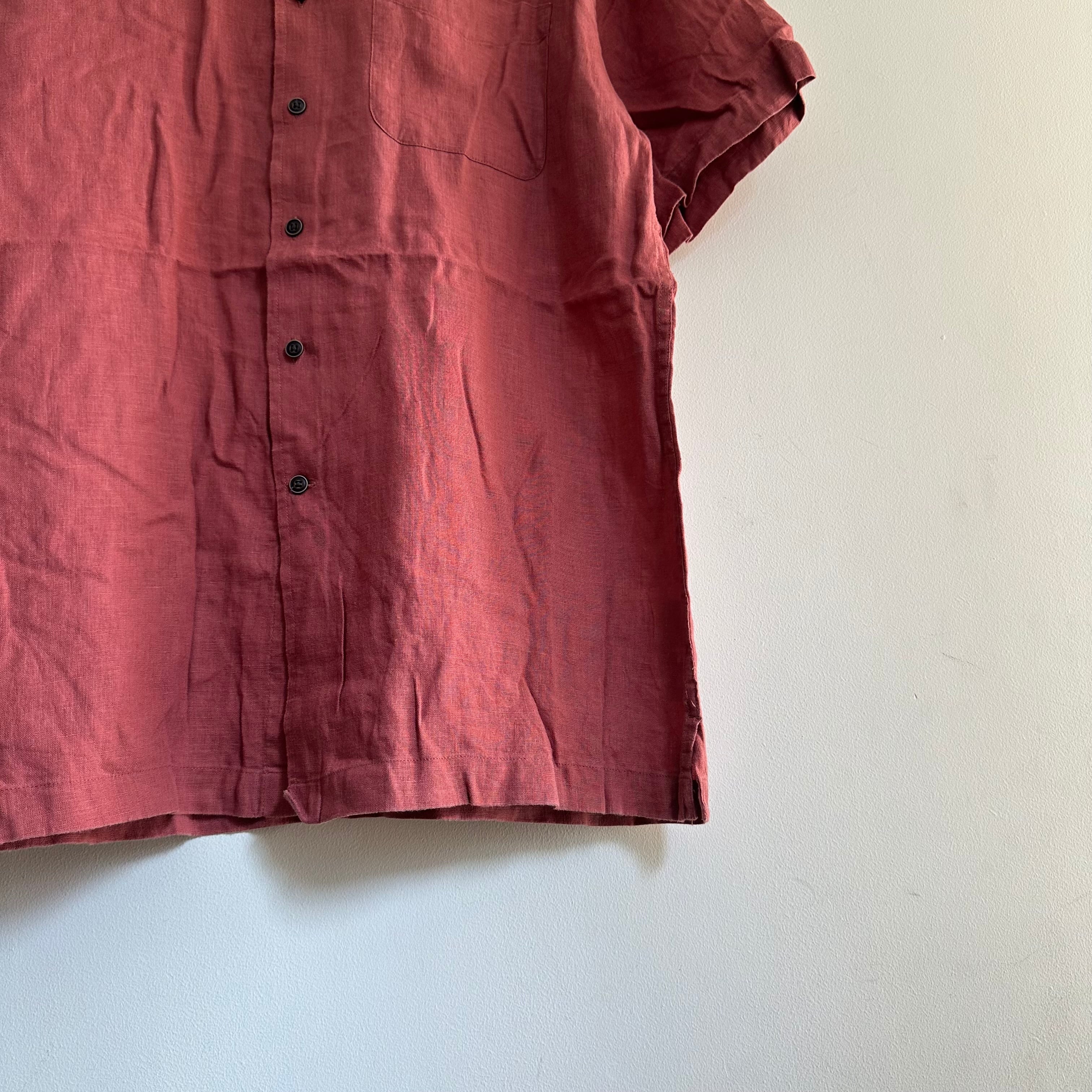 半袖シャツです。LINEN100%生地。赤いレンガ色みたいな良いトーンです。お好きな方、いかがでしょうか。