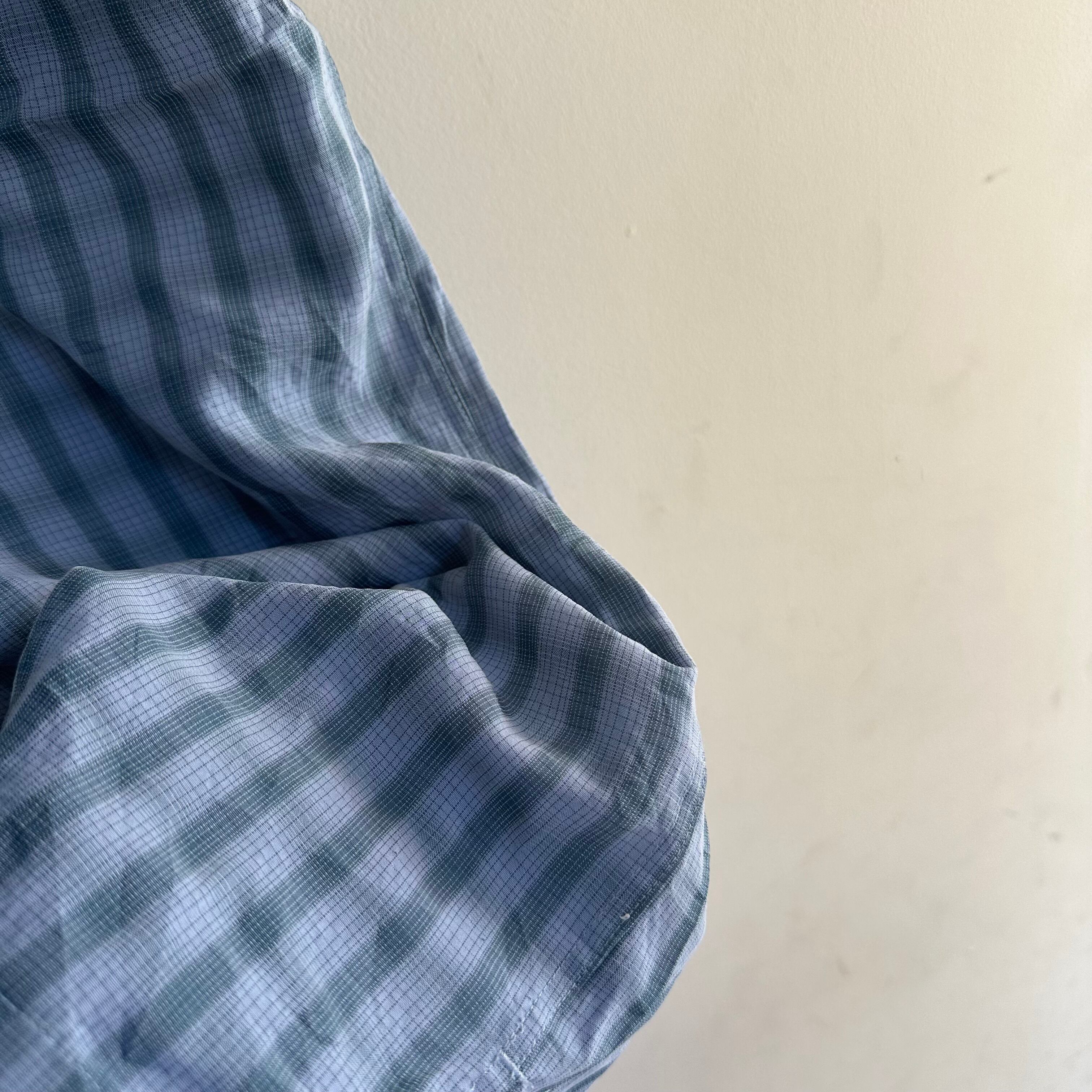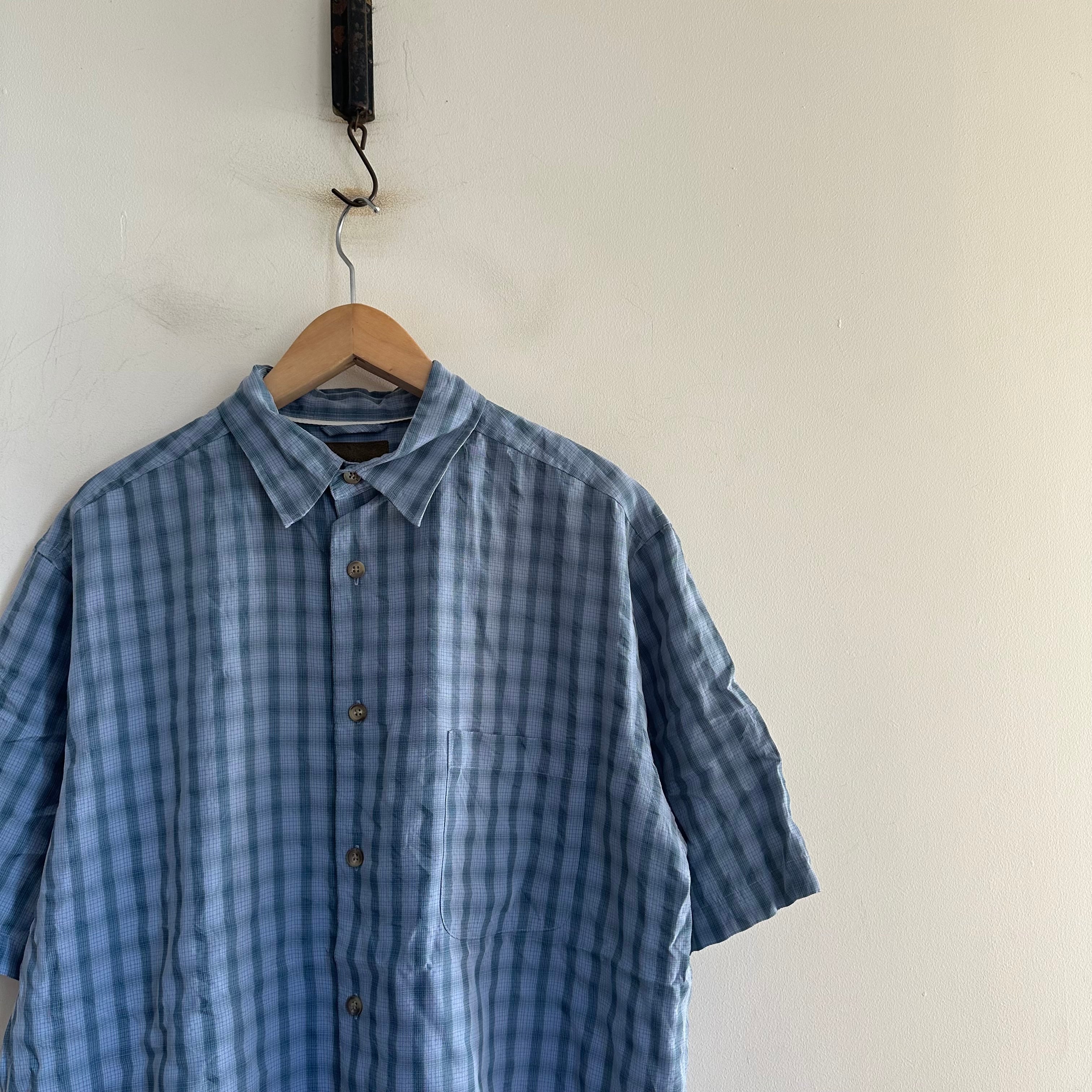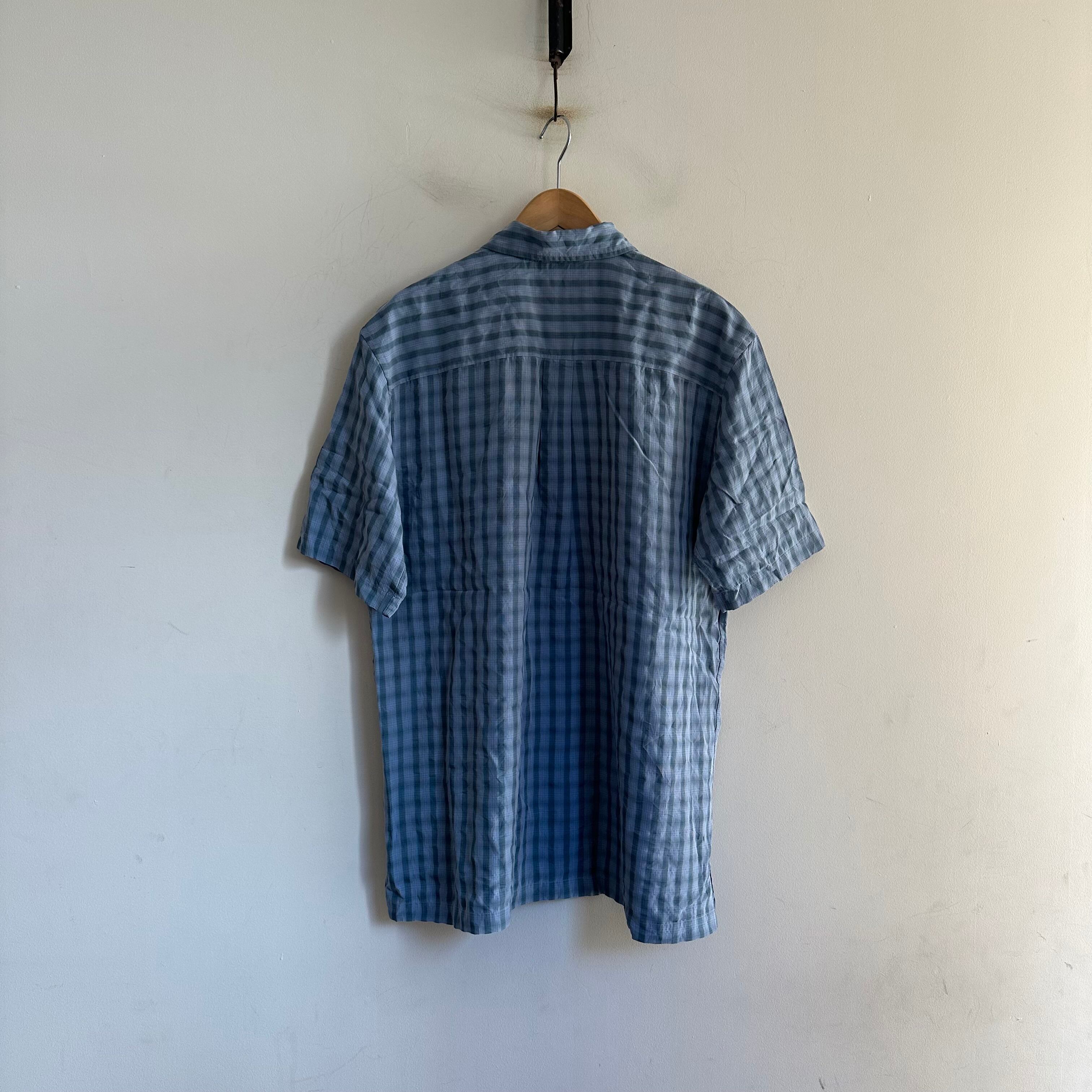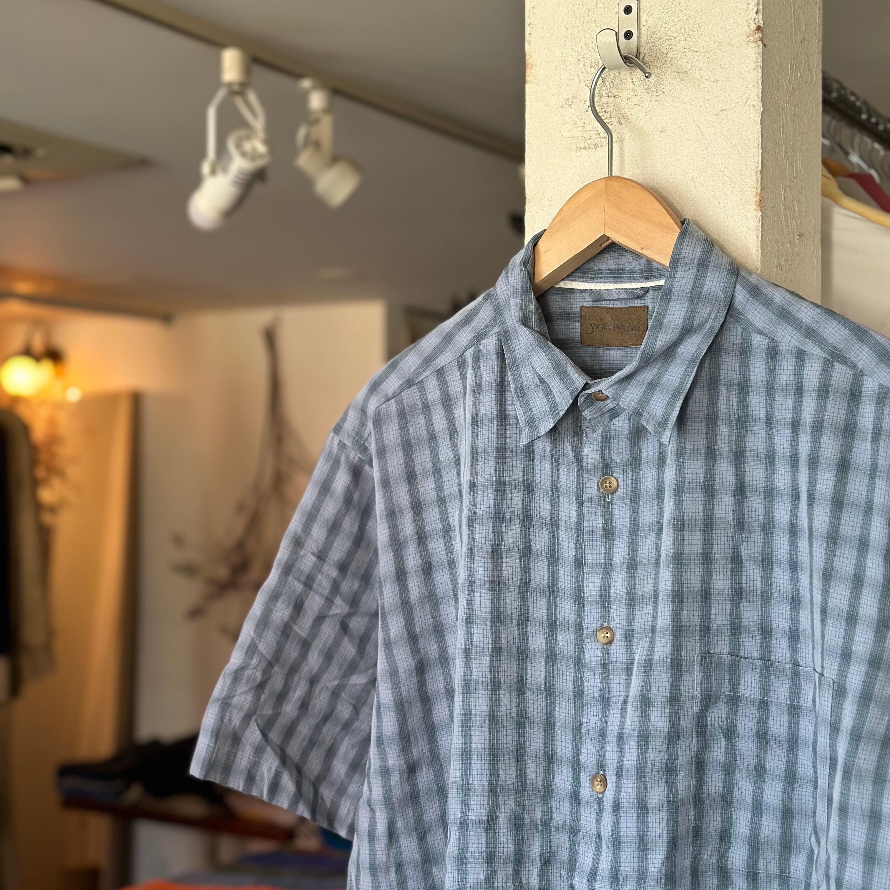 半袖シャツです。rayonベースの生地感。淡いブルーの細かいチェック。緩めのサイズ感で。お好きな方、いかがでしょうか。
