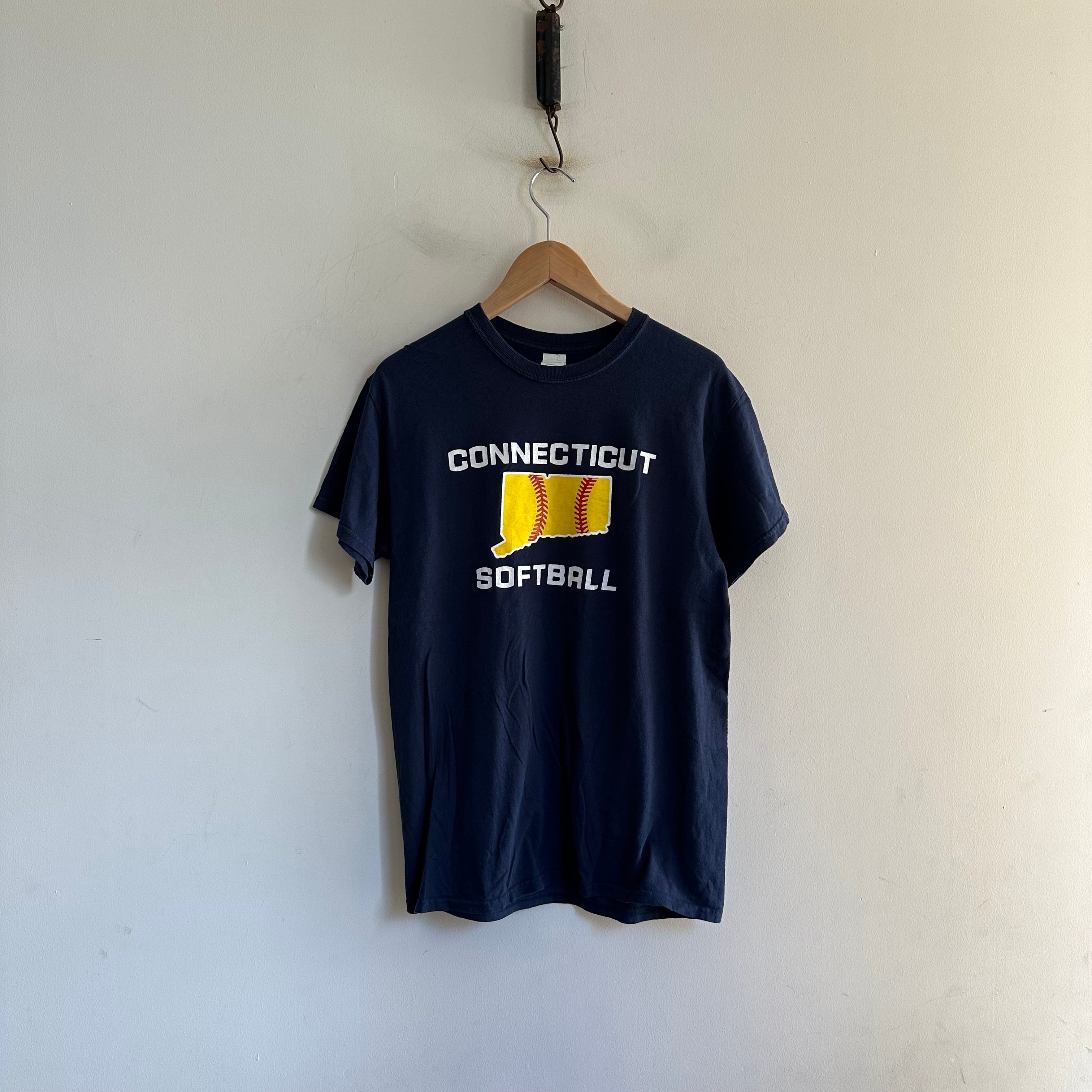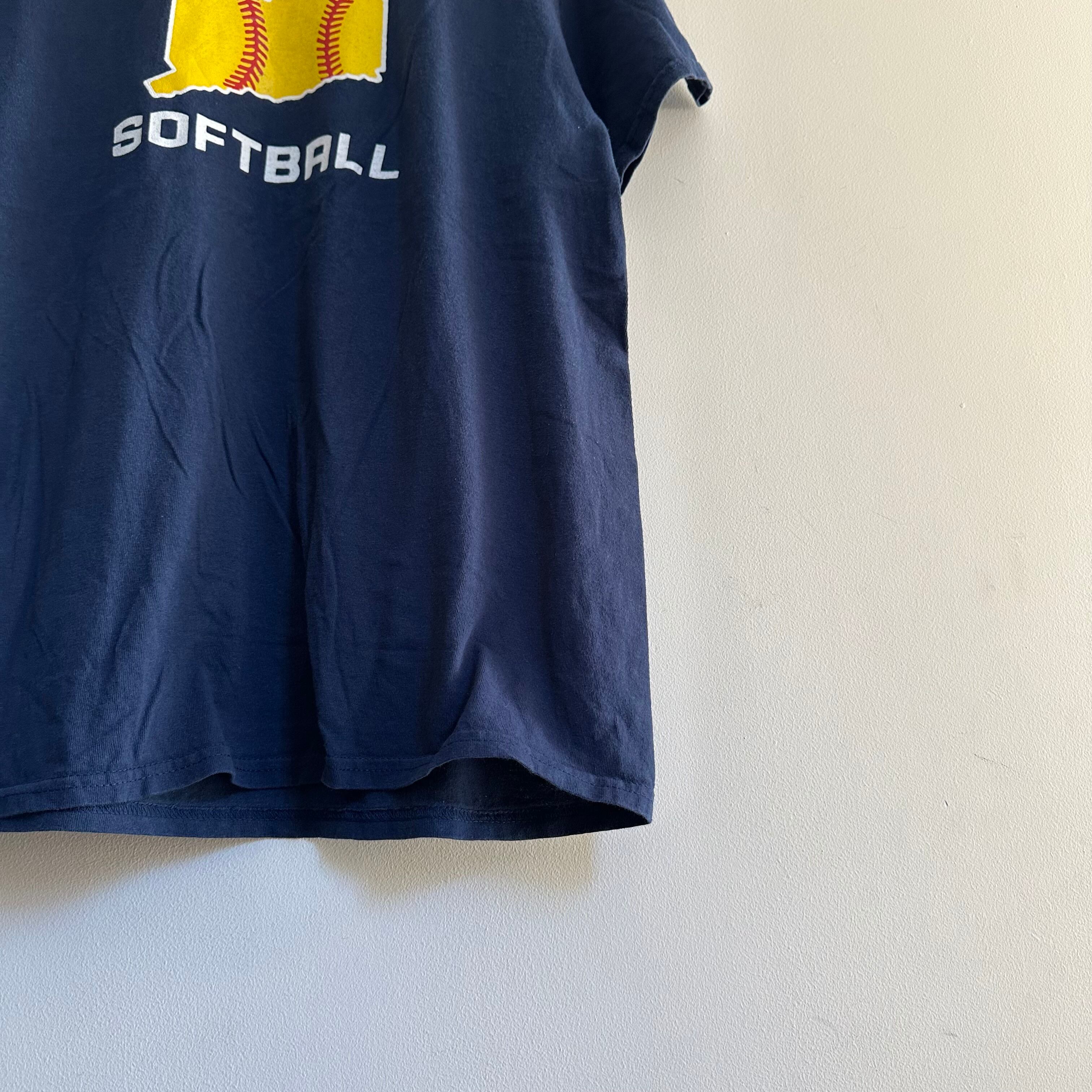 プリントTです。野球と思いきやソフトボール。色褪せ気味のネイビーに、プリントのバランスも良いですね。お好きな方、いかがでしょうか。