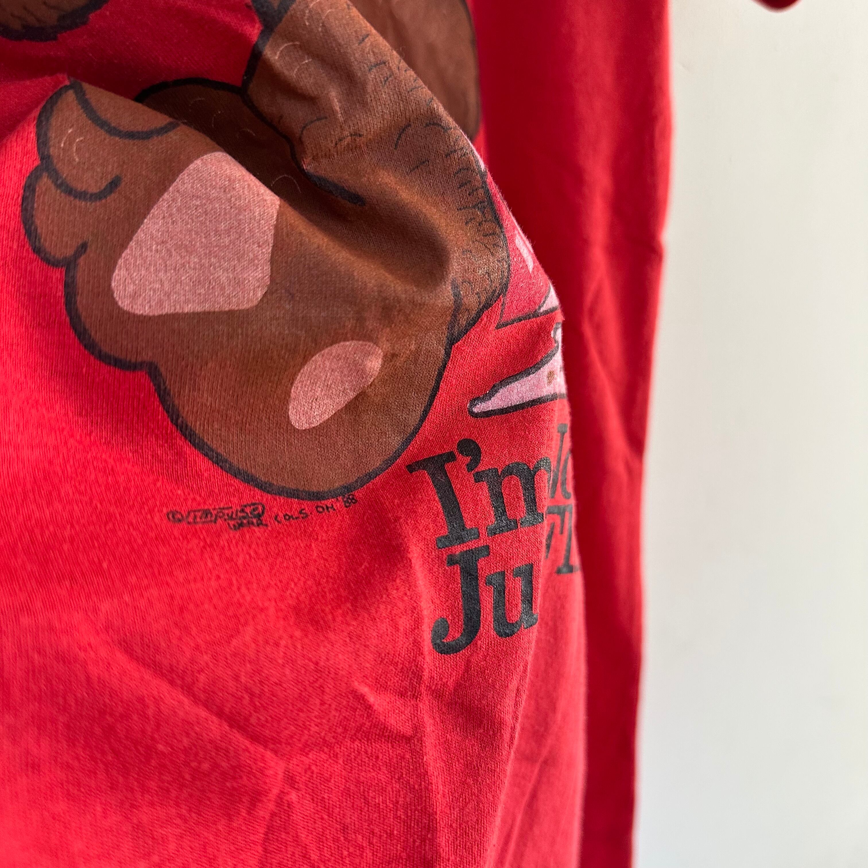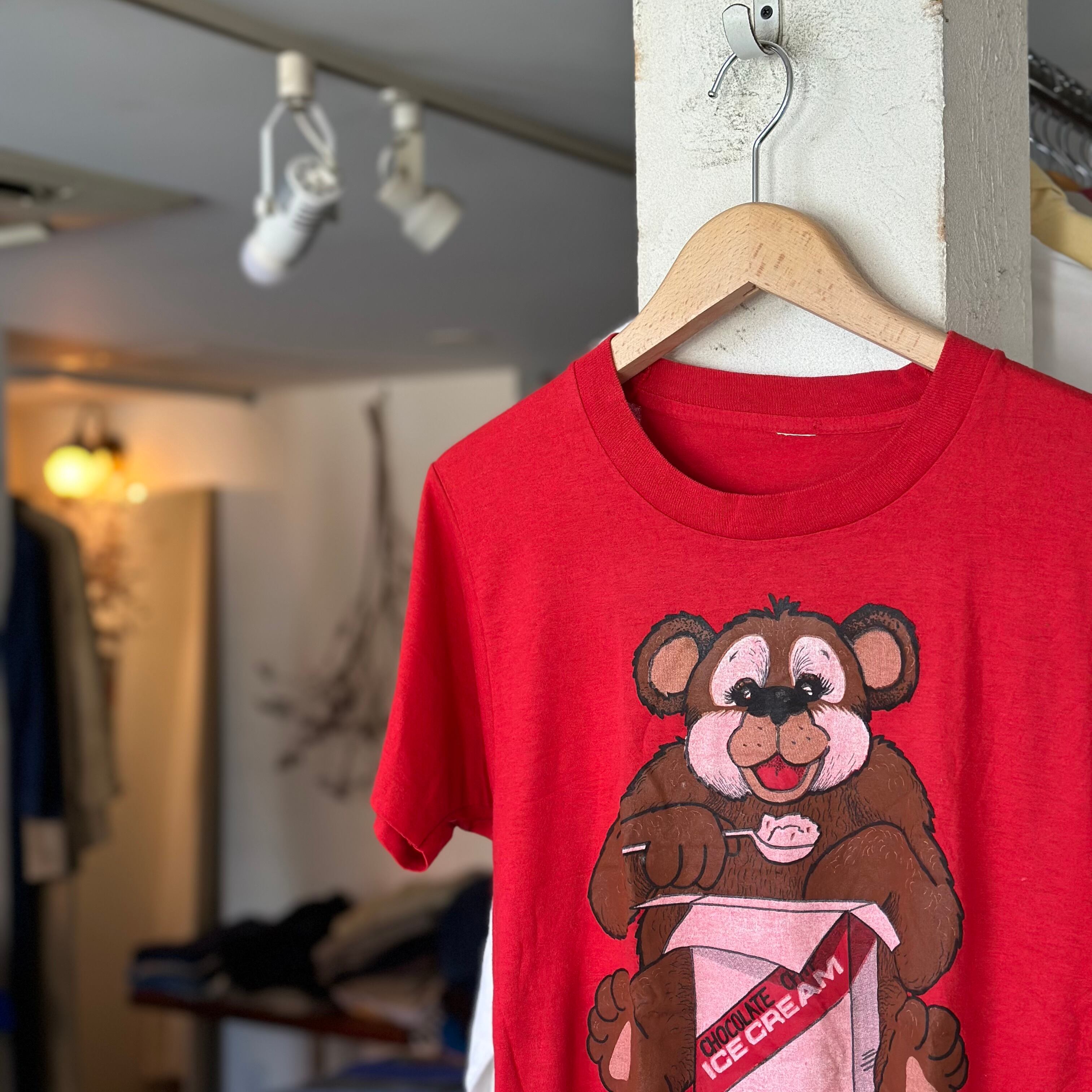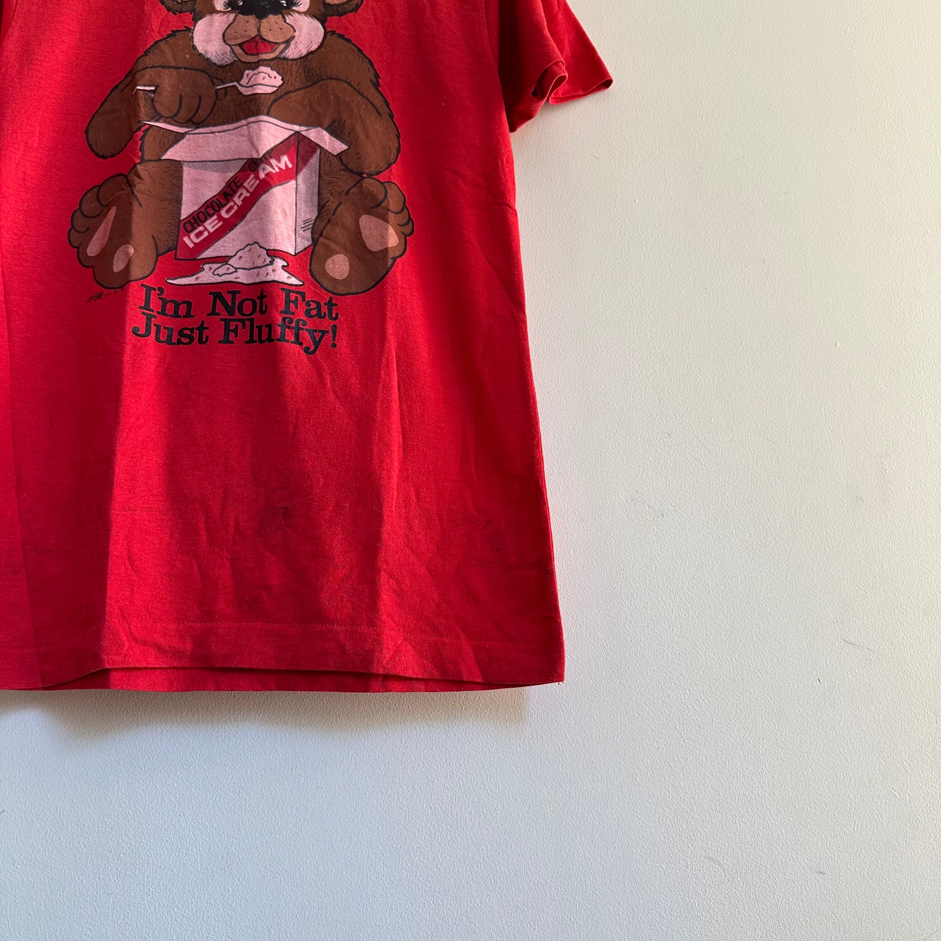 プリントTです。oldボディに可愛い熊。チョコチップアイス食べながら、『太ってないよ。フワフワしてるだけ』って書いてます。可愛いです。お好きな方、いかがでしょうか。