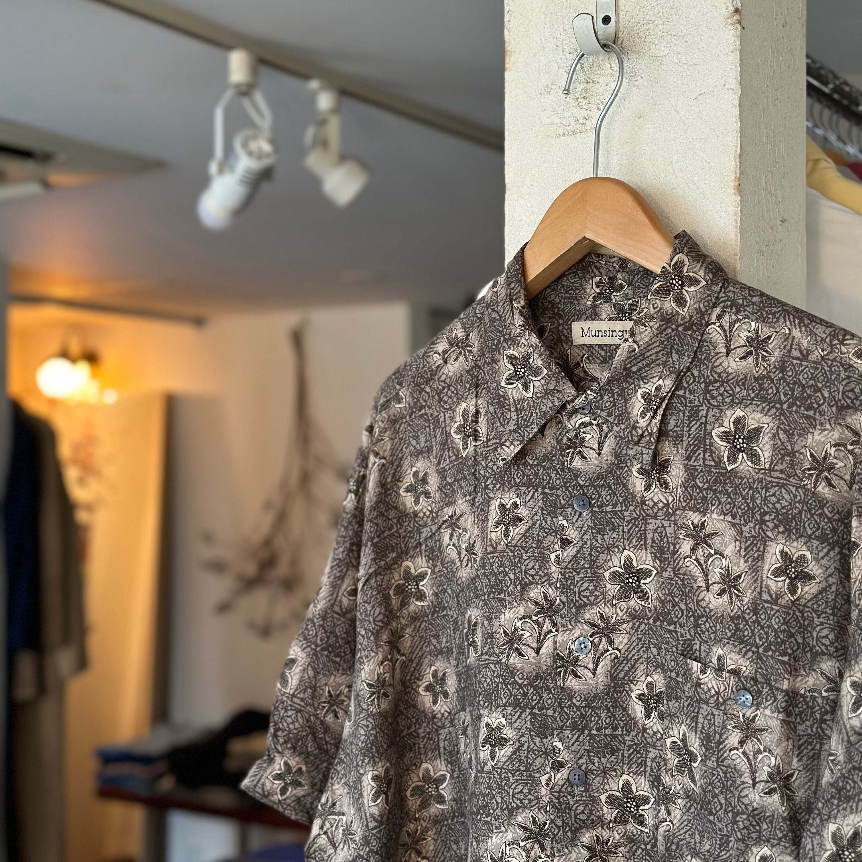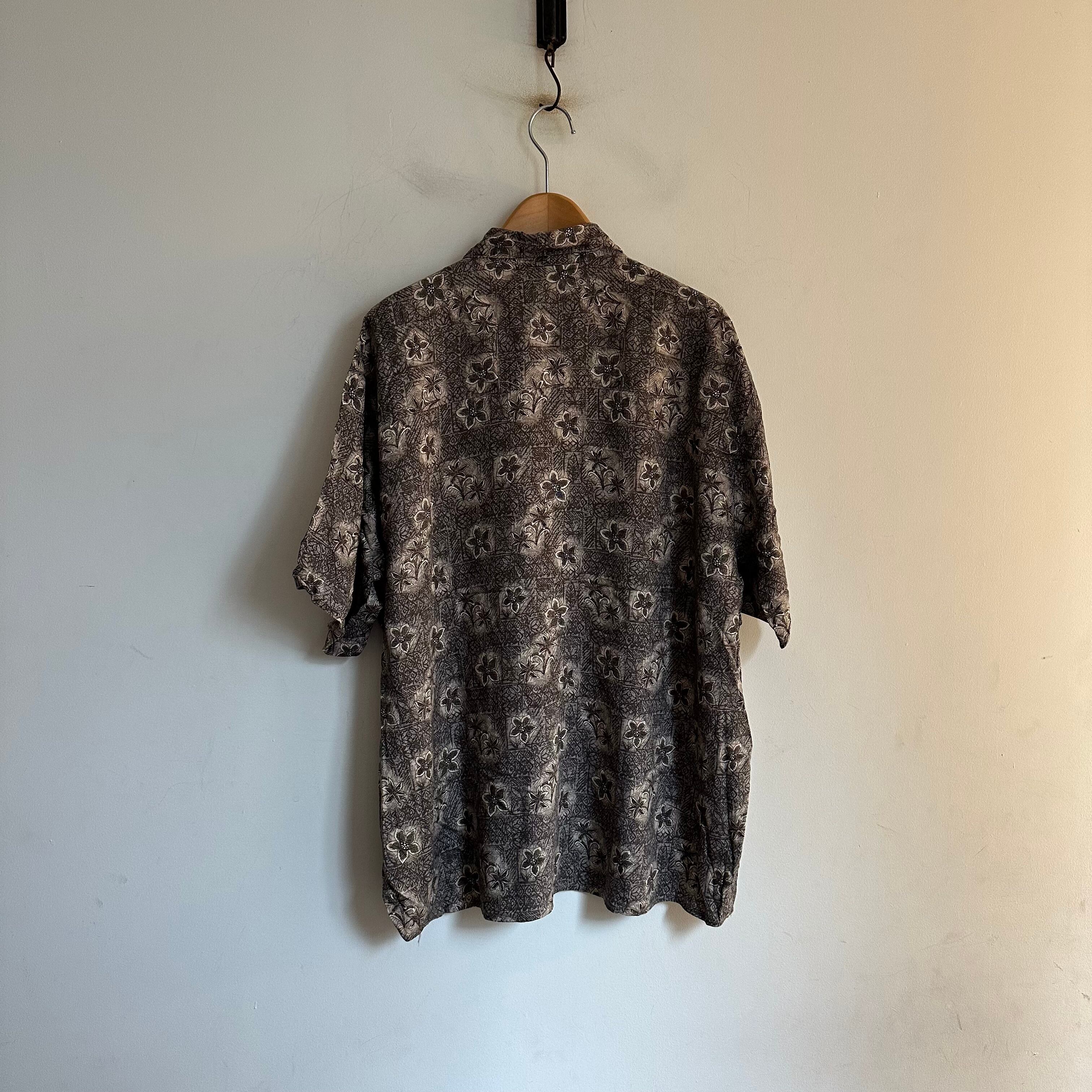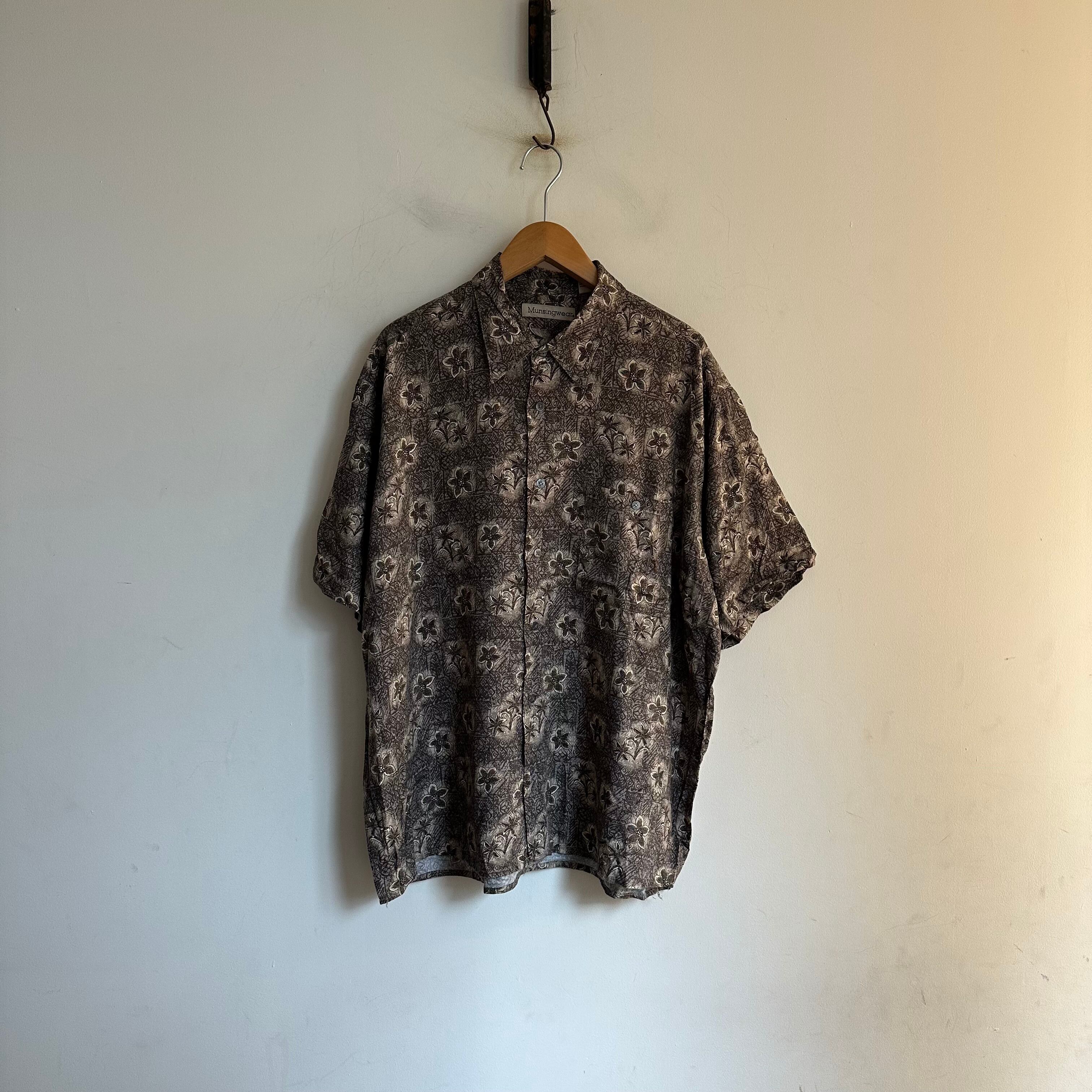 半袖シャツです。rayon100%生地。ブラウンベースの柄がカッコいいですね。たっぷりの身幅を生かしたシルエットで。ロンTと重ね着とかも良さそうです。お好きな方、いかがでしょうか。