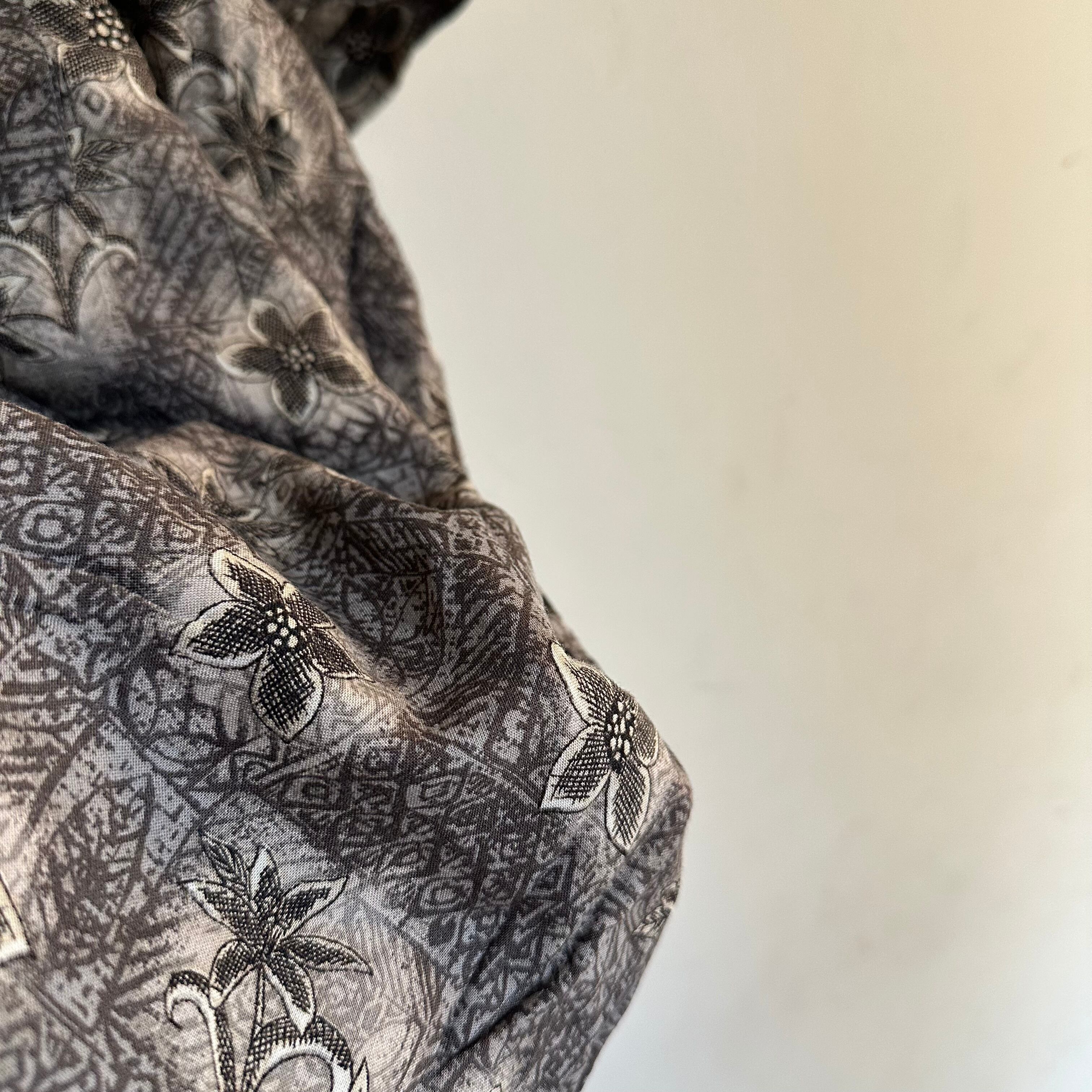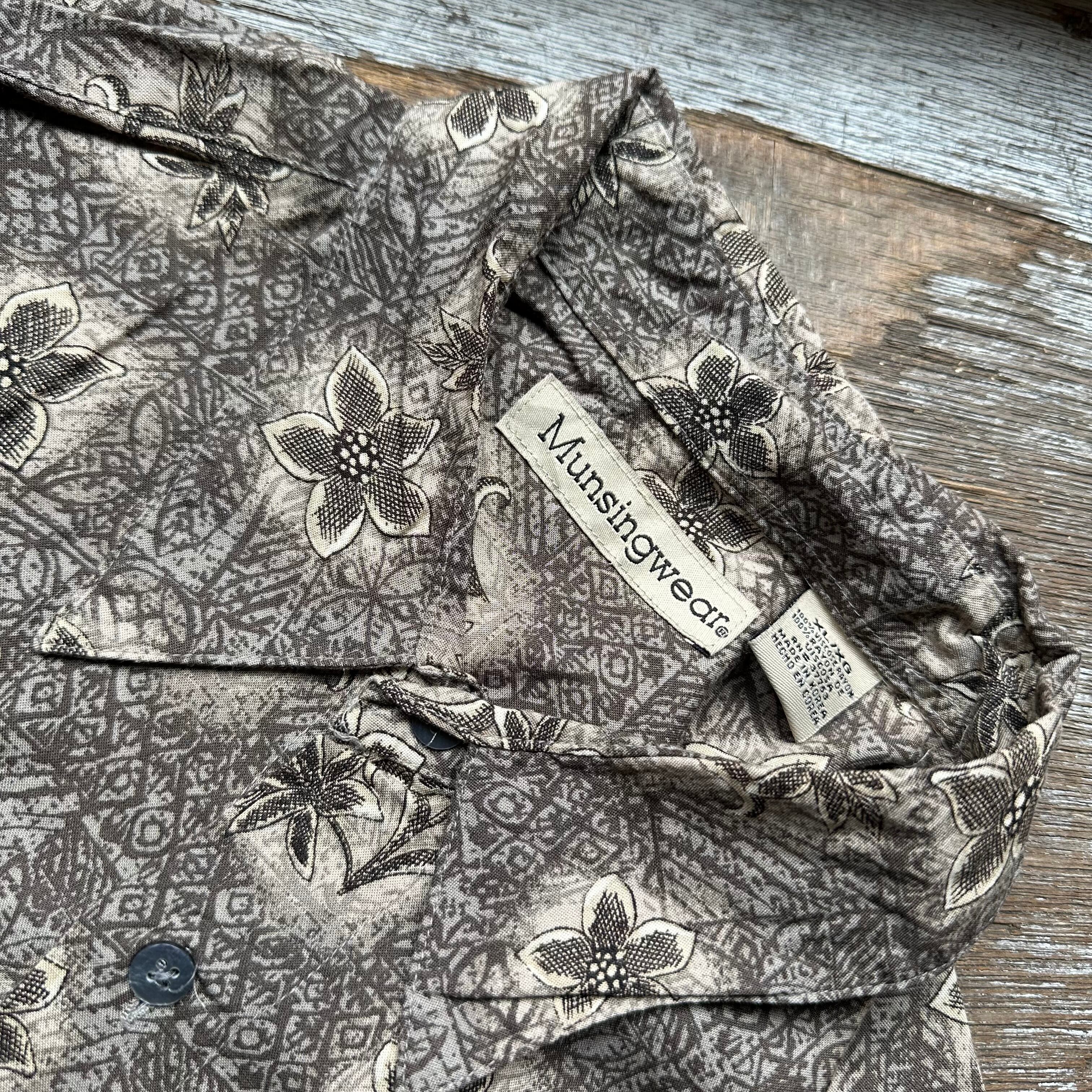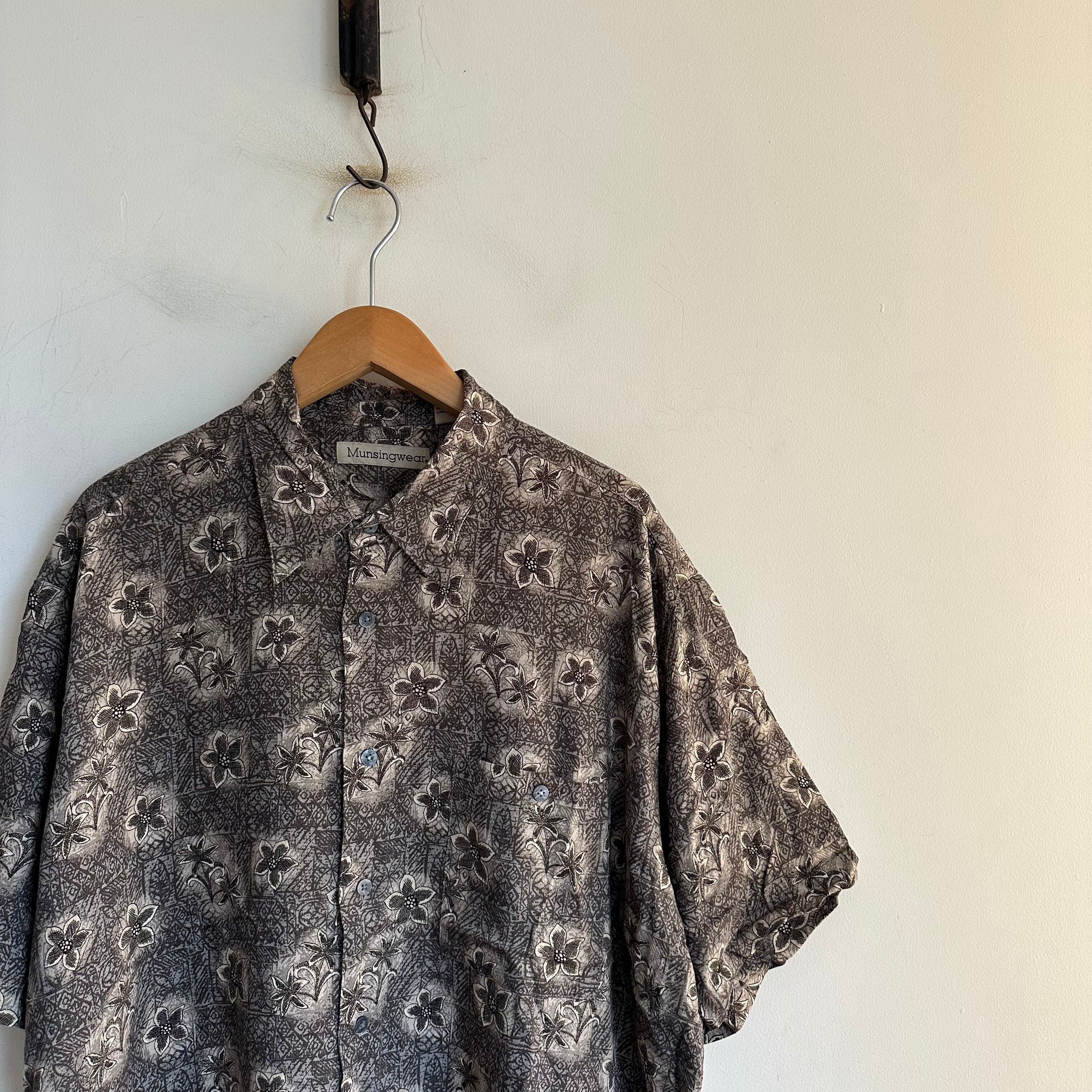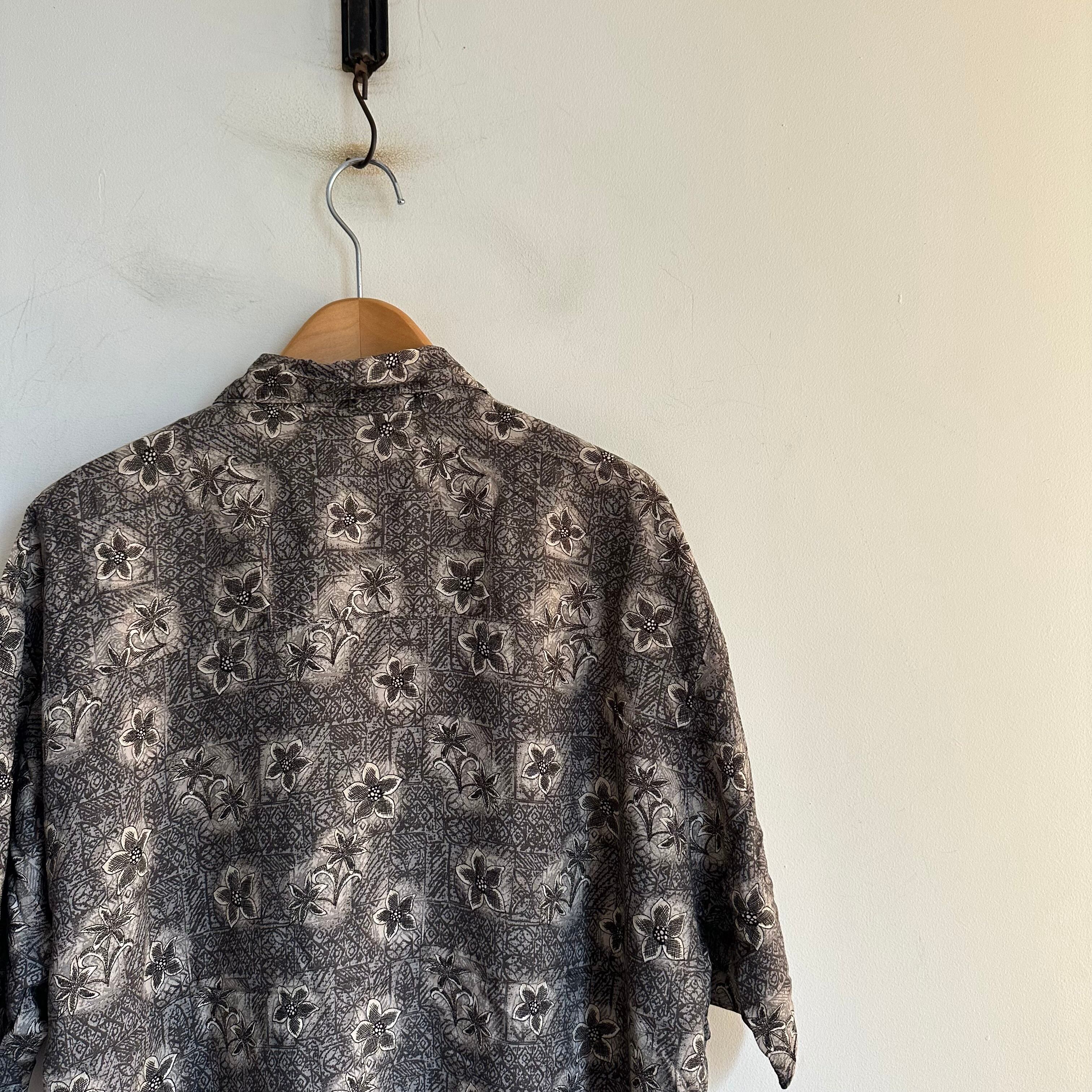 半袖シャツです。rayon100%生地。ブラウンベースの柄がカッコいいですね。たっぷりの身幅を生かしたシルエットで。ロンTと重ね着とかも良さそうです。お好きな方、いかがでしょうか。