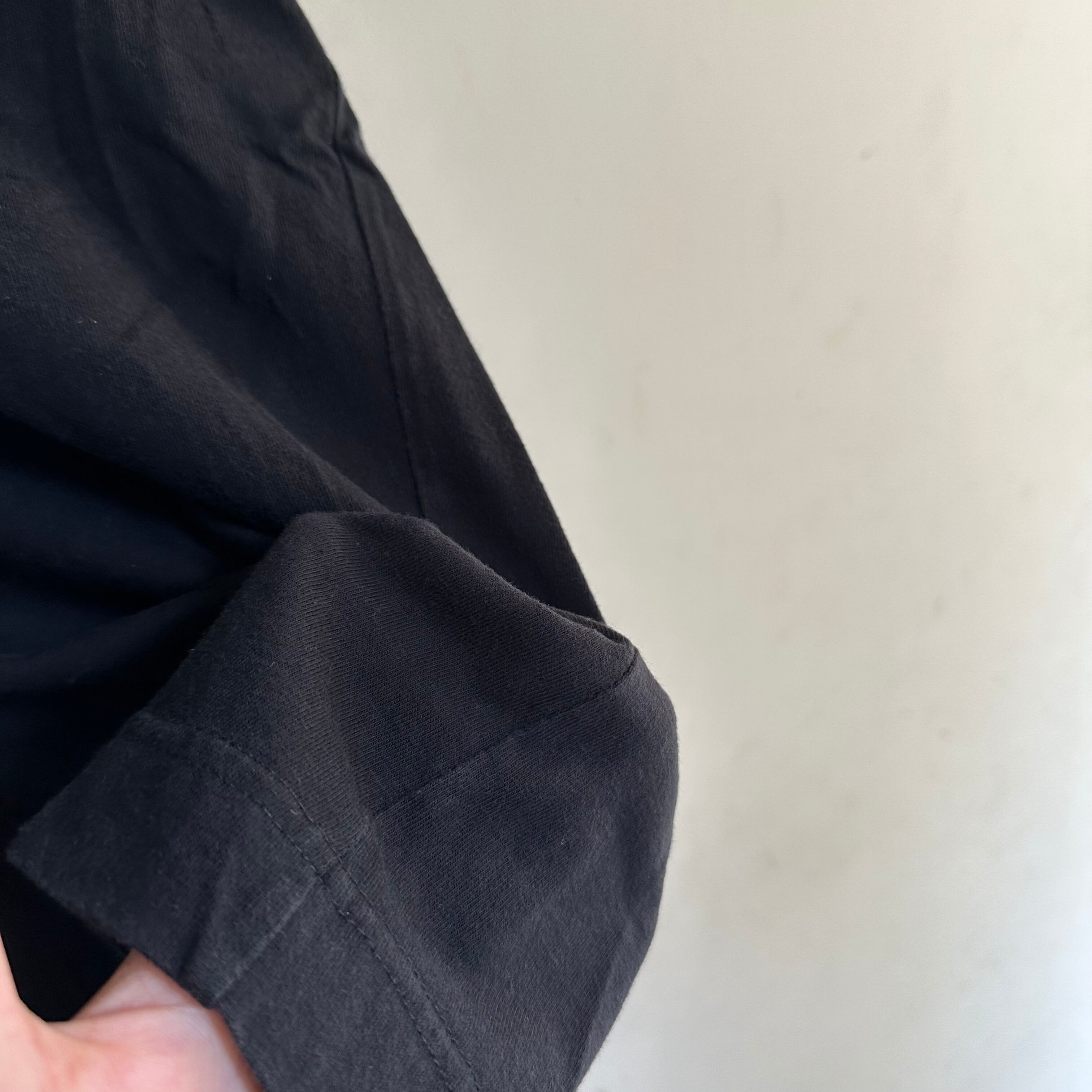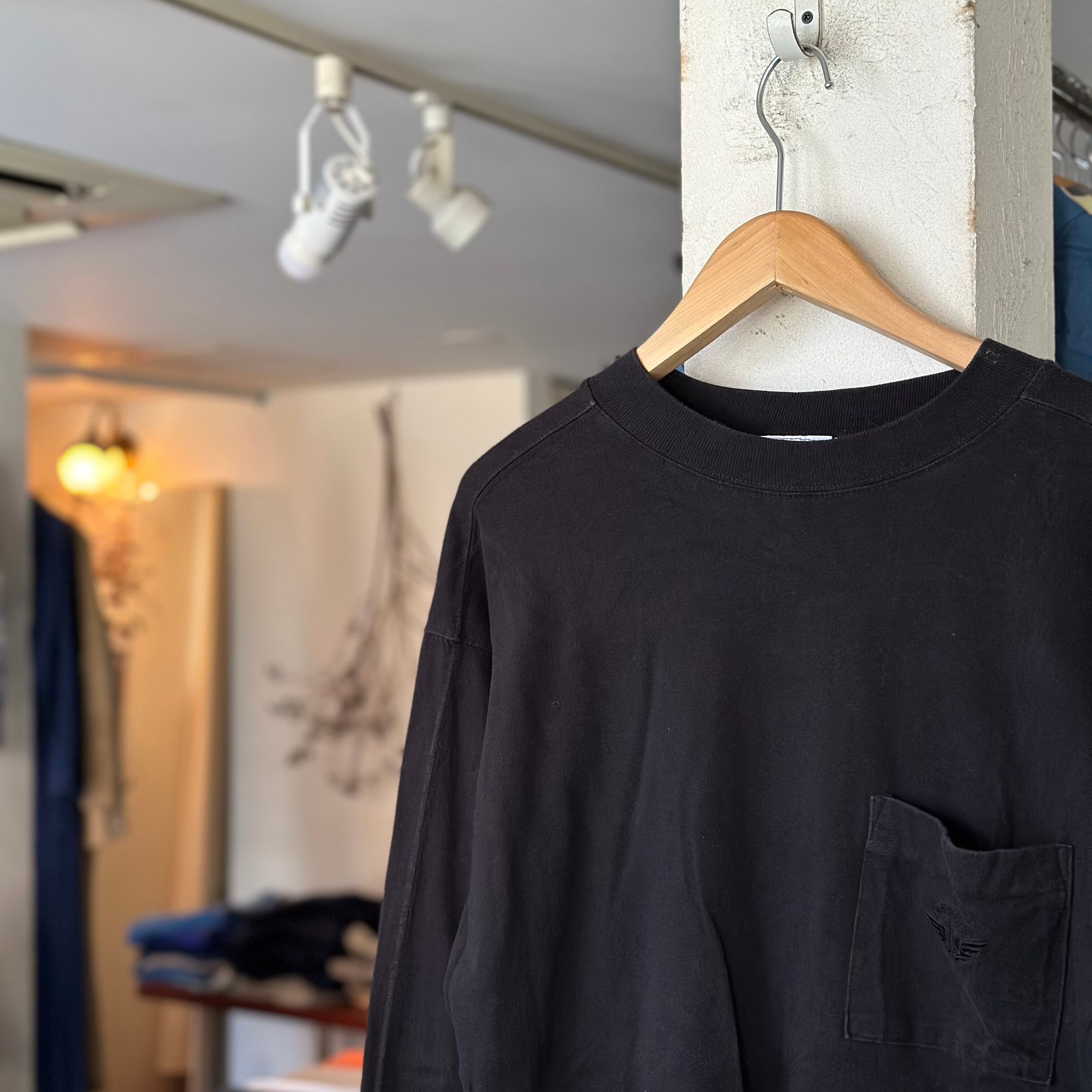 ロンTです。黒無地。ポケ付き。よく見るとカッティングが入っててカッコいいです。お好きな方、いかがでしょうか。
