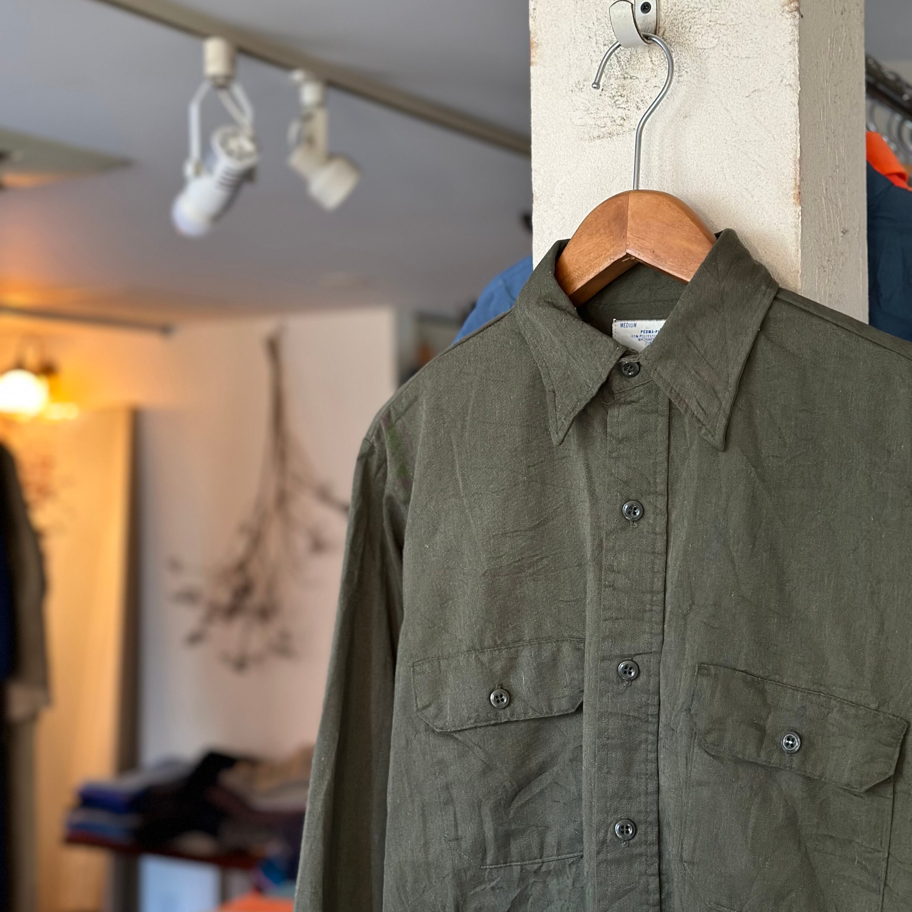 searsのワークシャツです。少しシャリ感のあるoldの綿ポリ生地。そこまで細身すぎず、ギリギリ気の利いた感じ。なんて事ないこの辺もグッと見かけなくなりそうです。お好きな方、いかがでしょうか。