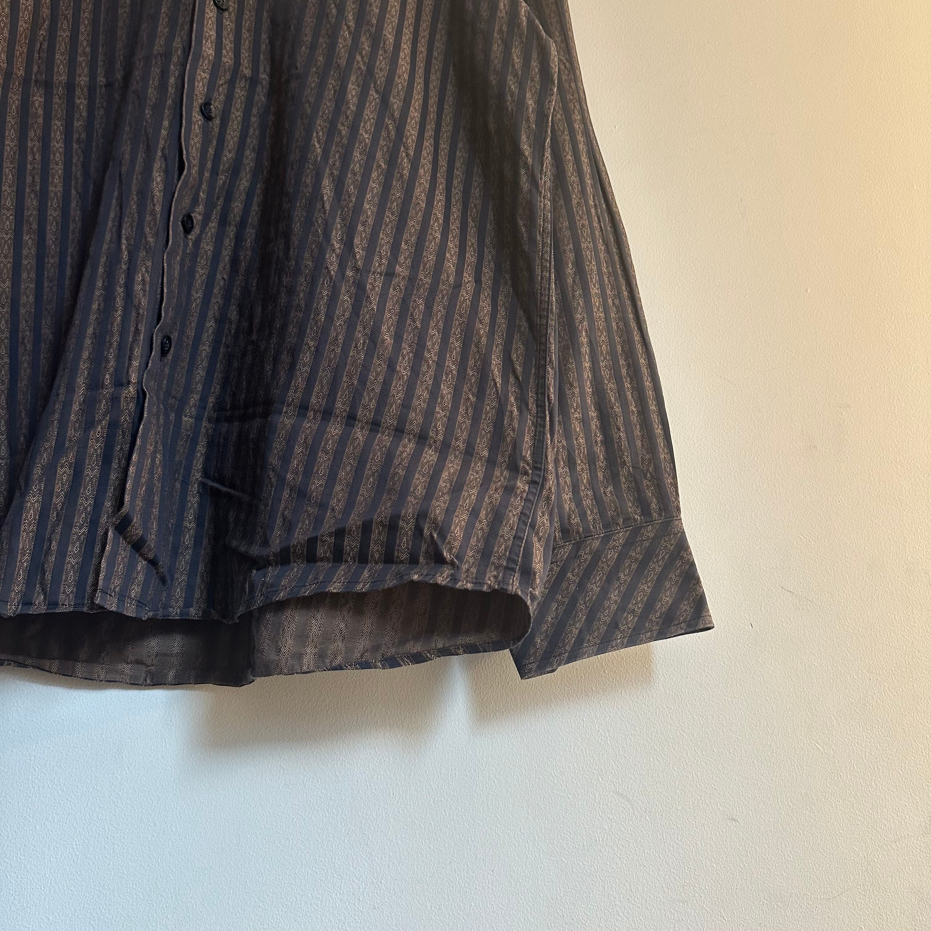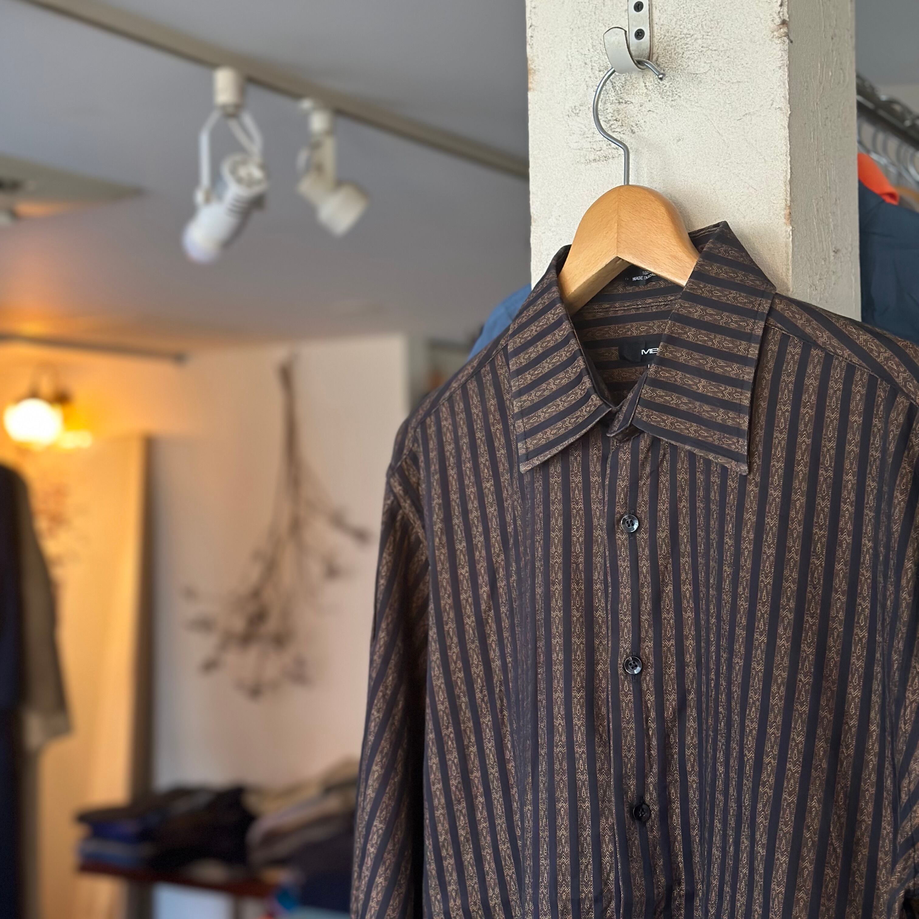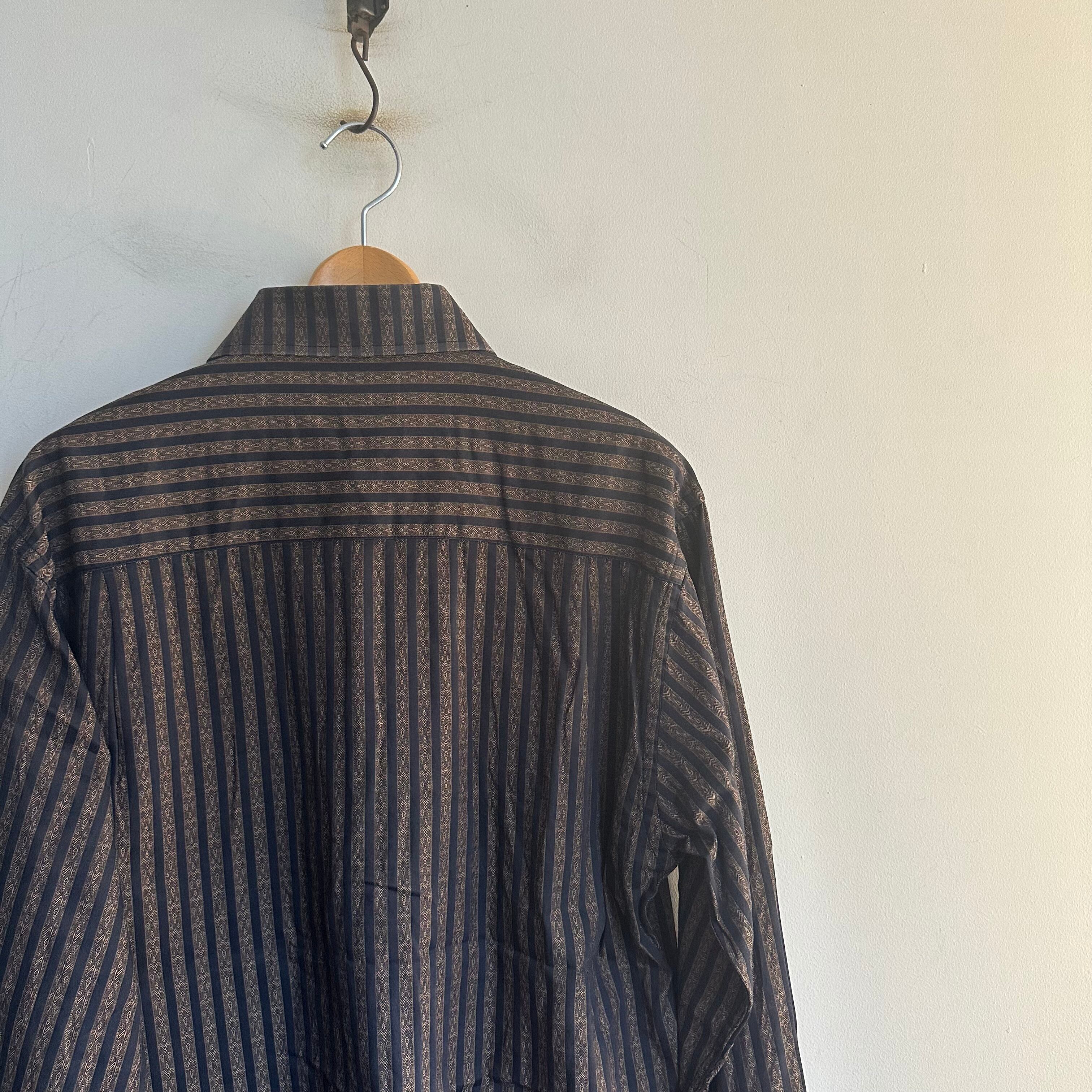 ロングスリーブシャツです。ブラウン×ブラックのストライプに細かい柄。光沢感のある生地感。強そうな雰囲気。お好きな方、いかがでしょうか。