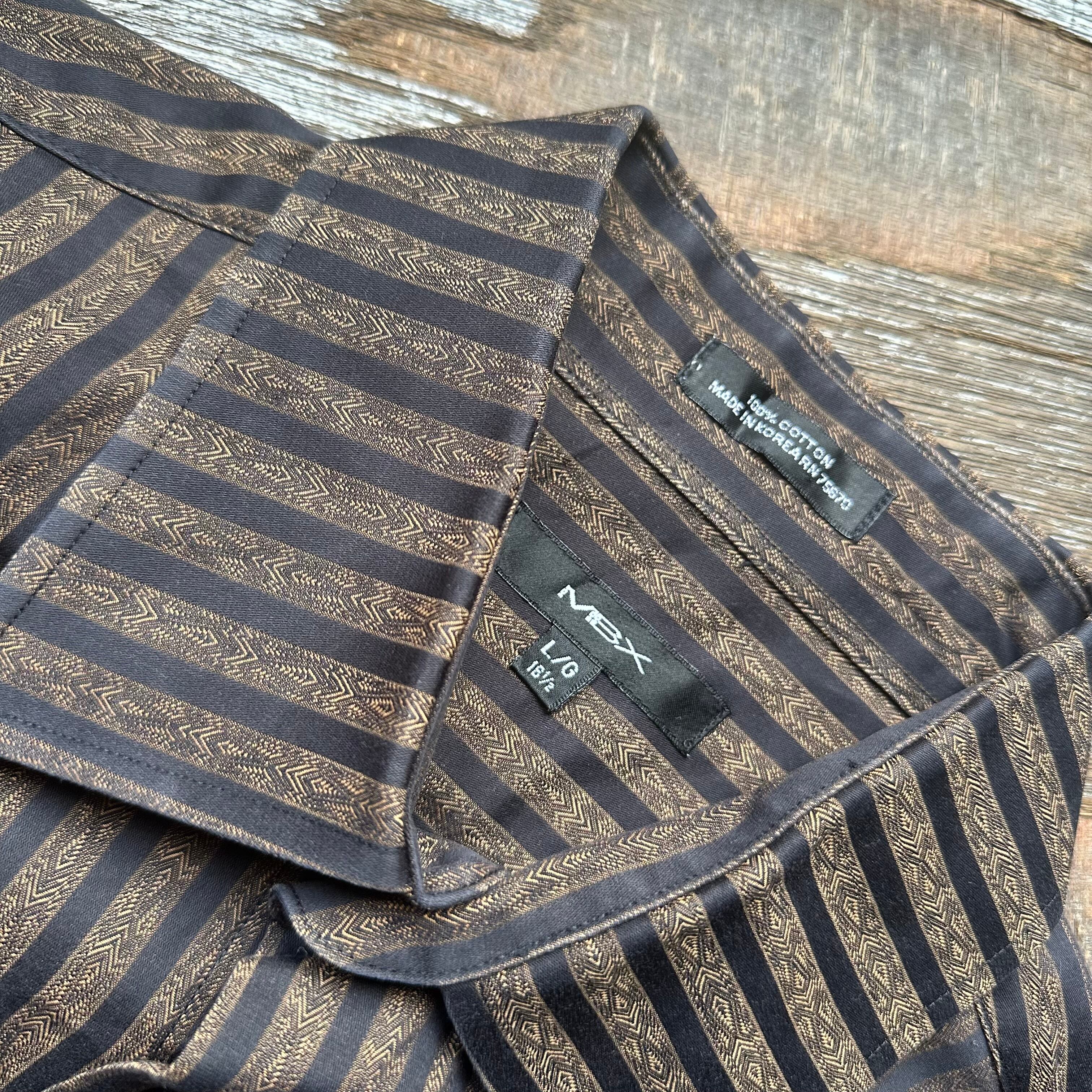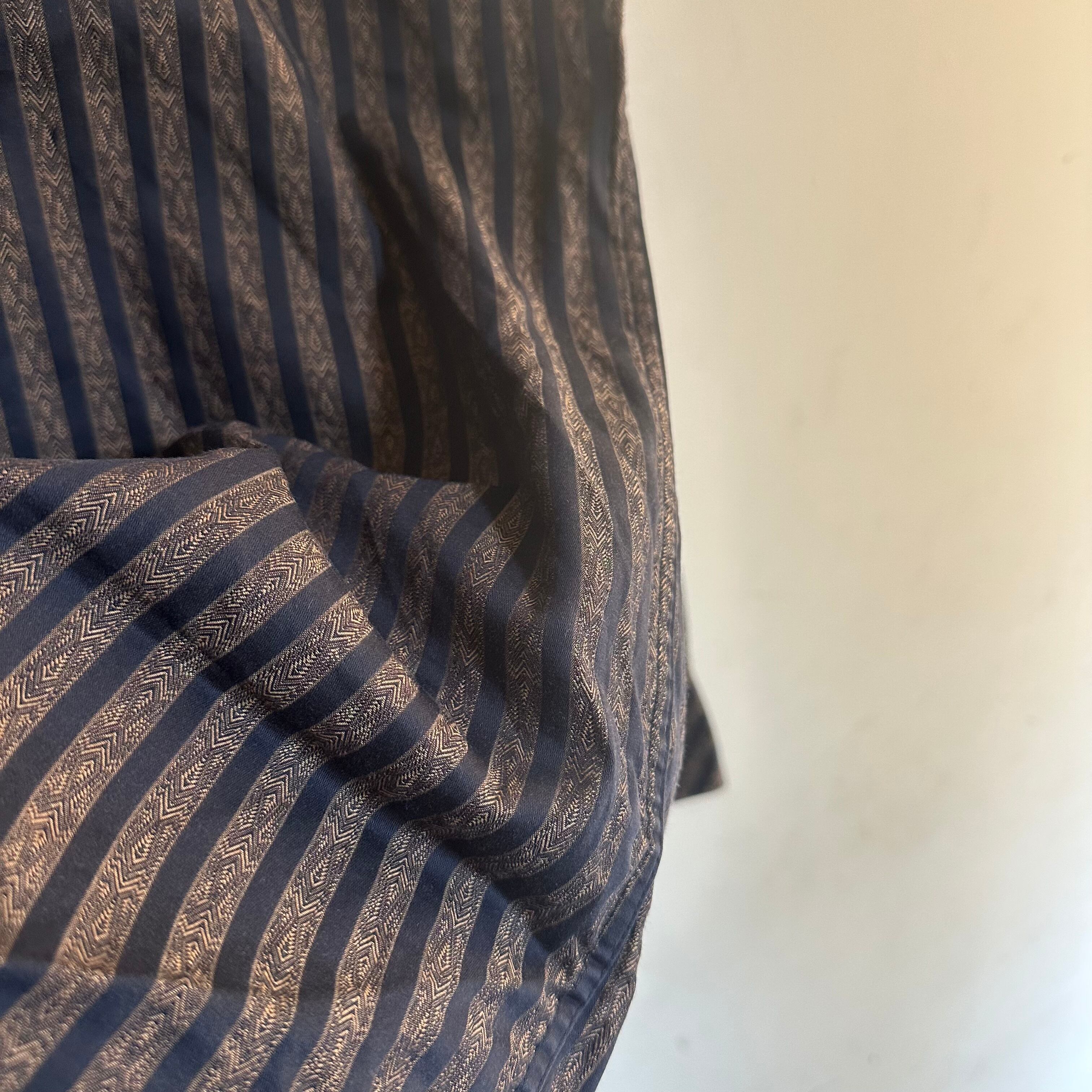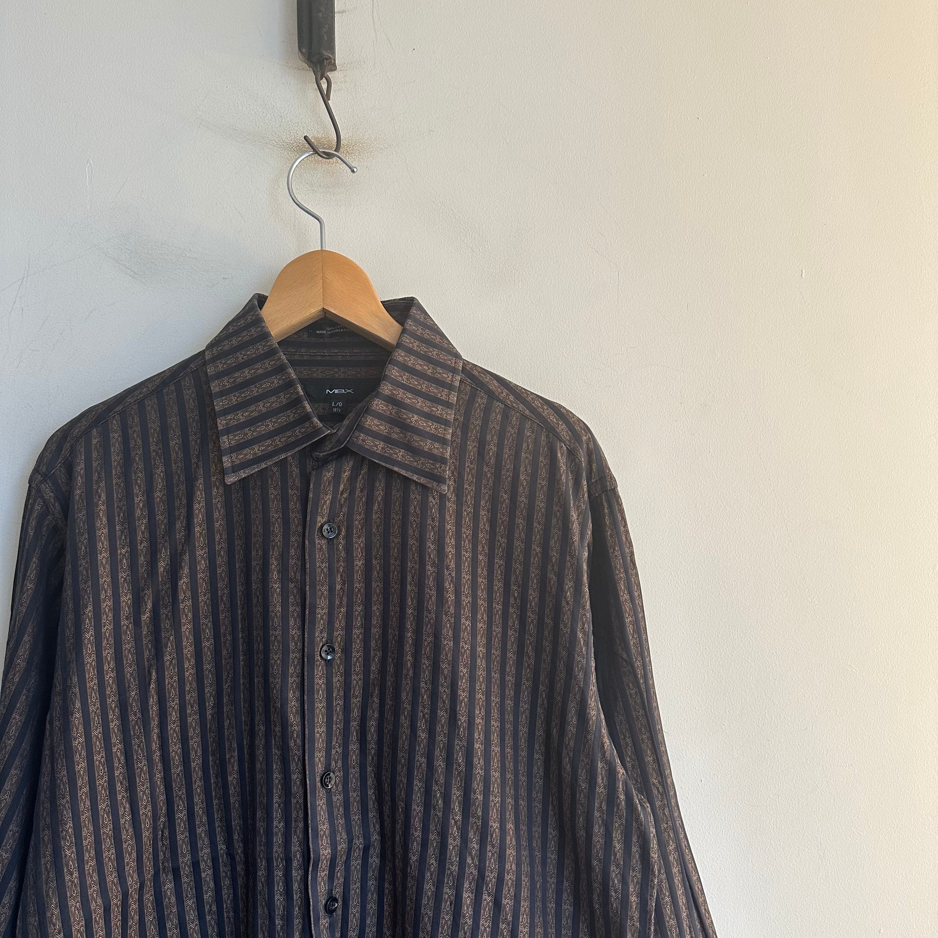 ロングスリーブシャツです。ブラウン×ブラックのストライプに細かい柄。光沢感のある生地感。強そうな雰囲気。お好きな方、いかがでしょうか。