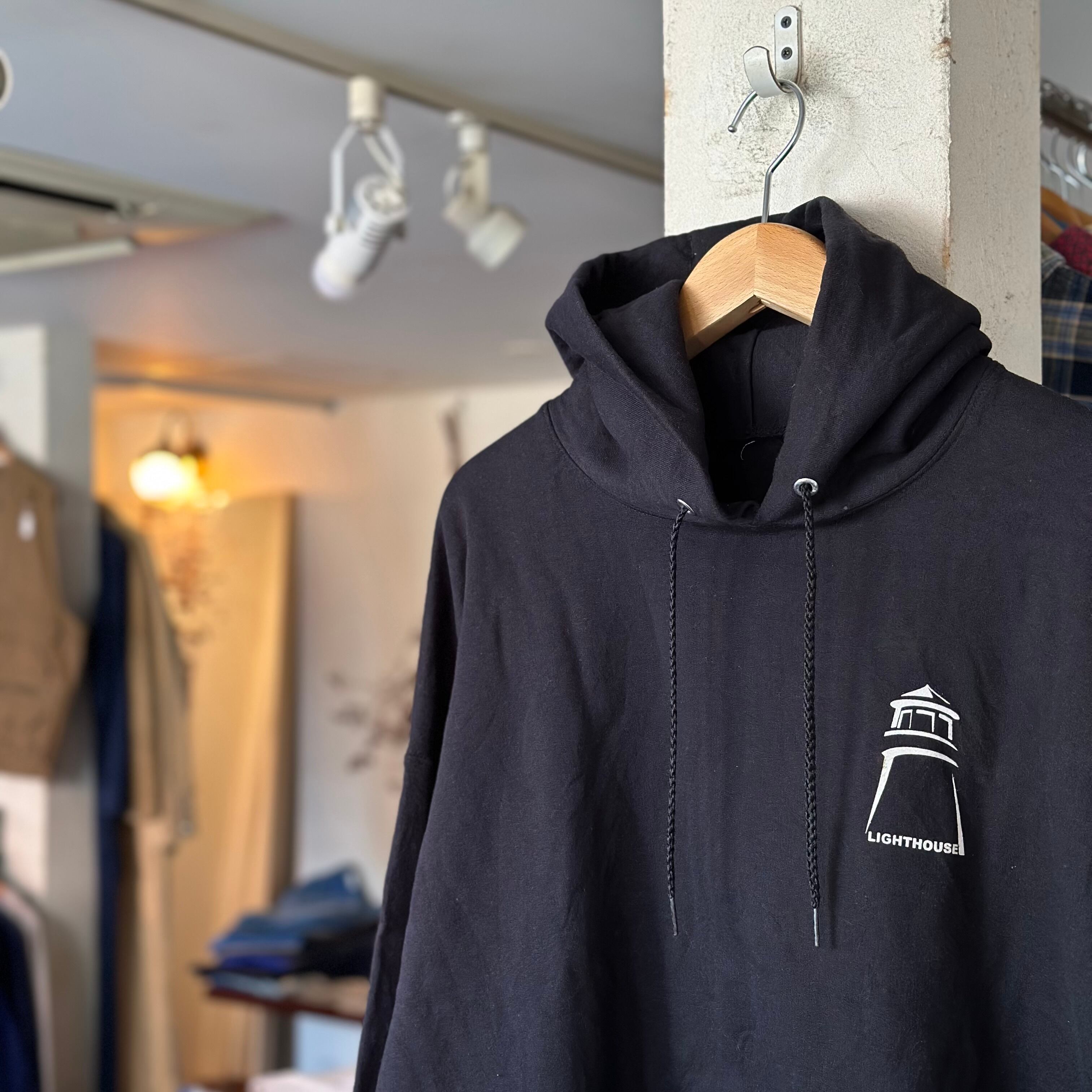 スウェットです。黒のフード。胸ワンポイント。灯台。さらっと。良いですね。お好きな方、いかがでしょうか。