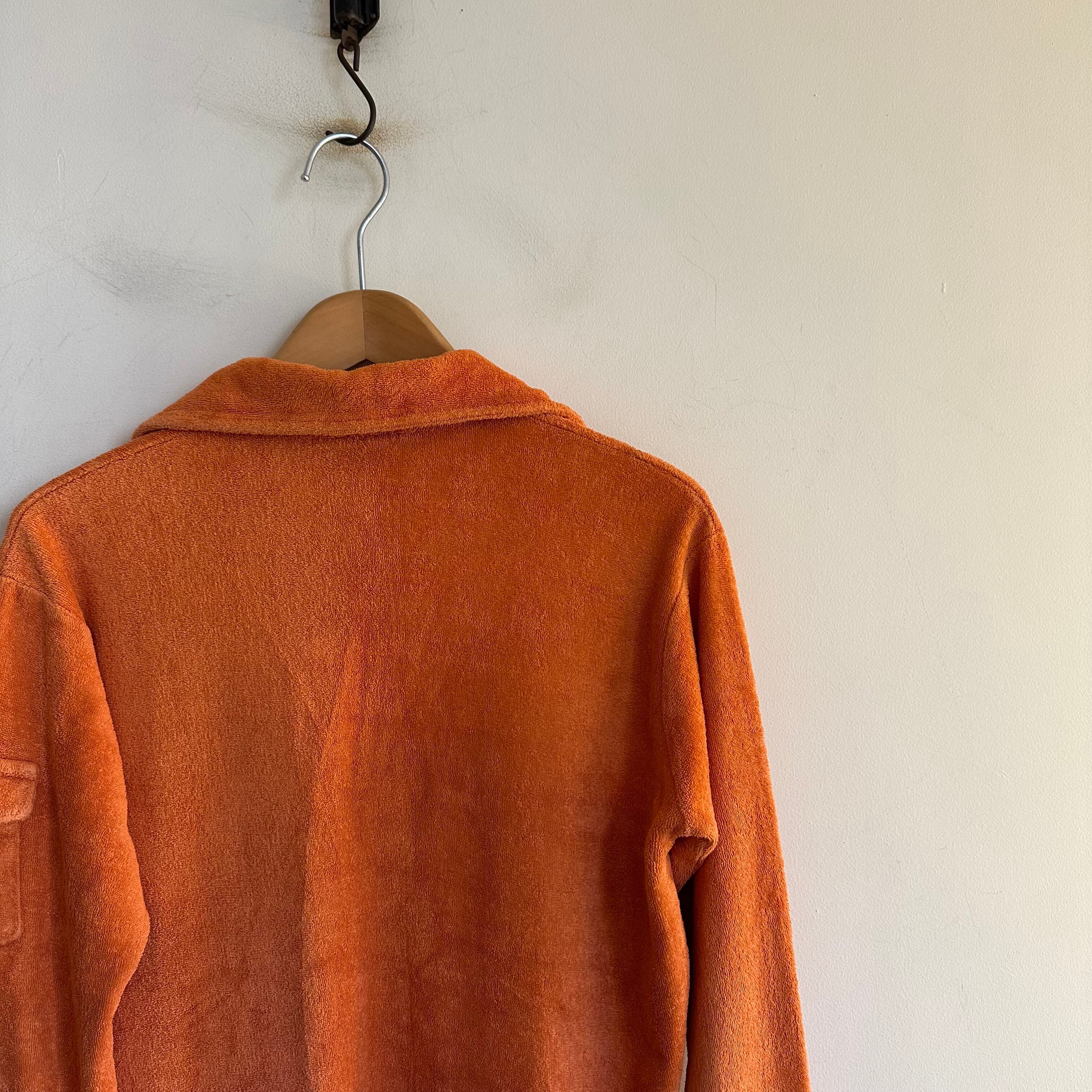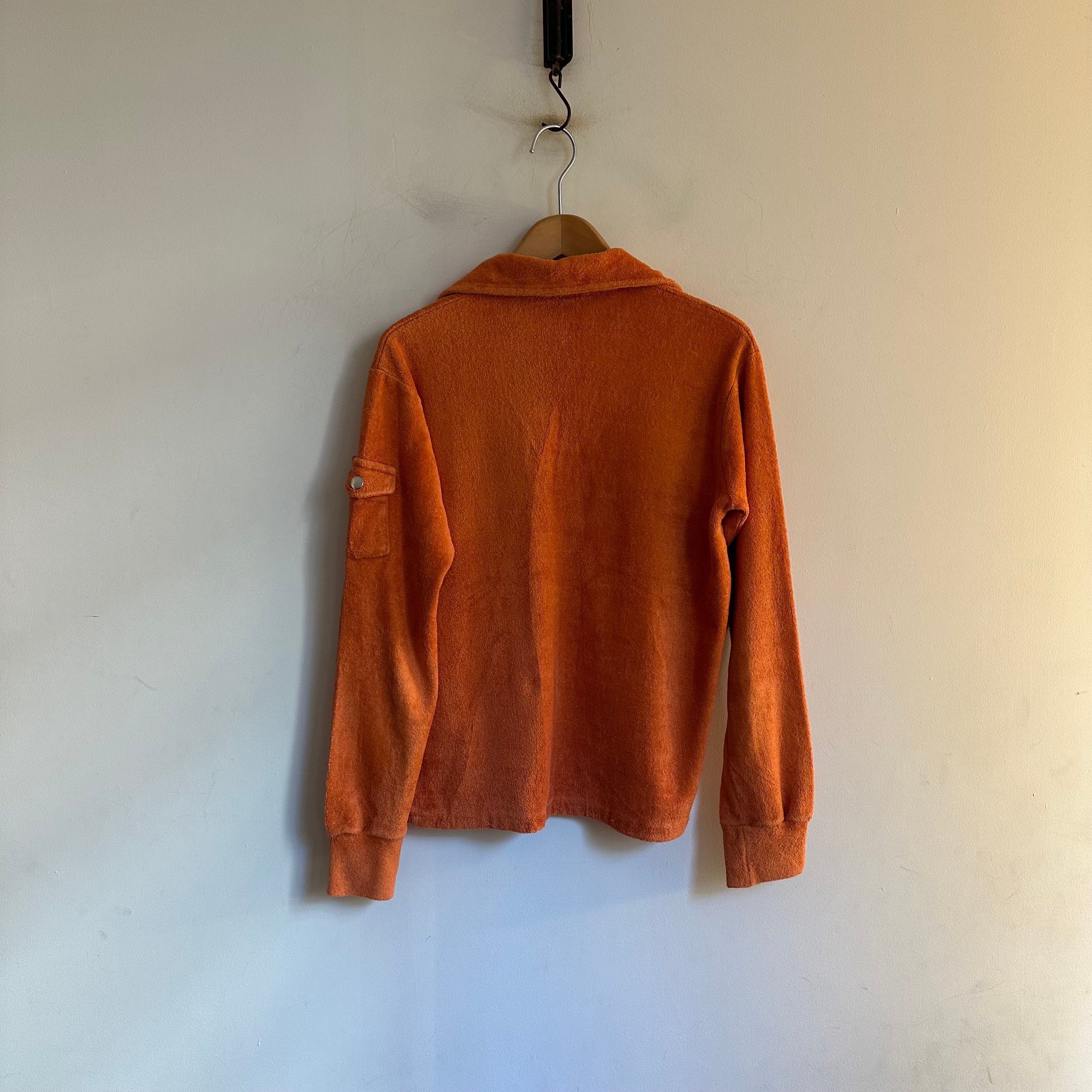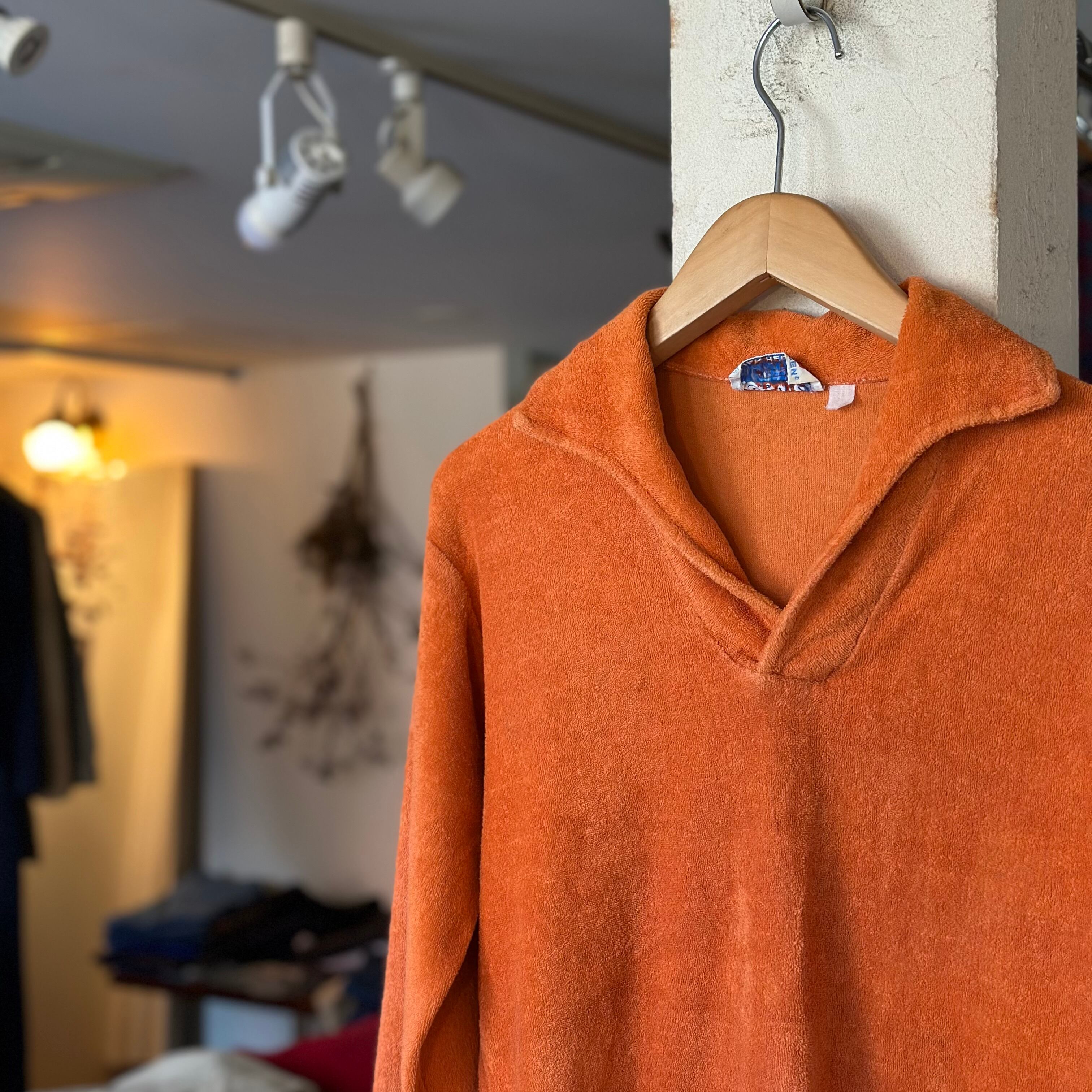 70sのカットソーです。パイル地。マットなトーンのオレンジとワイドな首元が可愛いです。サイズ小さめお探しの方、女性の方にも、お好きな方、いかがでしょうか。