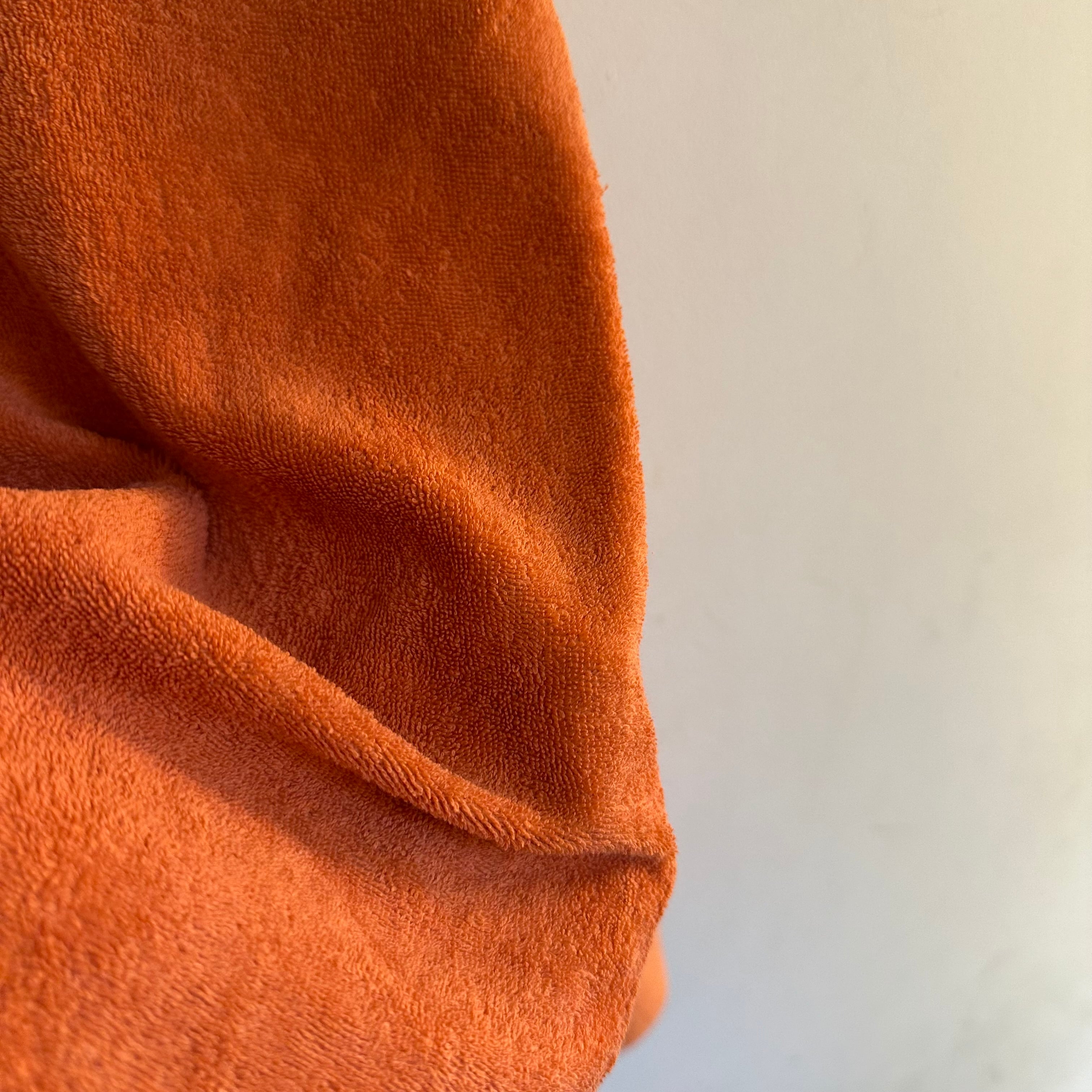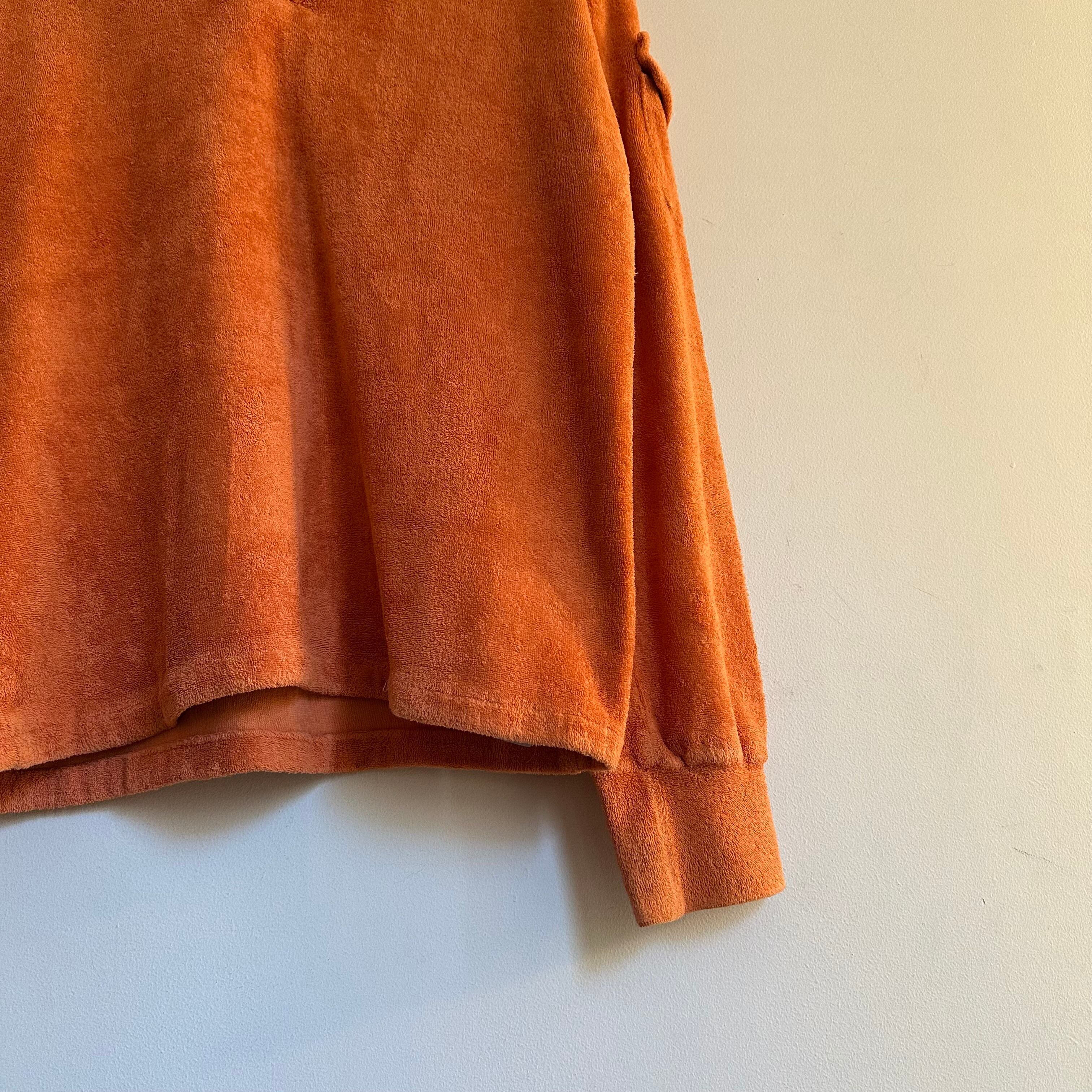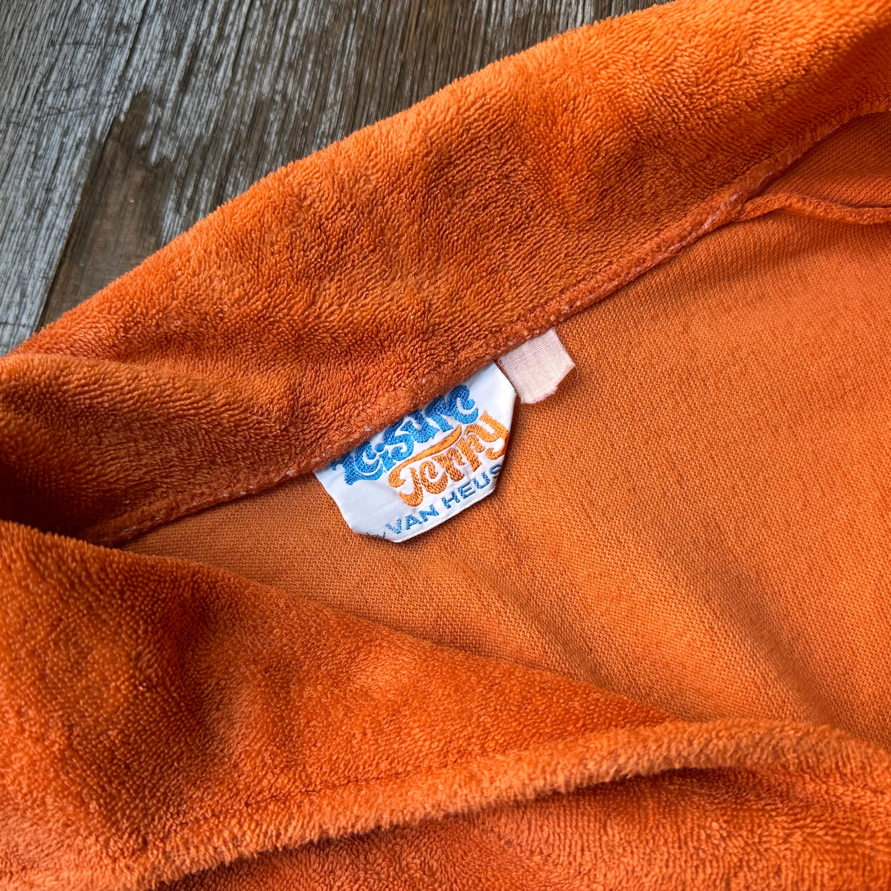 70sのカットソーです。パイル地。マットなトーンのオレンジとワイドな首元が可愛いです。サイズ小さめお探しの方、女性の方にも、お好きな方、いかがでしょうか。