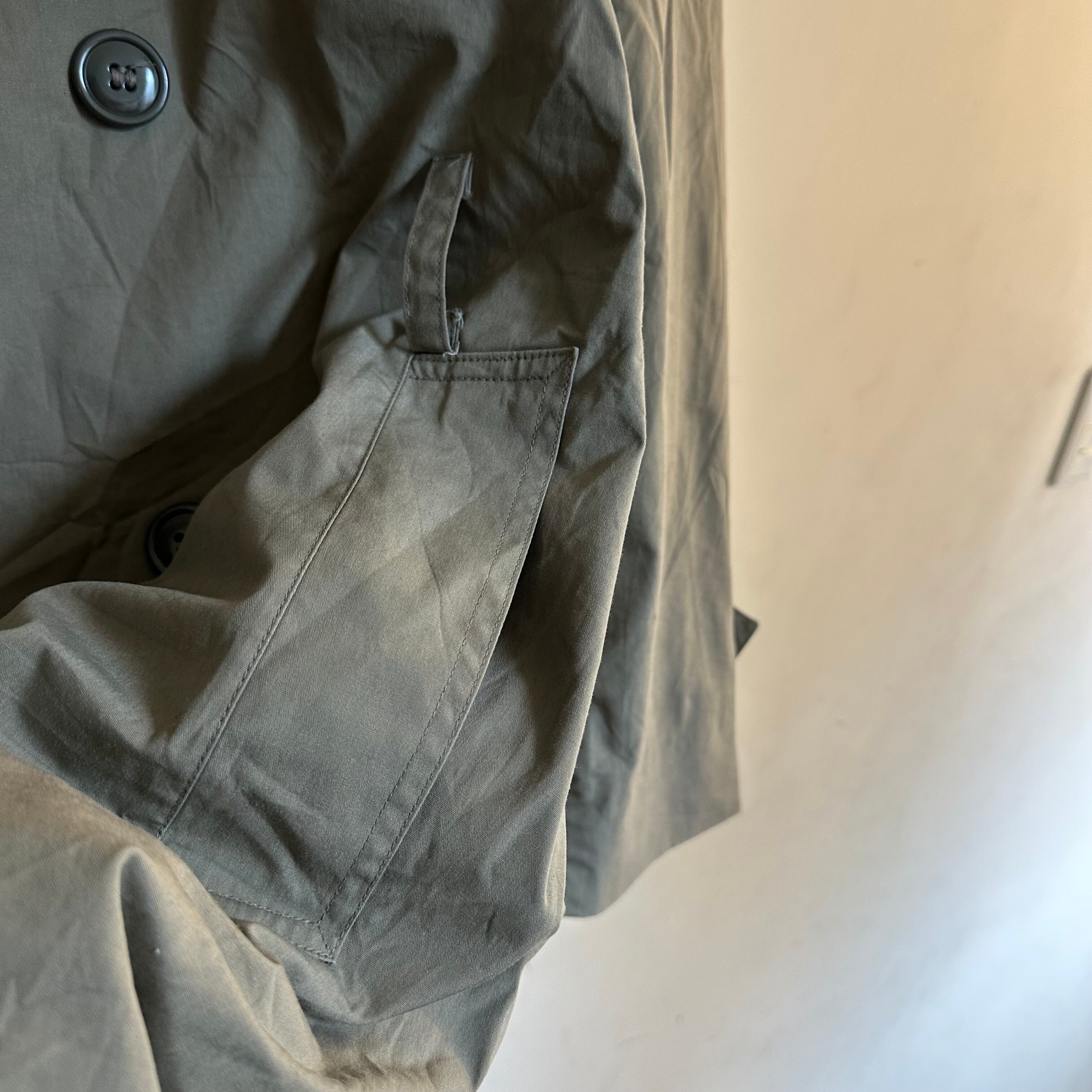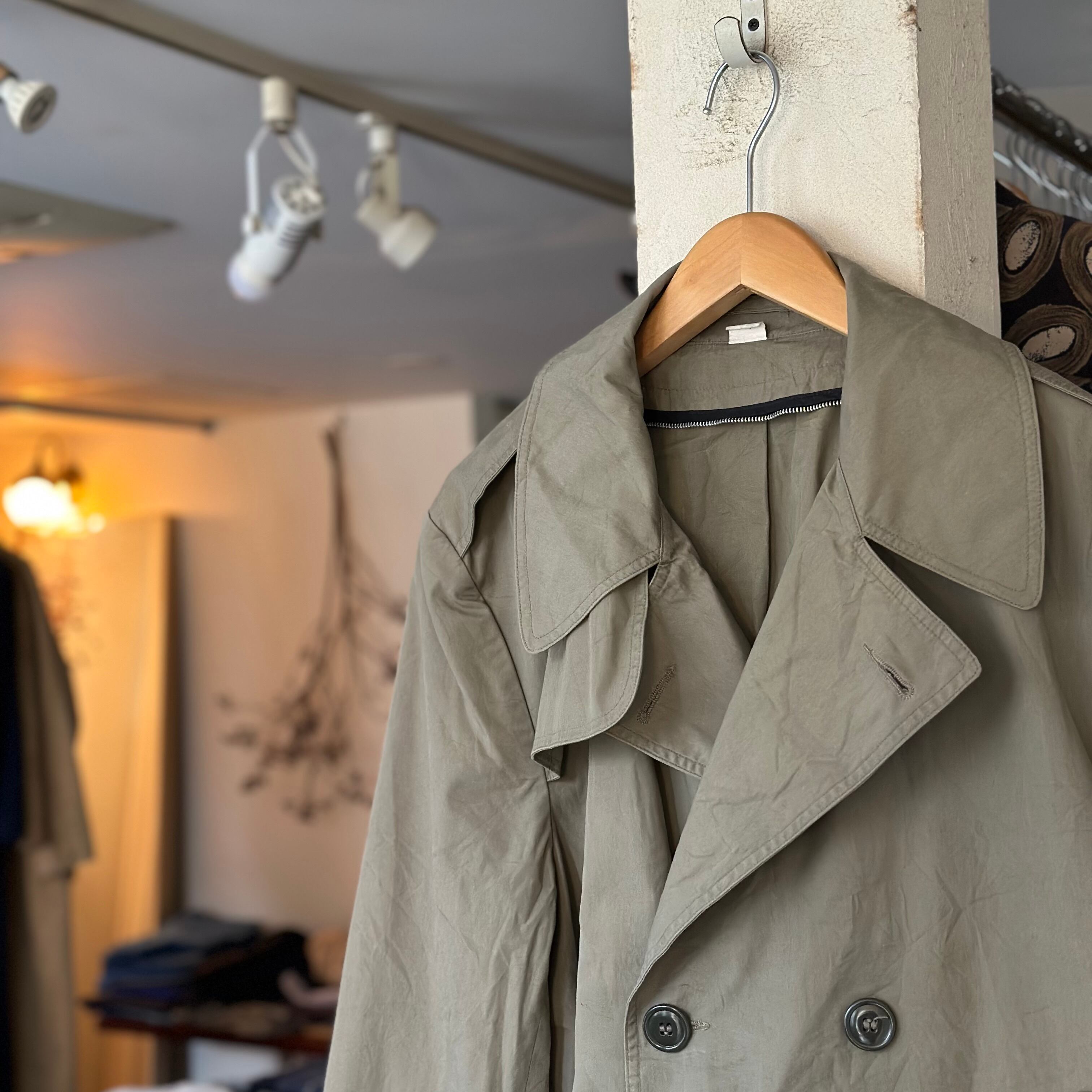 ミリタリーのトレンチコートです。1982年製。ベージュ寄りのカーキ。雰囲気ありますね。バサっと。お好きな方、いかがでしょうか。