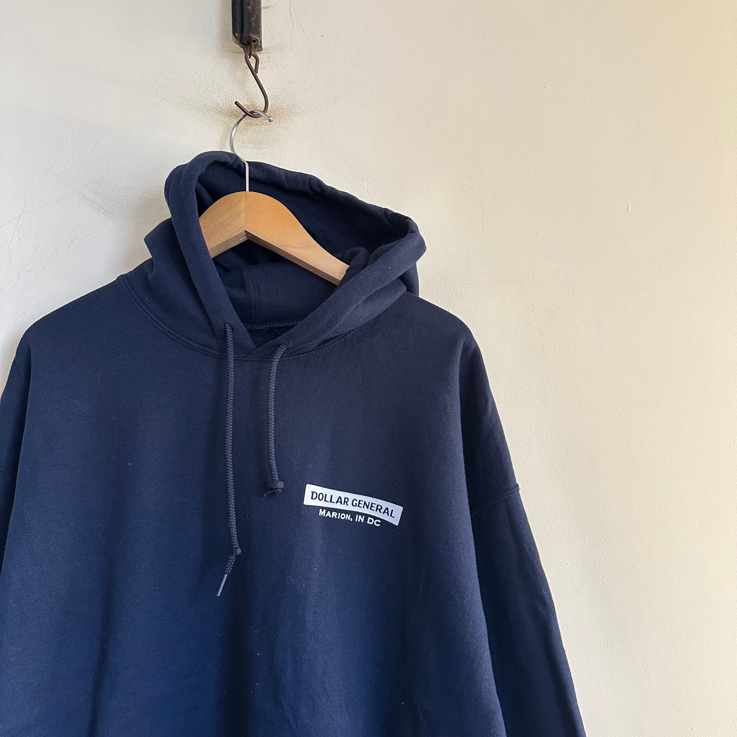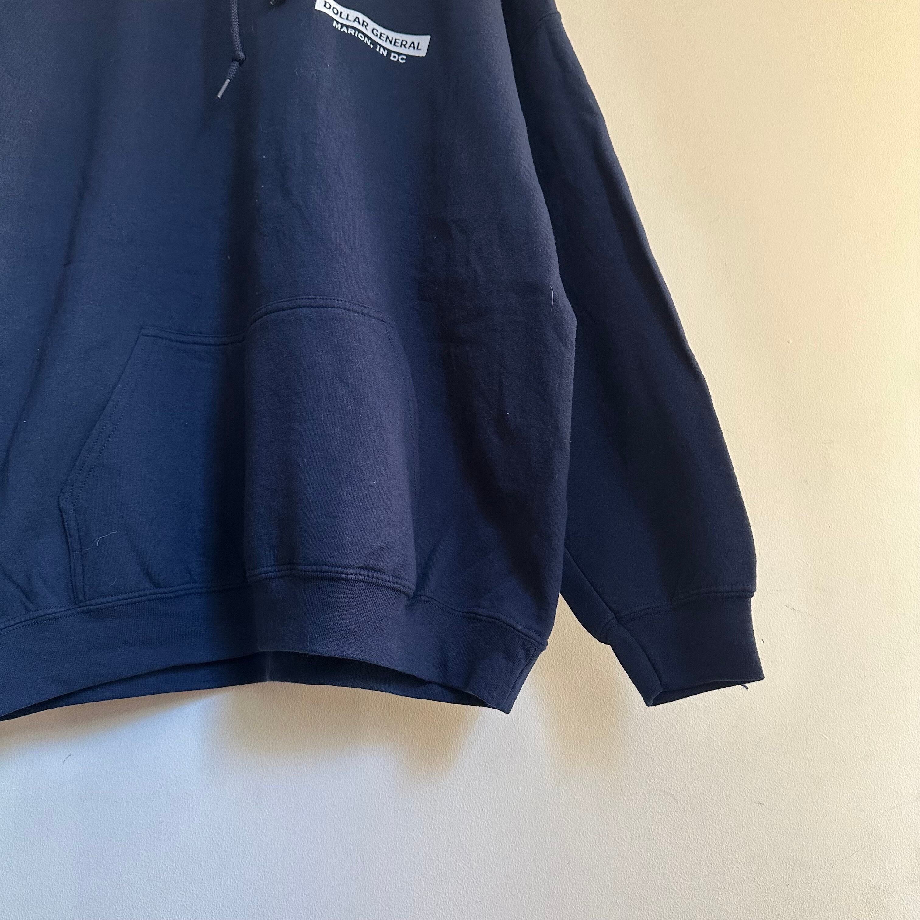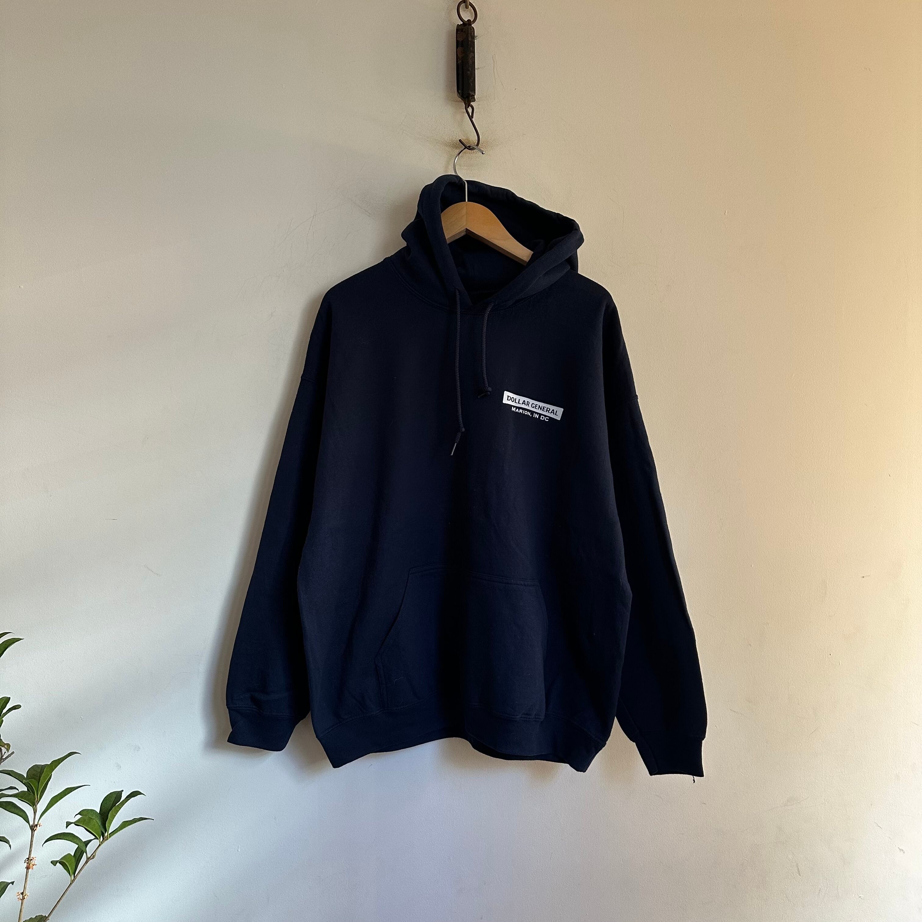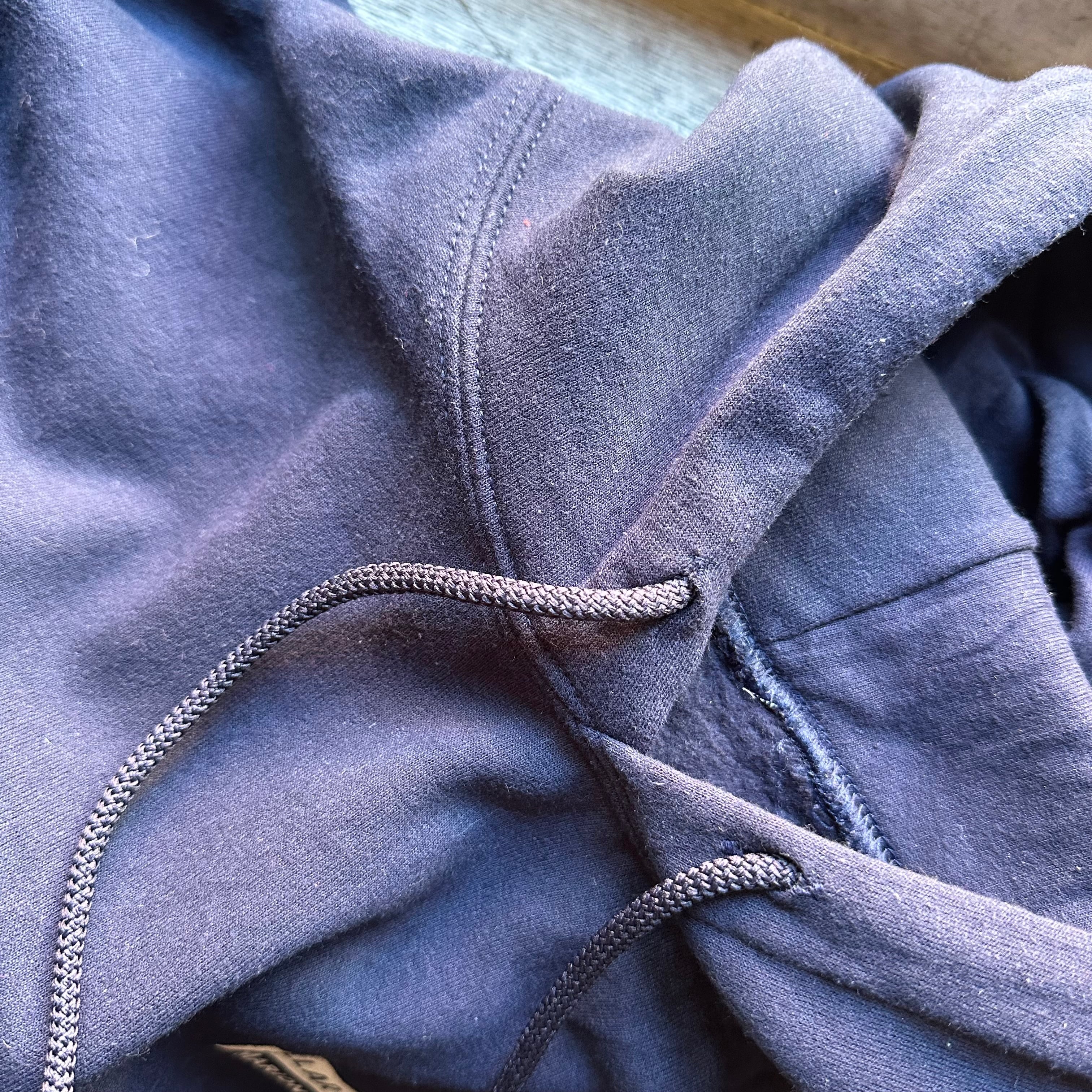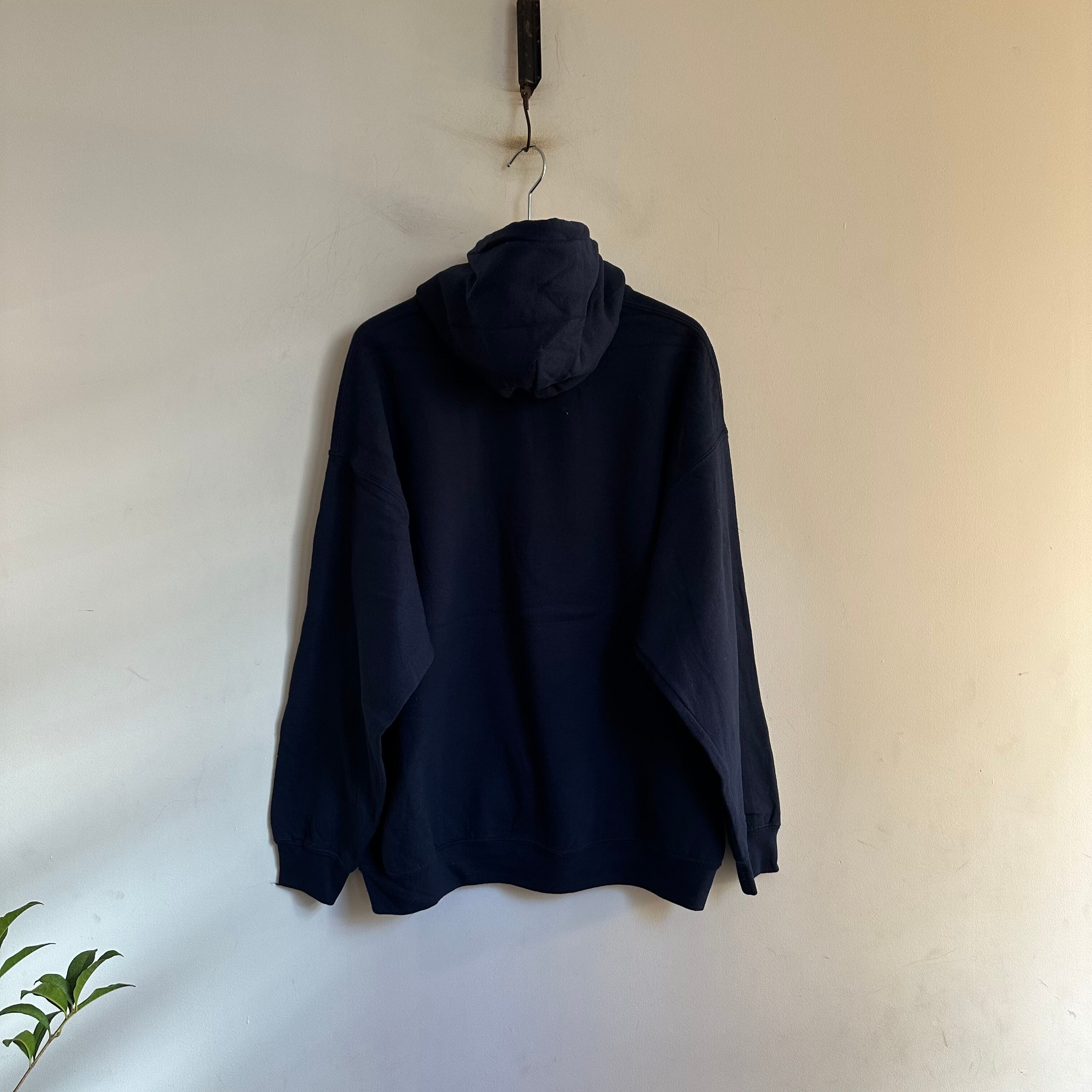 スウェットです。紺のフード。胸ワンポイント。形の癖もなく、使い勝手良さそうです。お好きな方、いかがでしょうか。