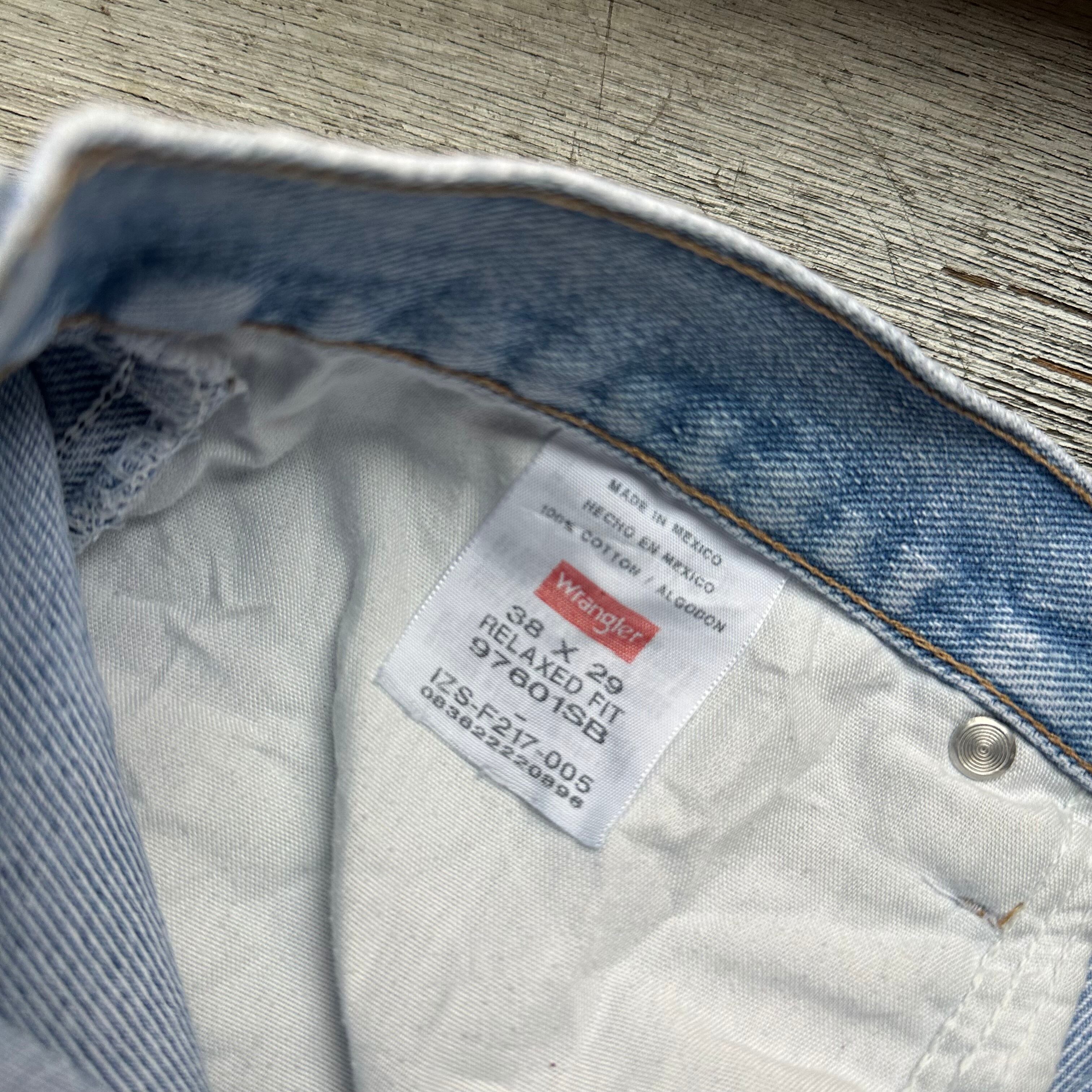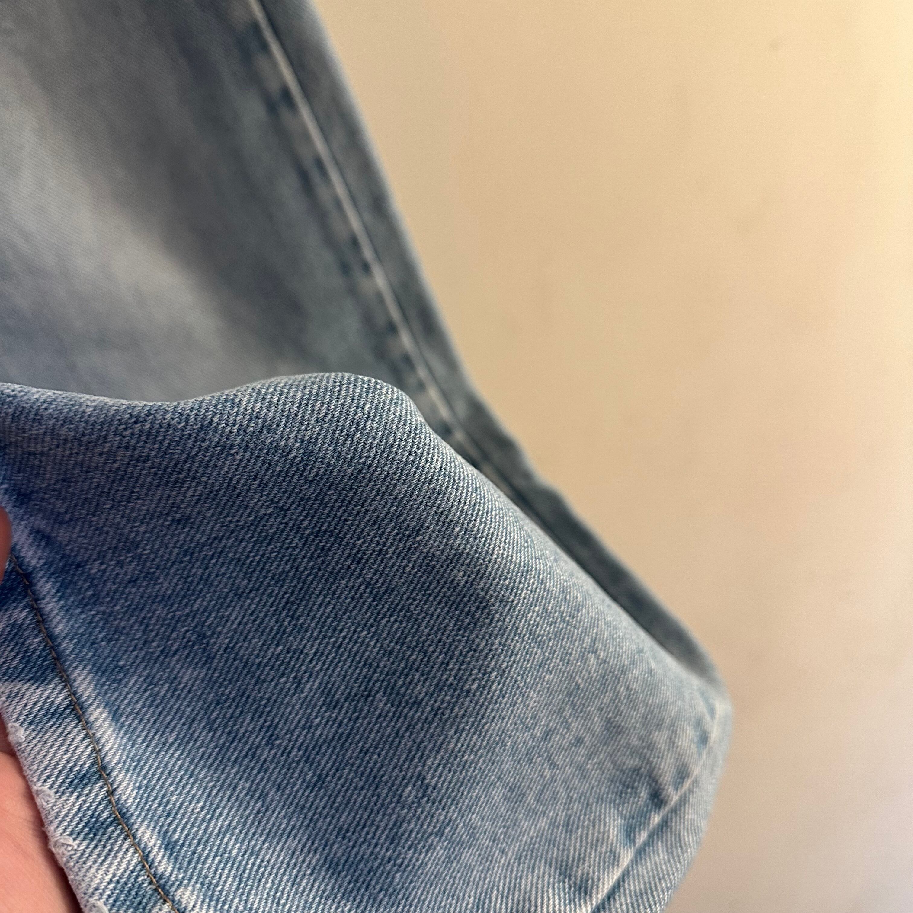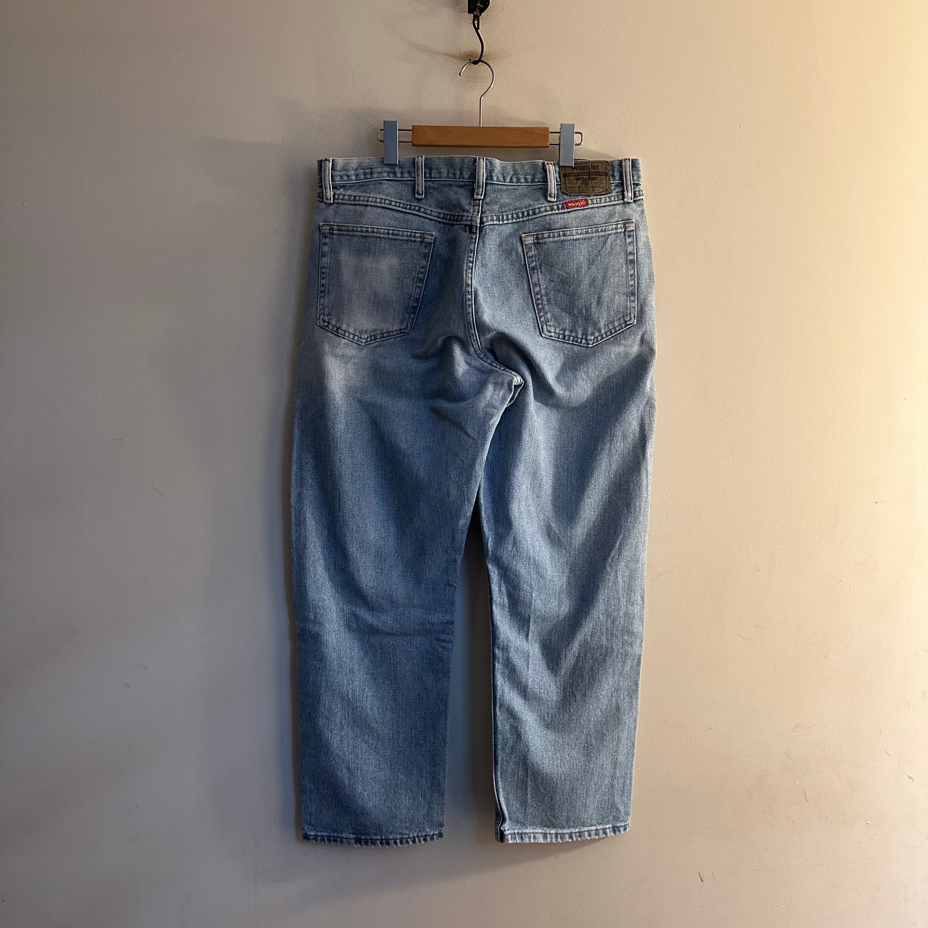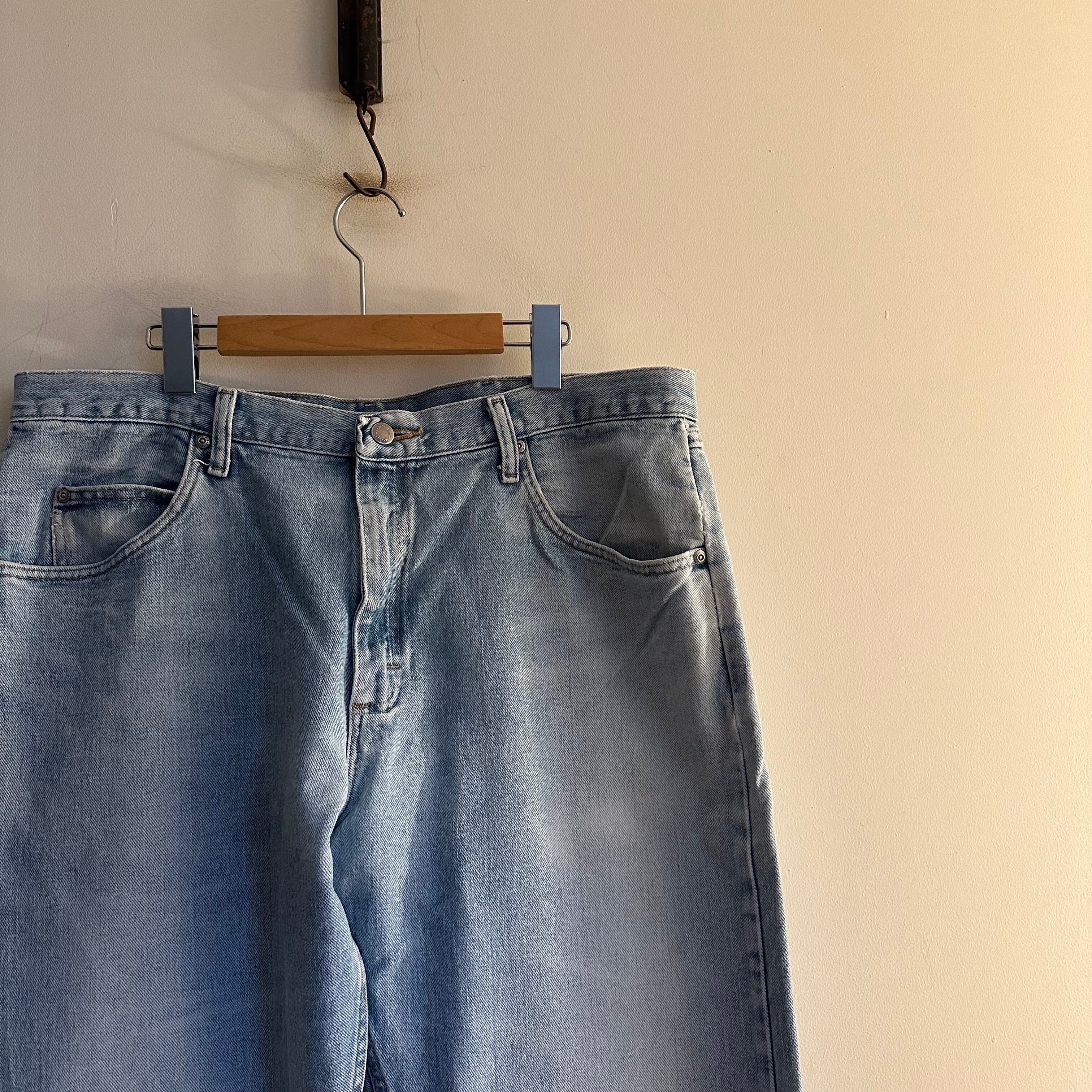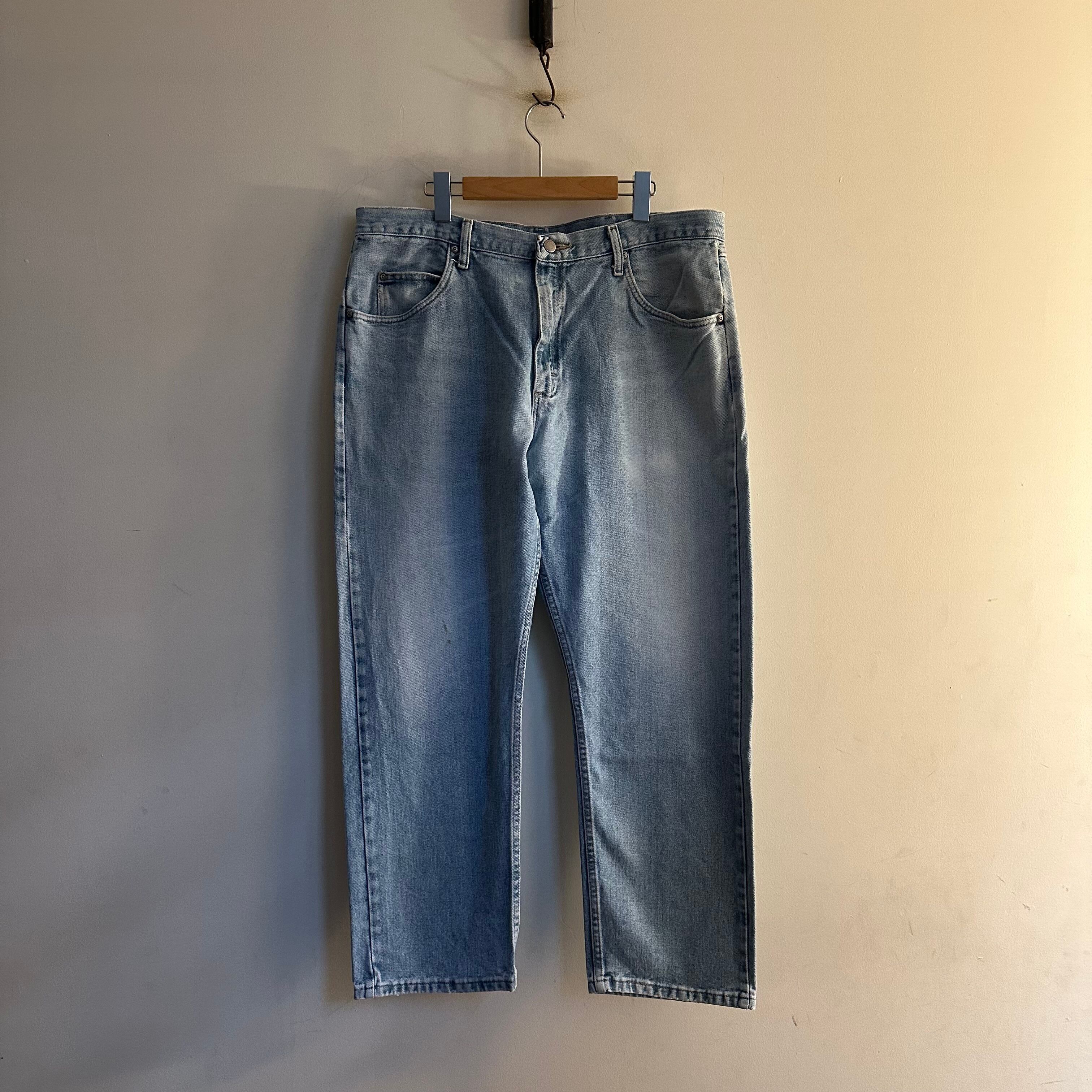 wranglerアイスブルーデニムです。うっすらヒゲと、全体で綺麗なアイスブルー。緩めのサイズで、シルエット出して。お好きな方、いかがでしょうか。