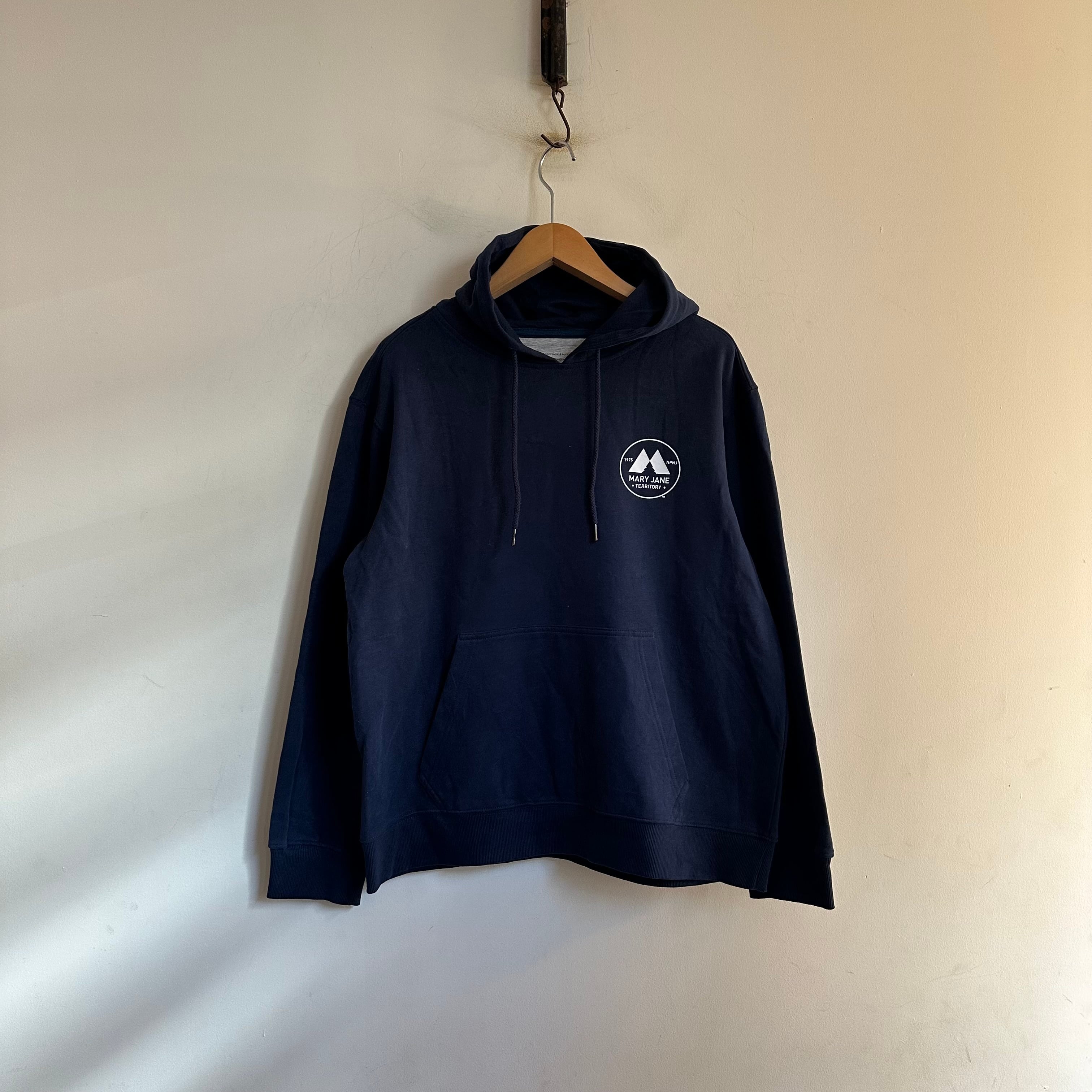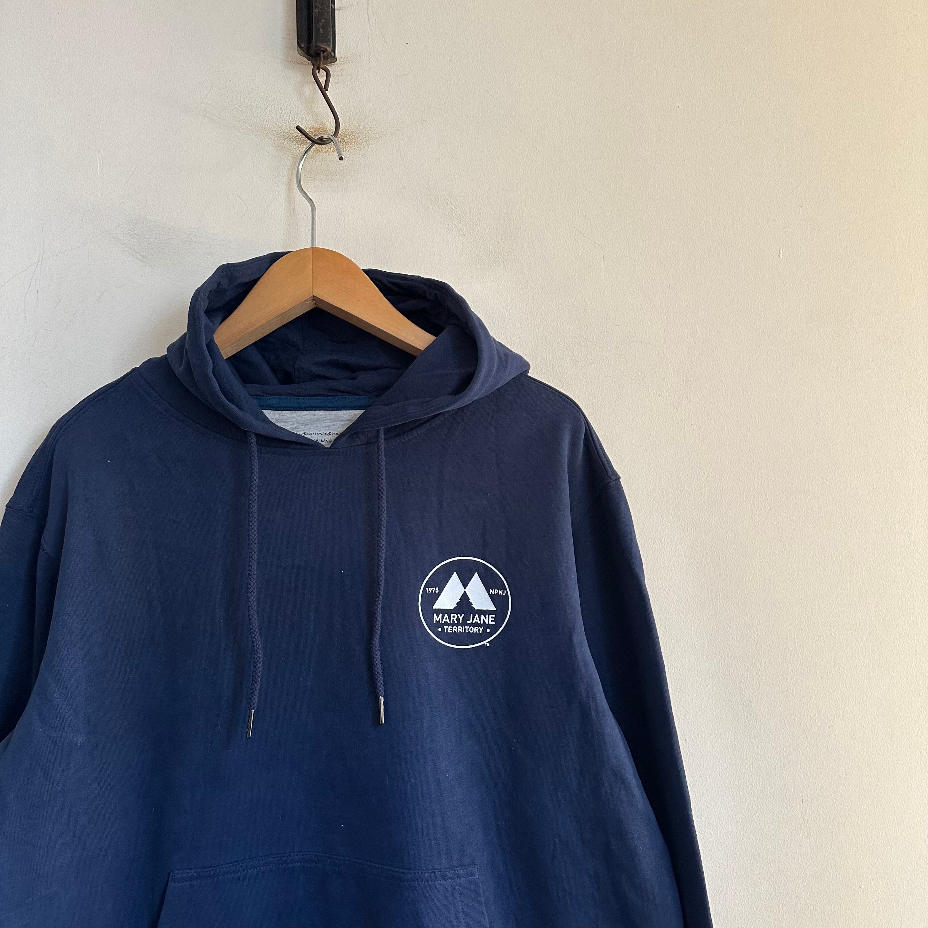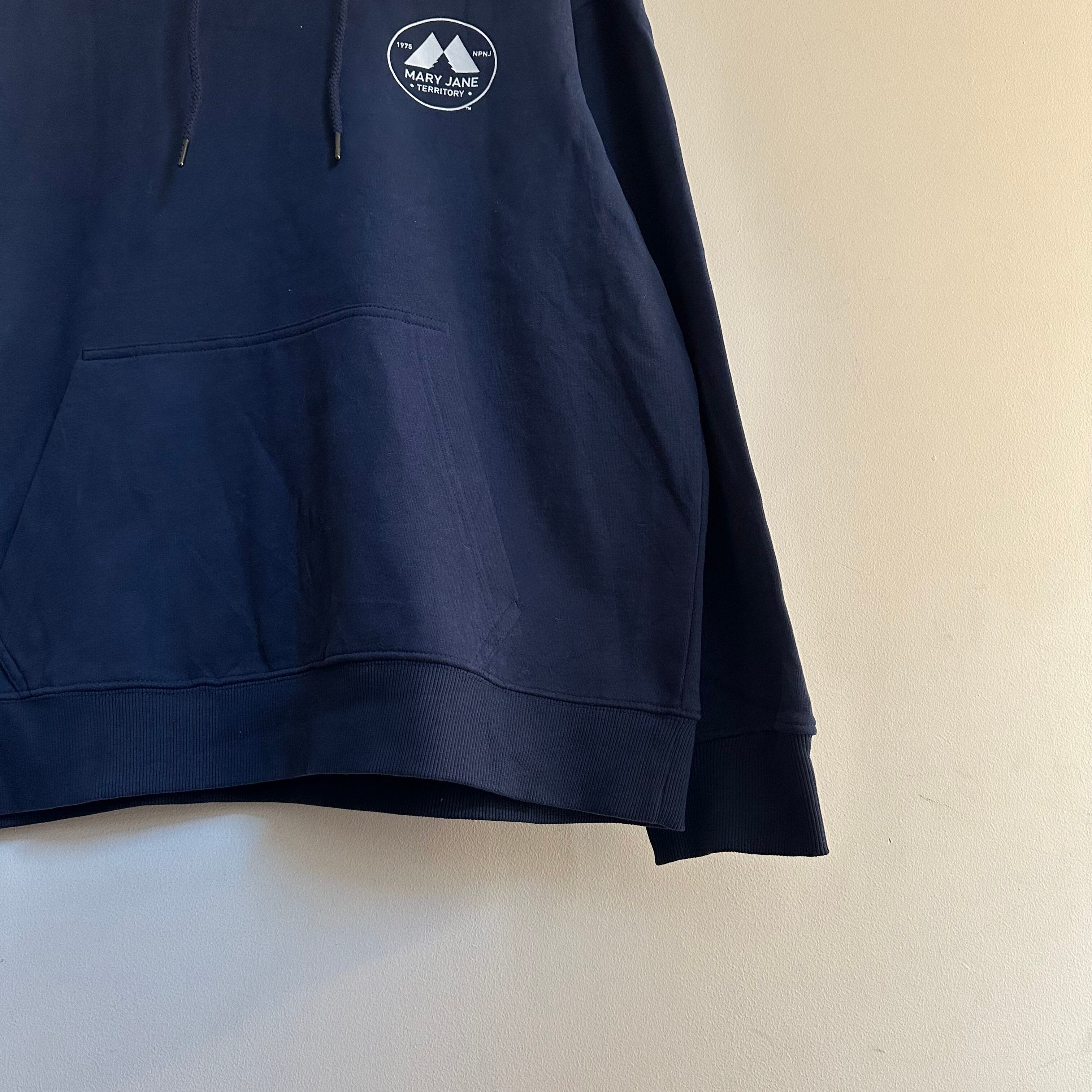スウェットです。紺に白で、胸と背中、両面プリント。柔らかく着やすい生地感。お好きな方、いかがでしょうか。