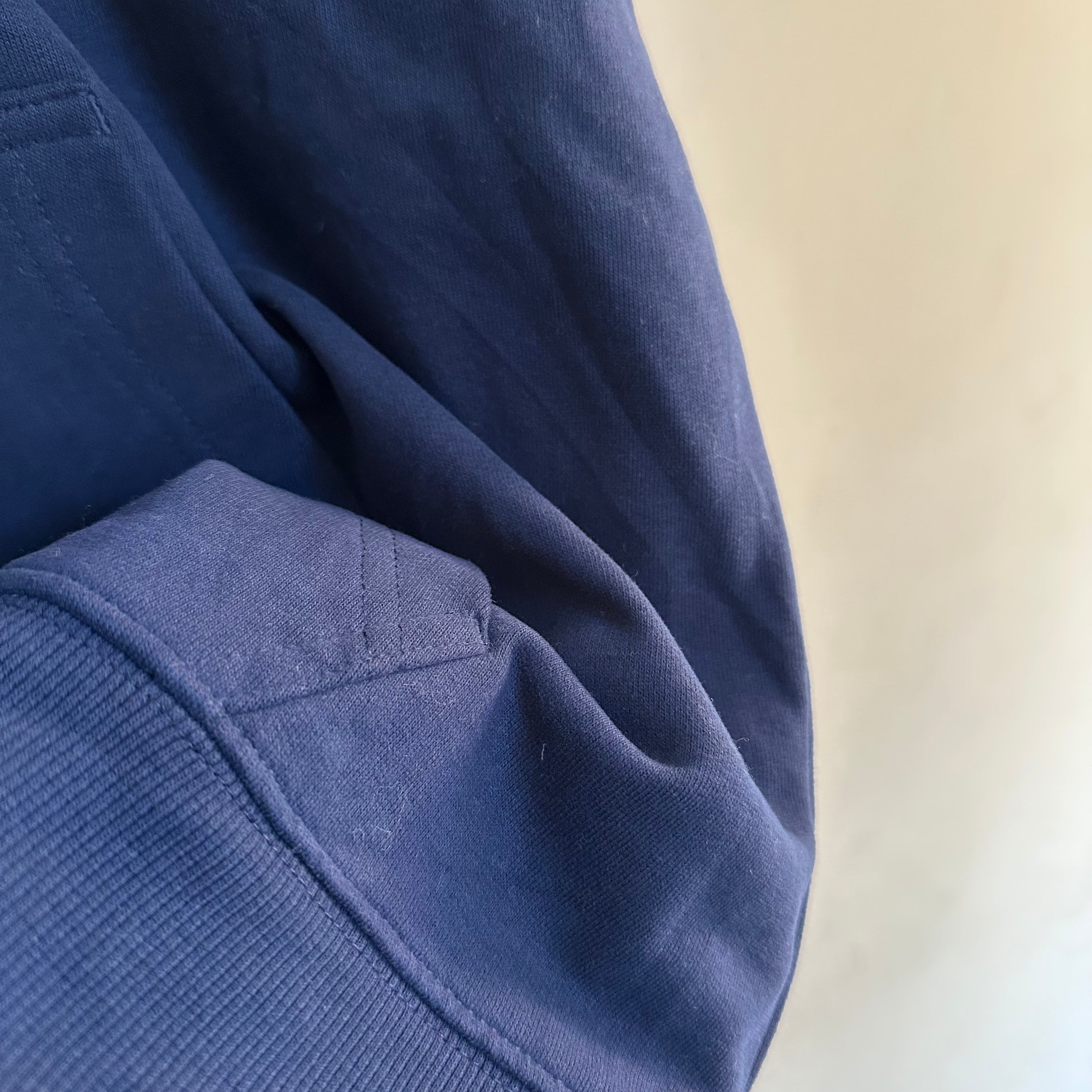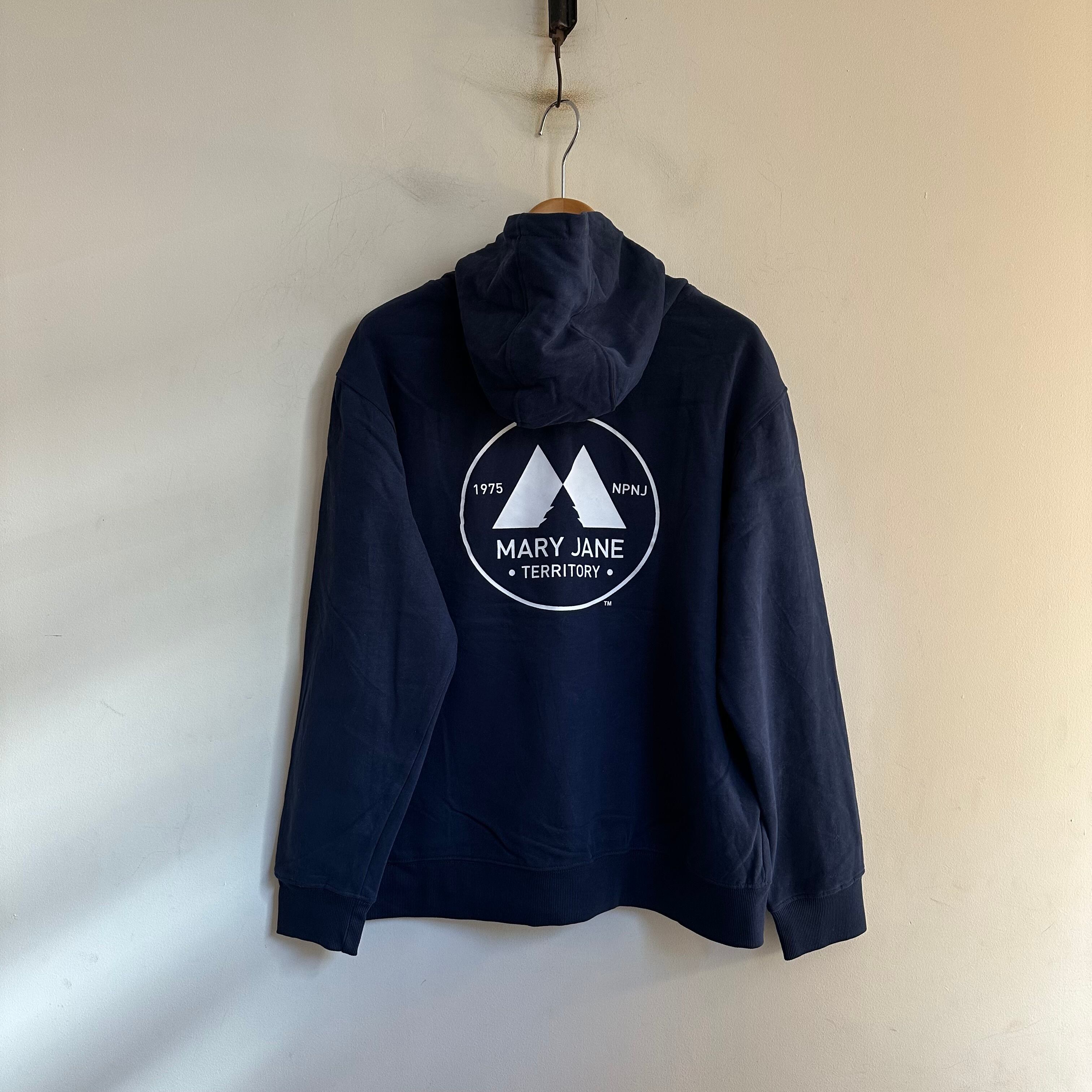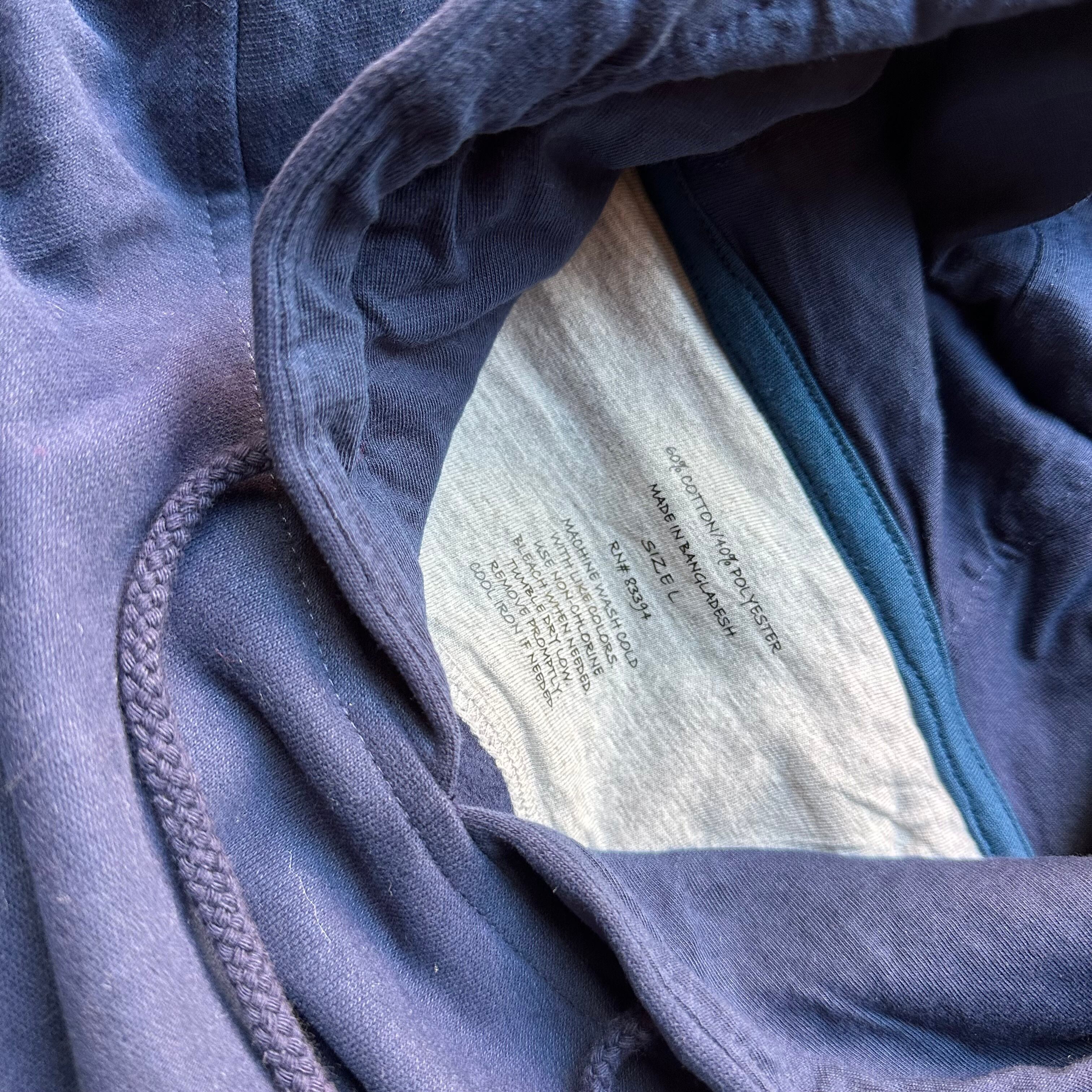 スウェットです。紺に白で、胸と背中、両面プリント。柔らかく着やすい生地感。お好きな方、いかがでしょうか。