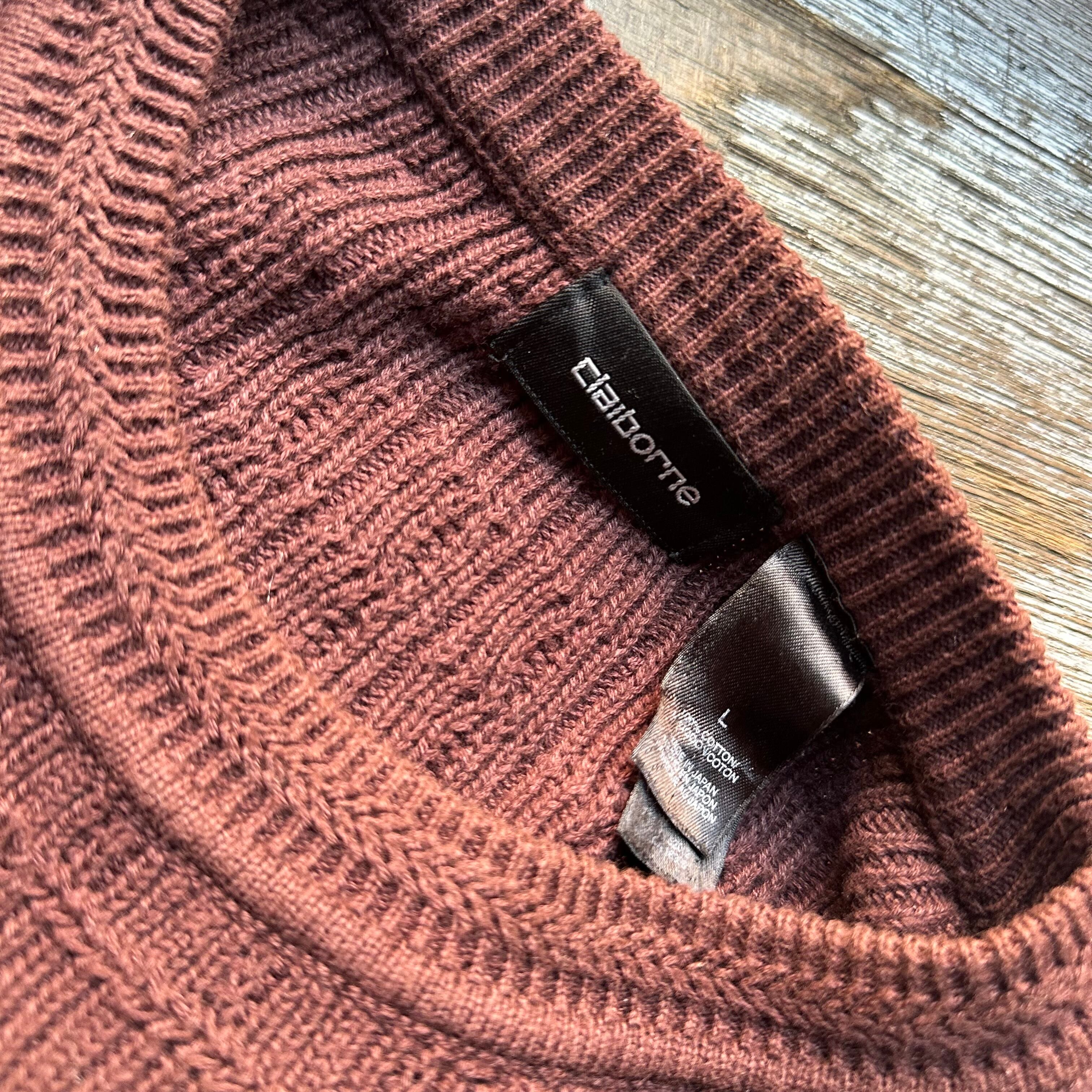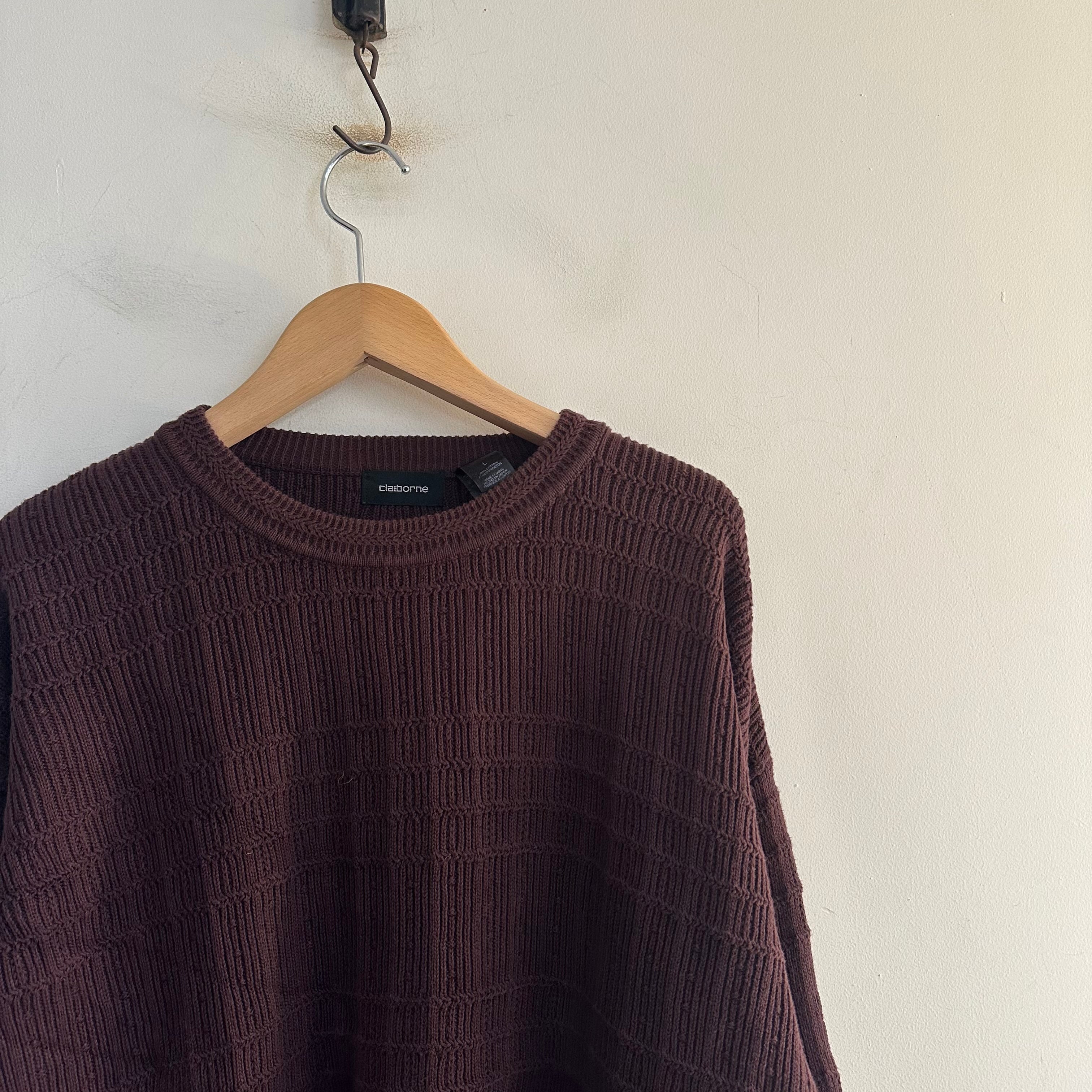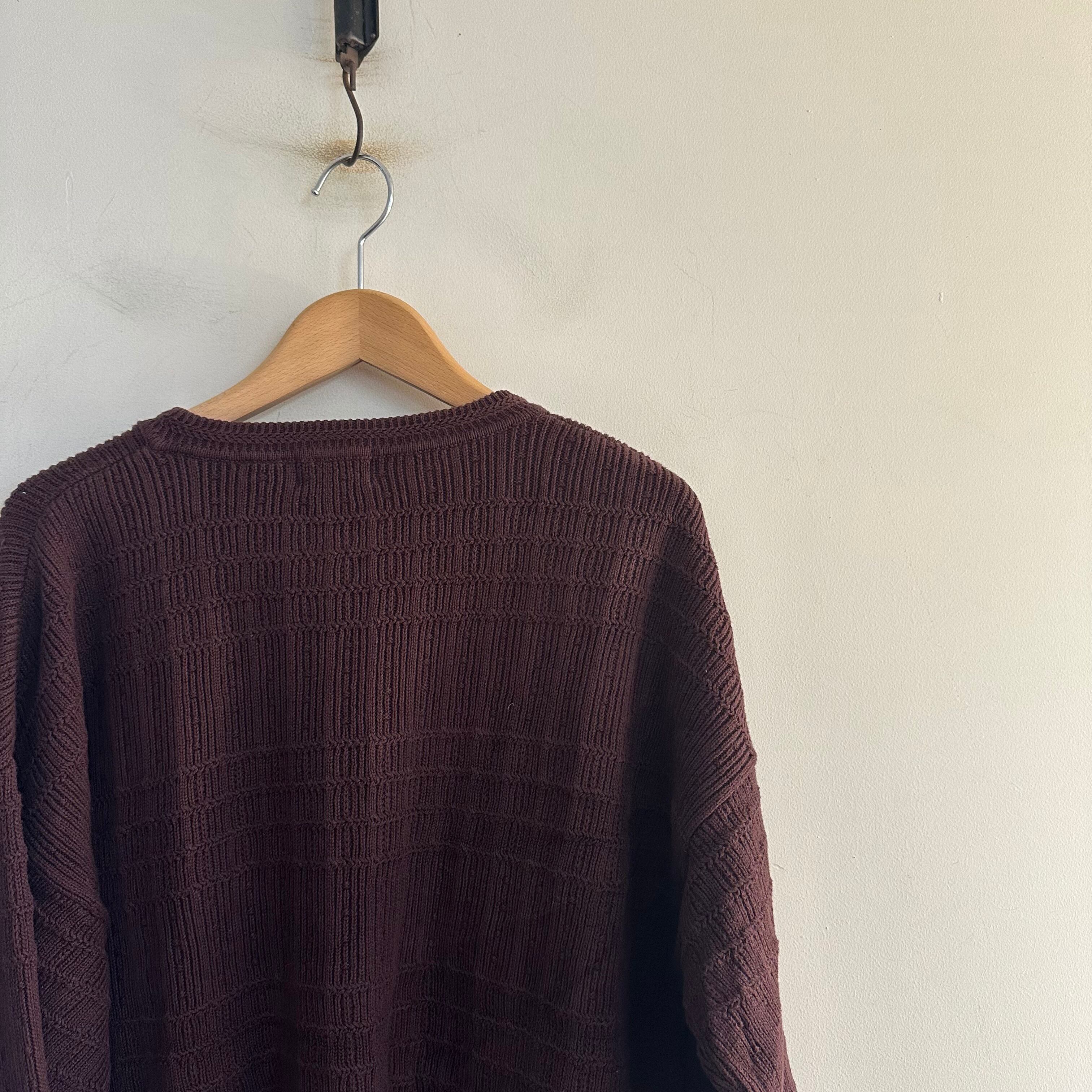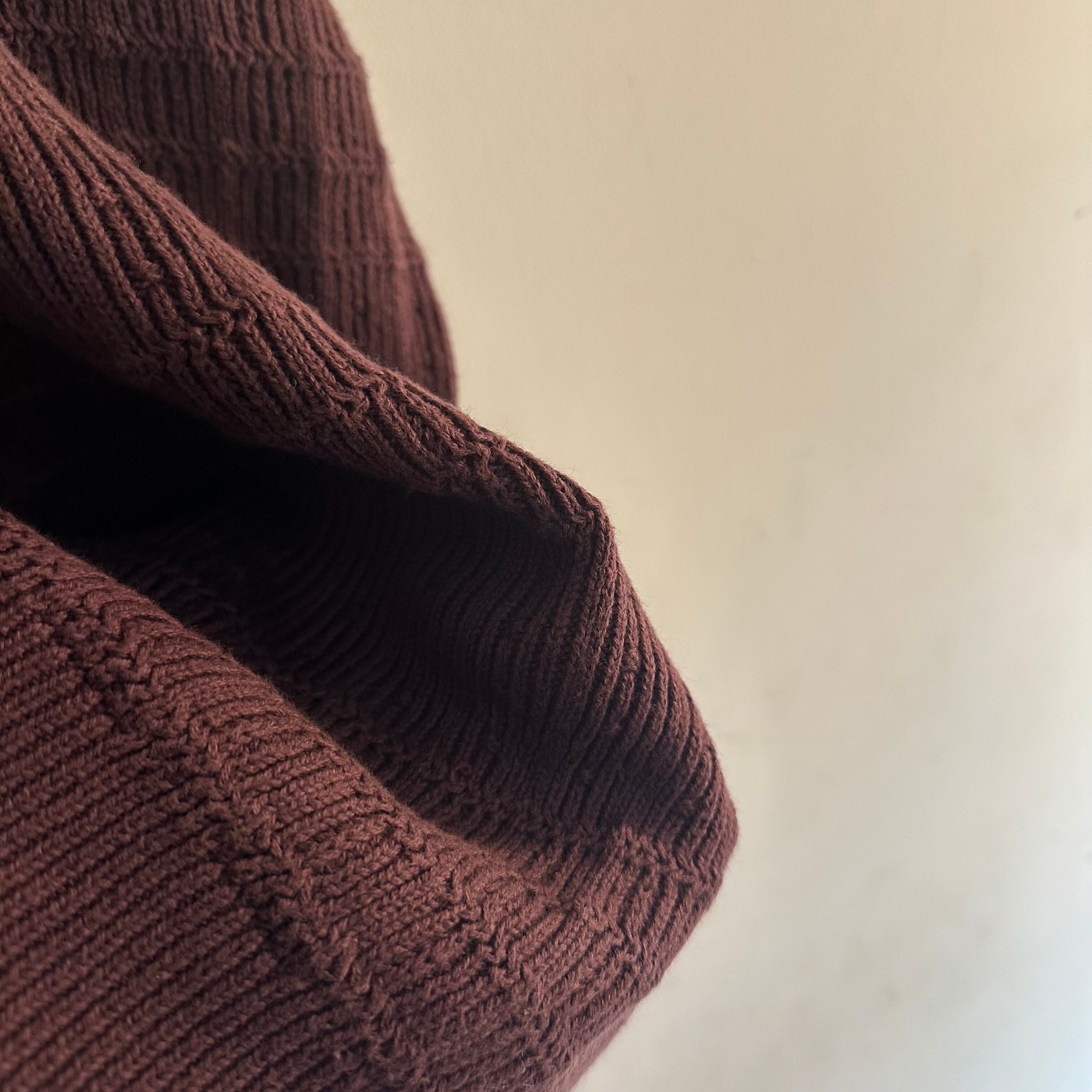 コットンニットです。エンジとブラウンの間みたいな良いトーンです。無地の細かい柄織り。じわじわきますね。お好きな方、いかがでしょうか。