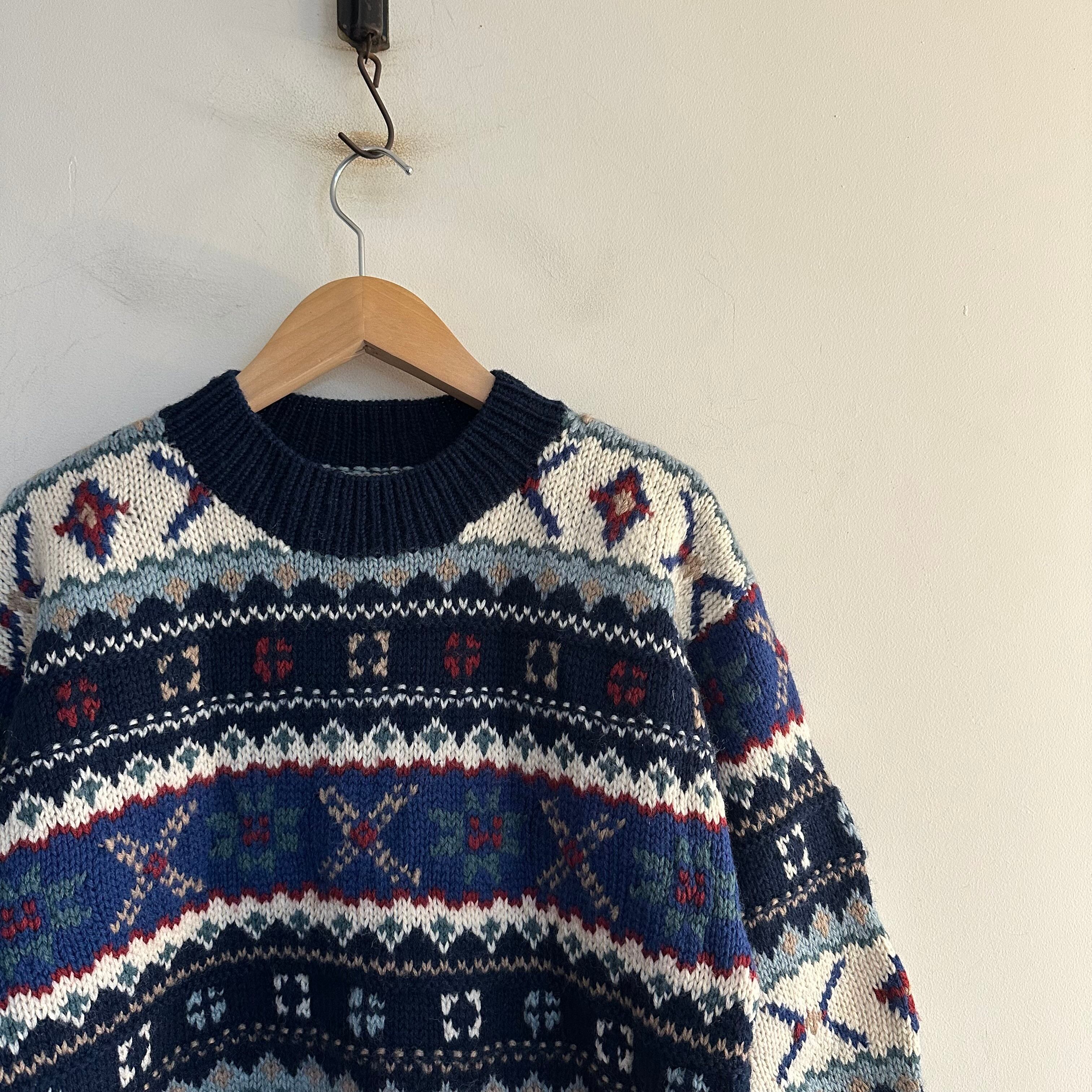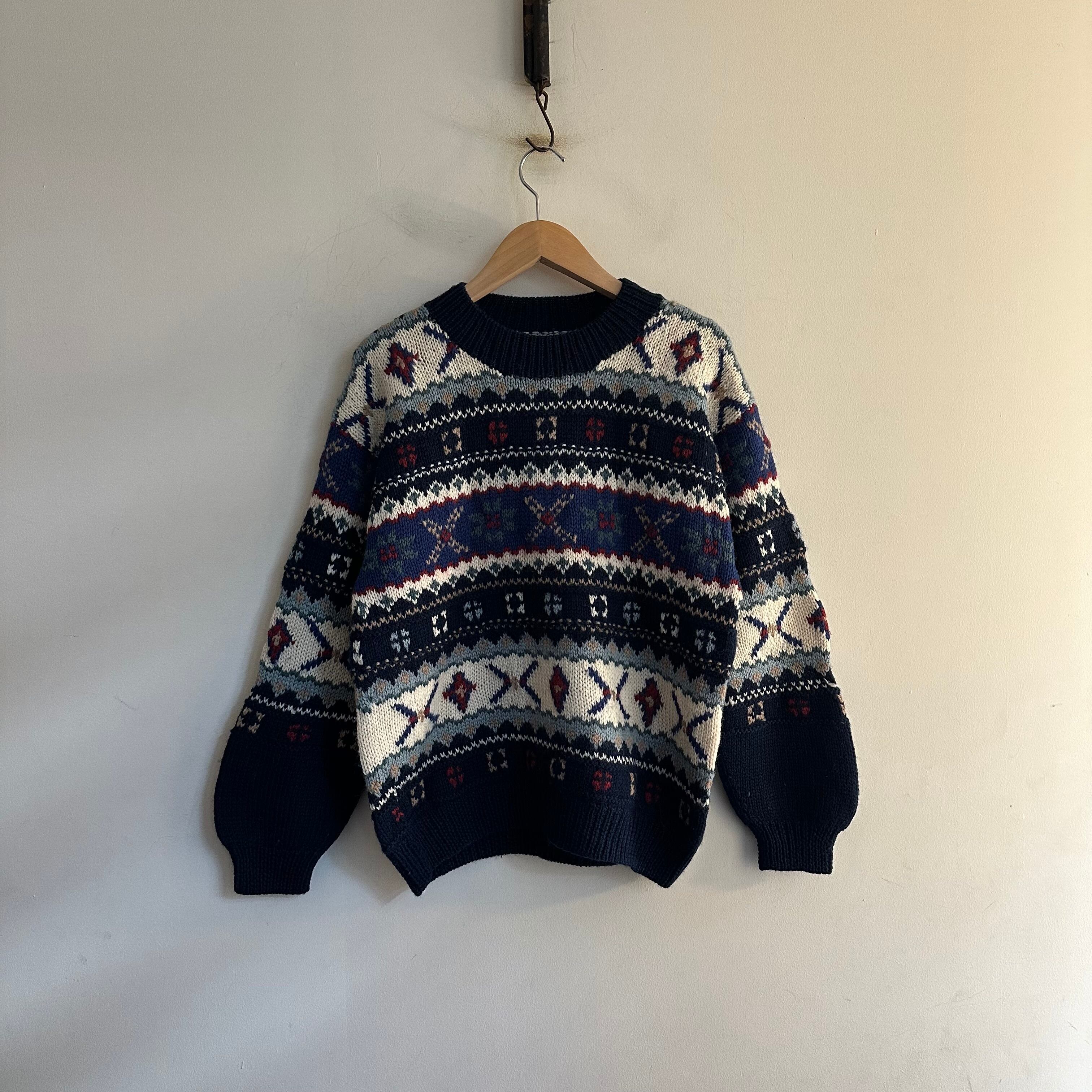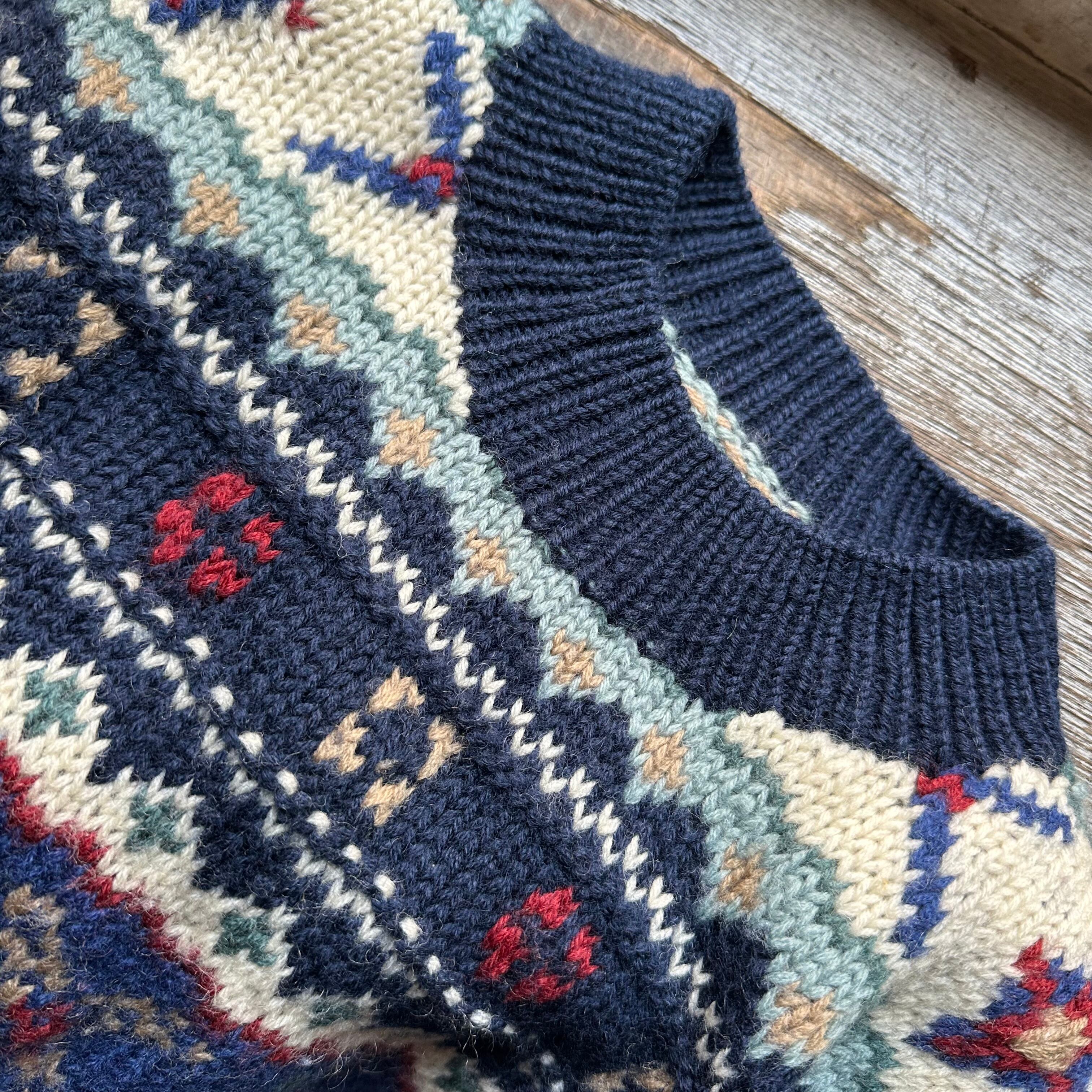 ハンドニットです。冬らしい柄に配色も良いですね。首元の詰まり、袖のリブ。キュッとしてボリューム出して。お好きな方、いかがでしょうか。