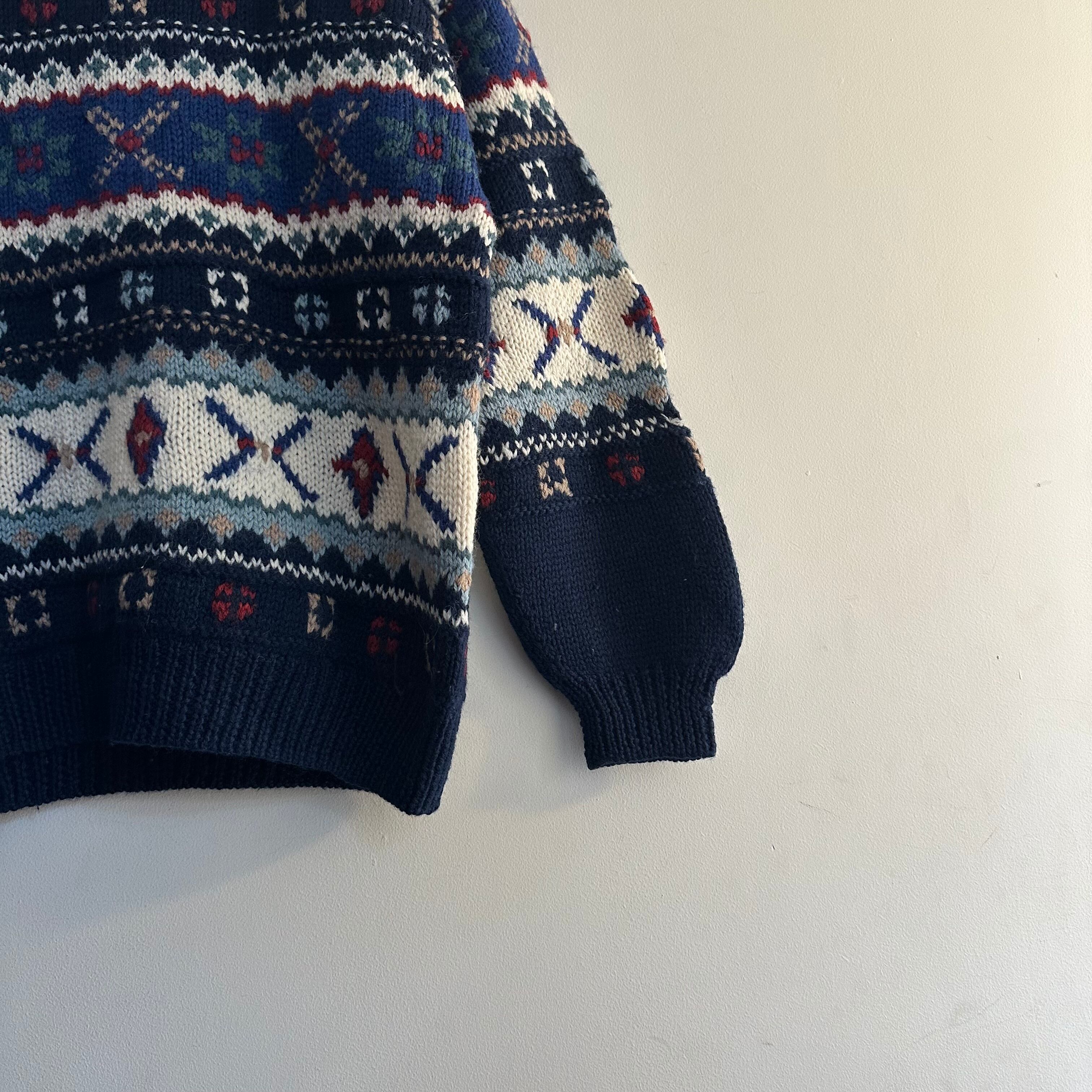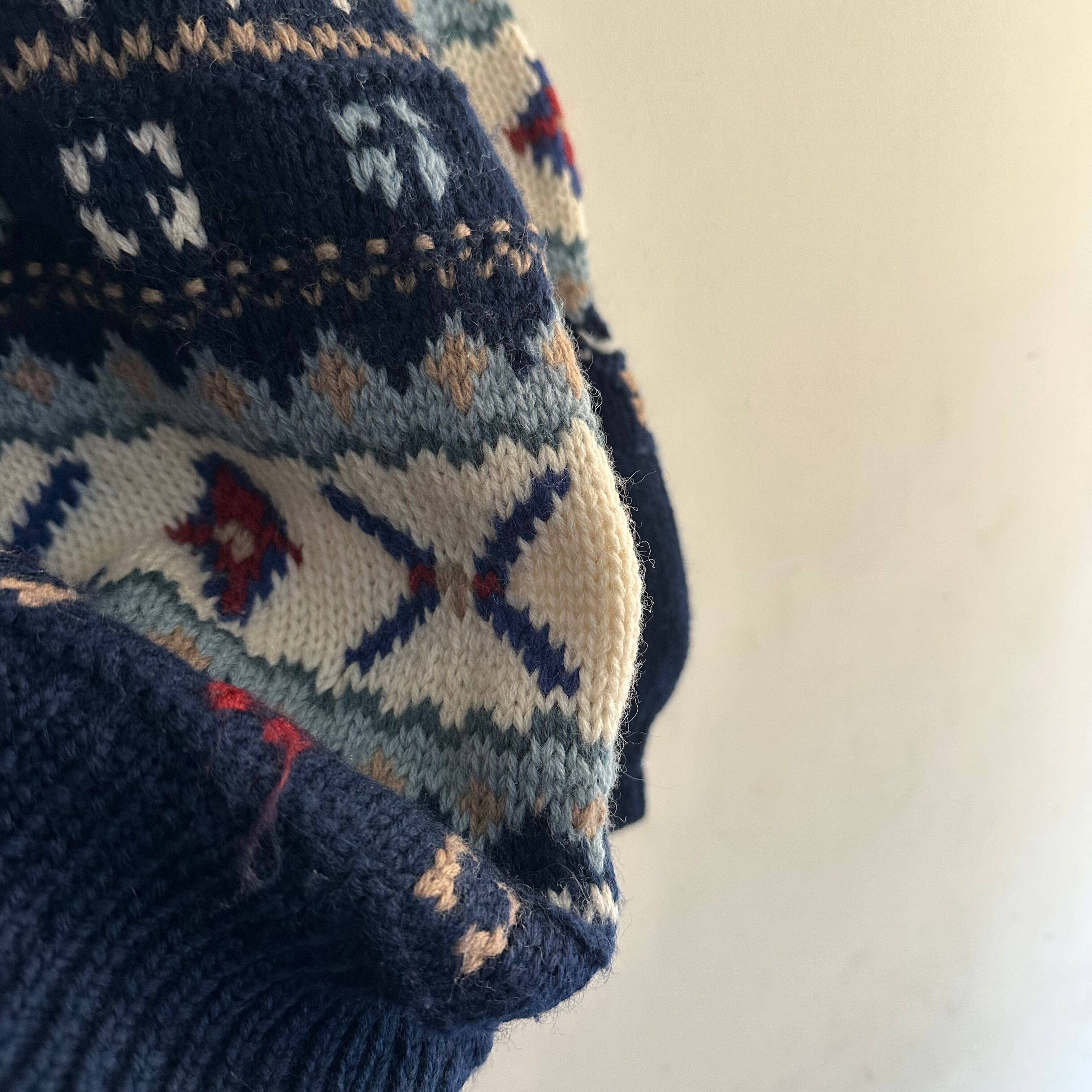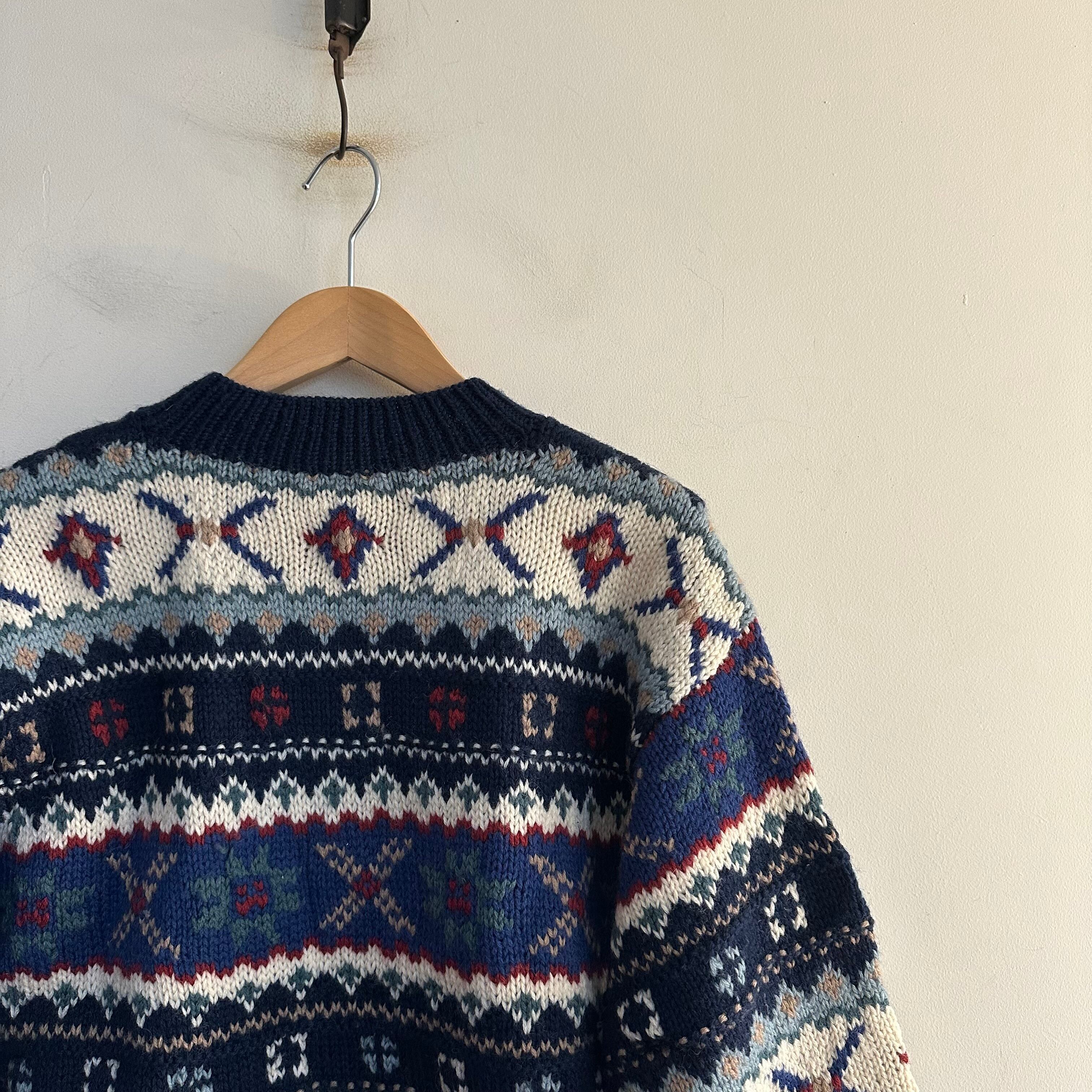 ハンドニットです。冬らしい柄に配色も良いですね。首元の詰まり、袖のリブ。キュッとしてボリューム出して。お好きな方、いかがでしょうか。