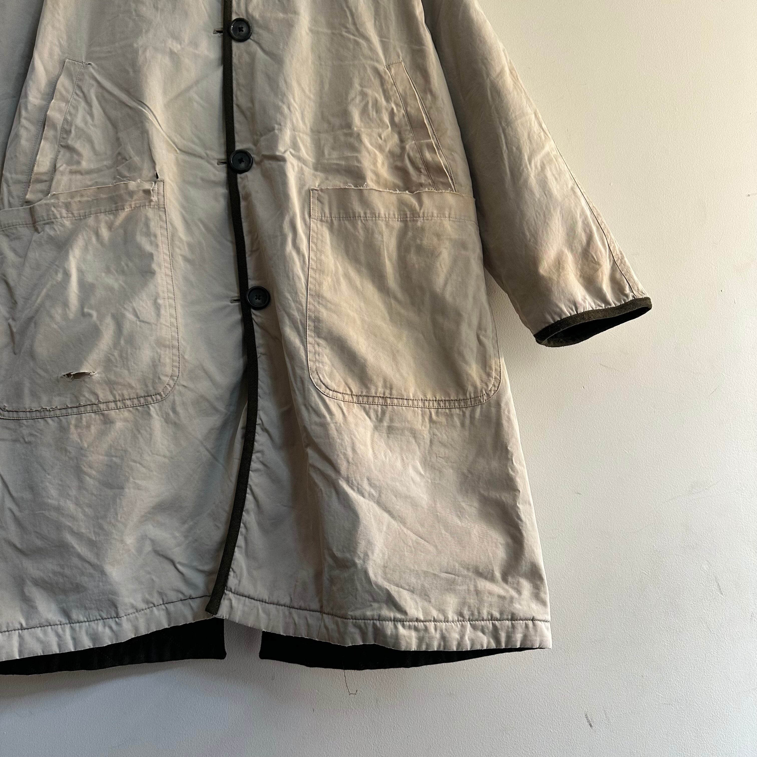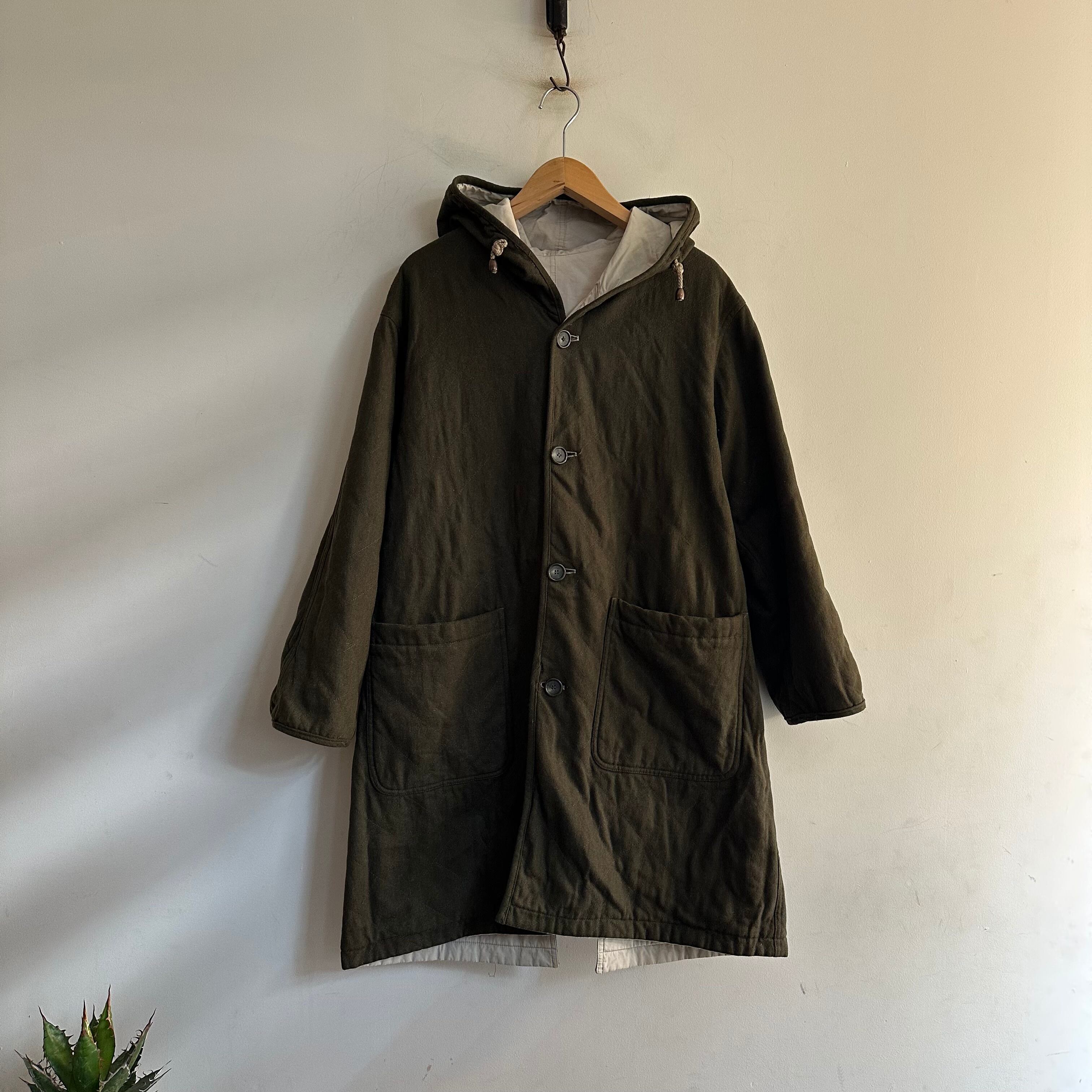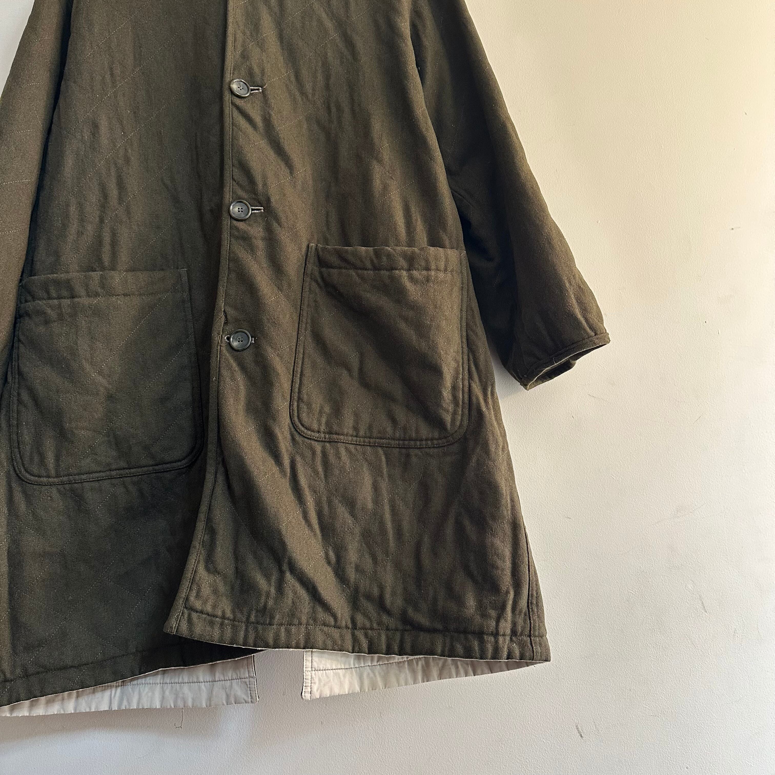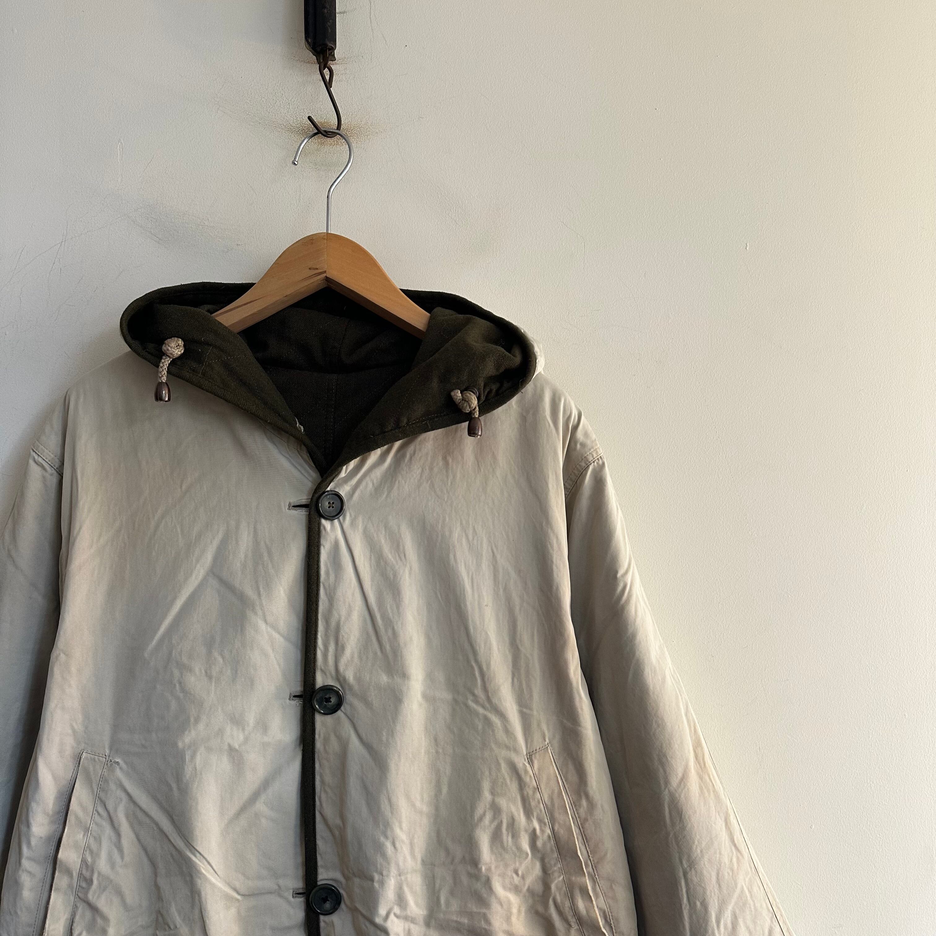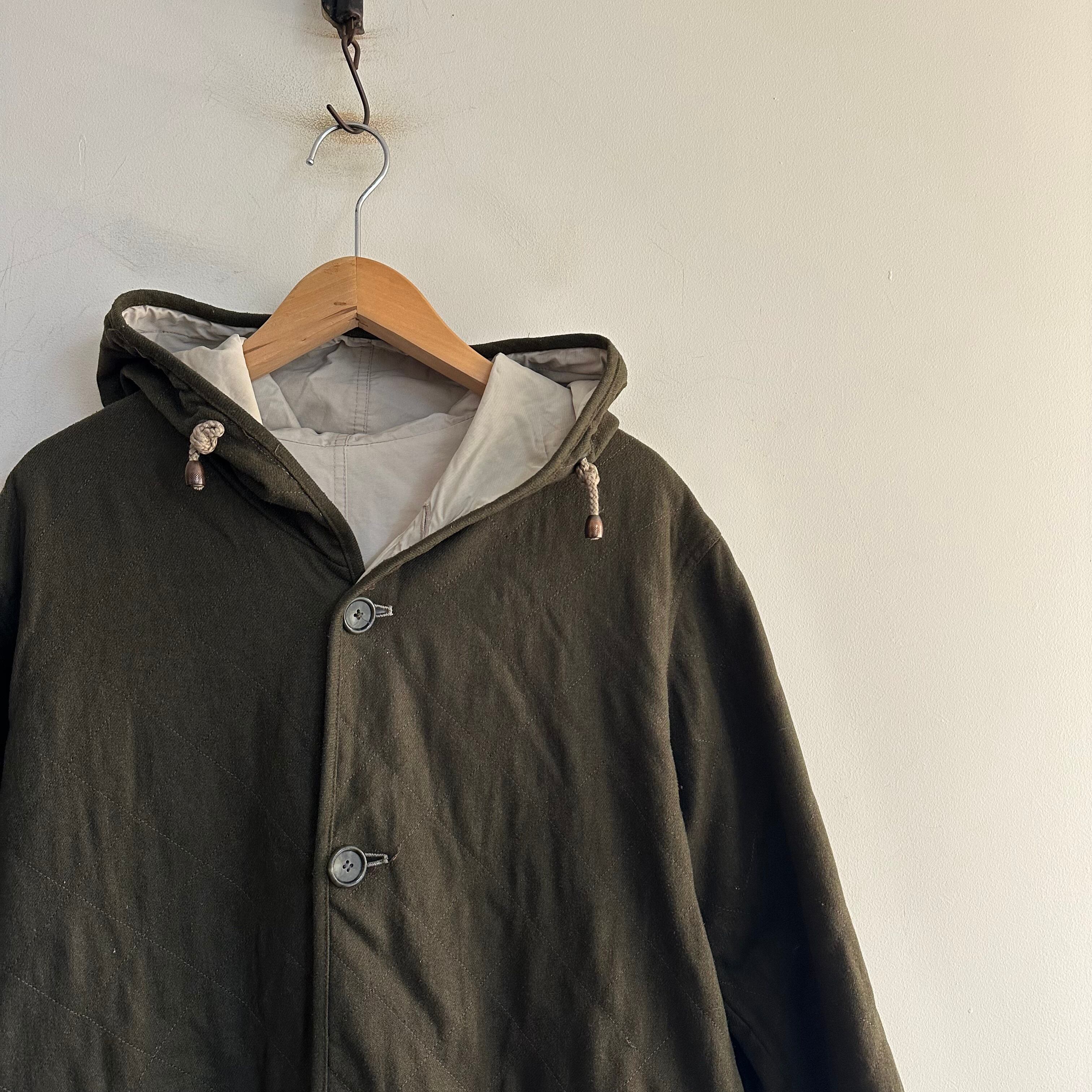 リバーシブルのフードコートです。カーキのウールと生成りのコットン。ウールに、うっすら上からキルティング。洒落てます。タグと形とサイズ感的に90sと思います。お好きな方、いかがでしょうか。