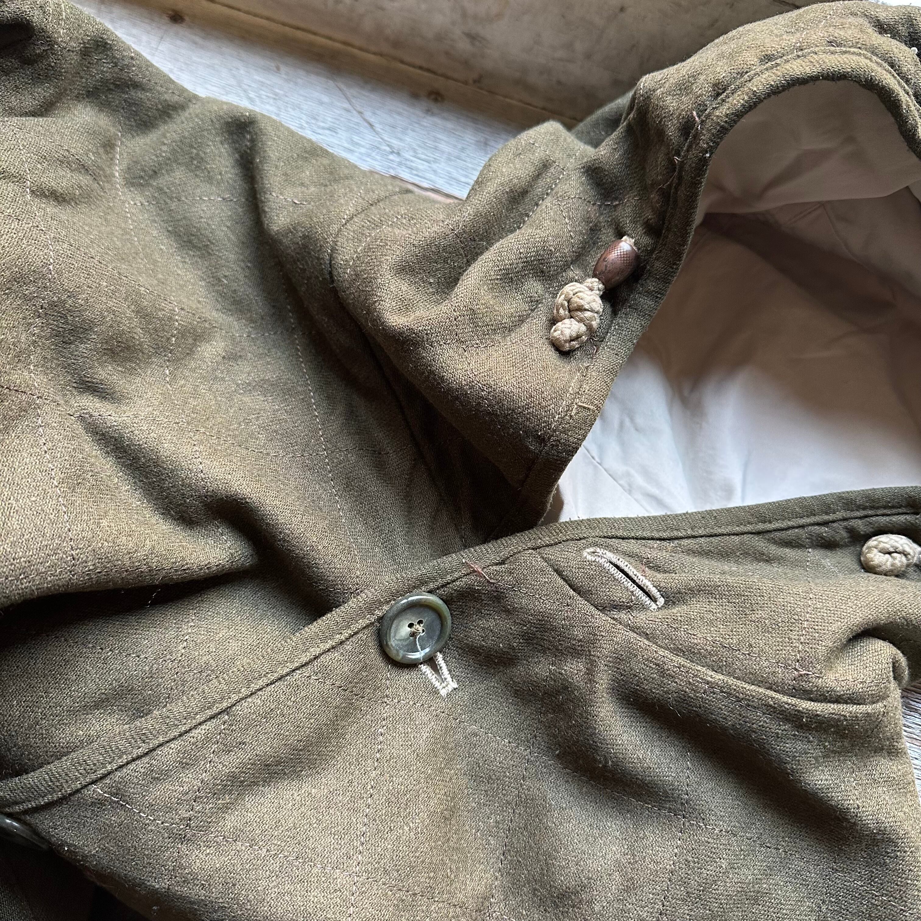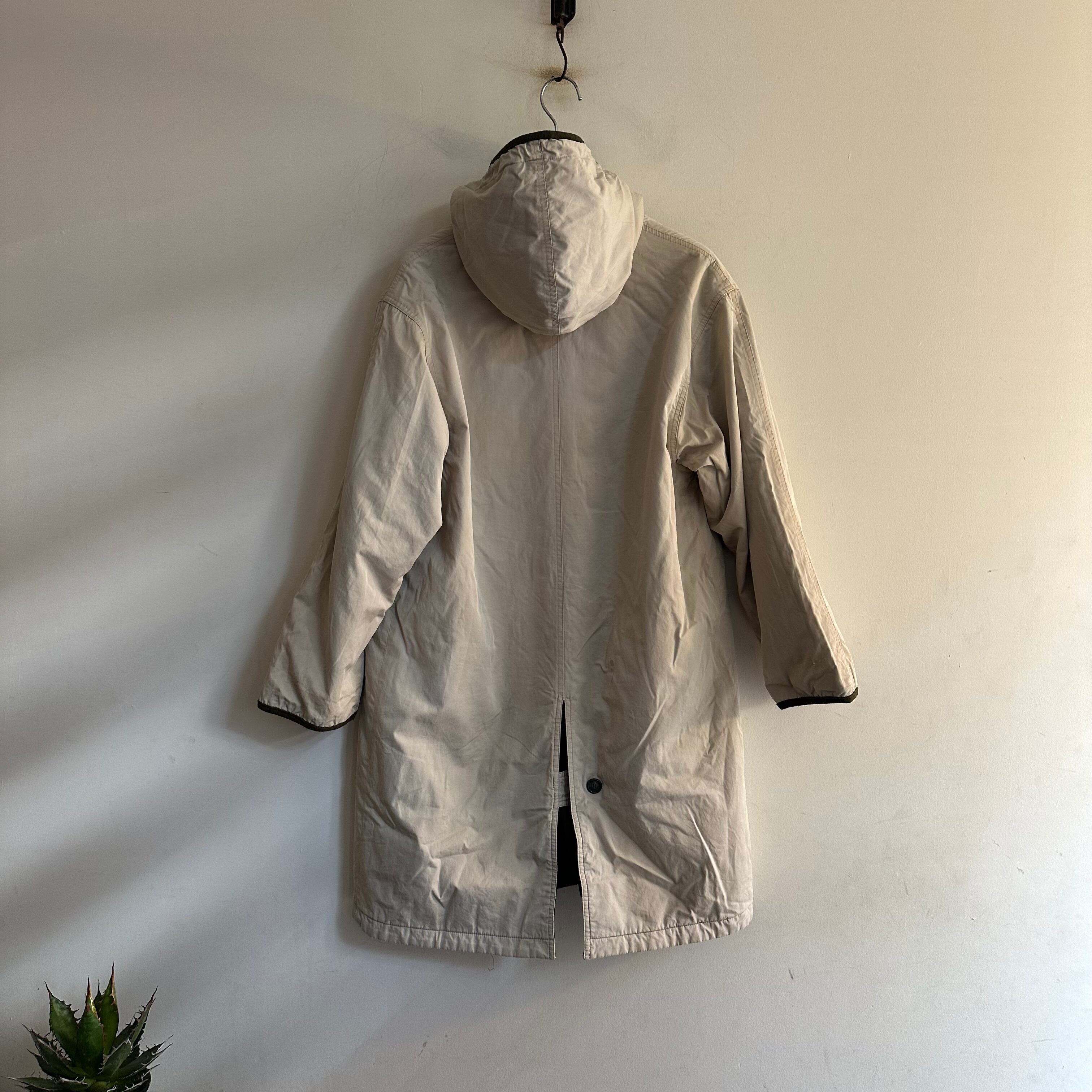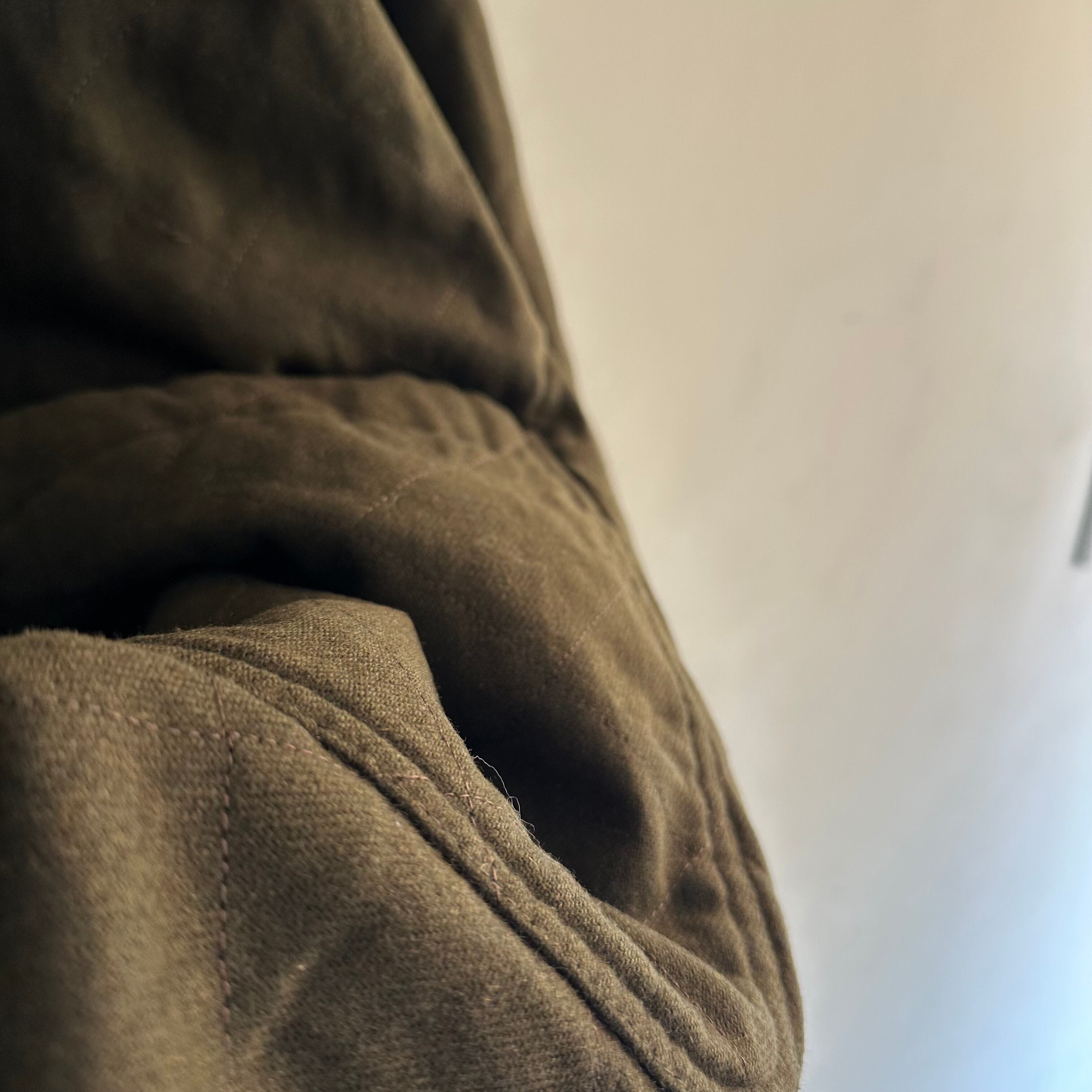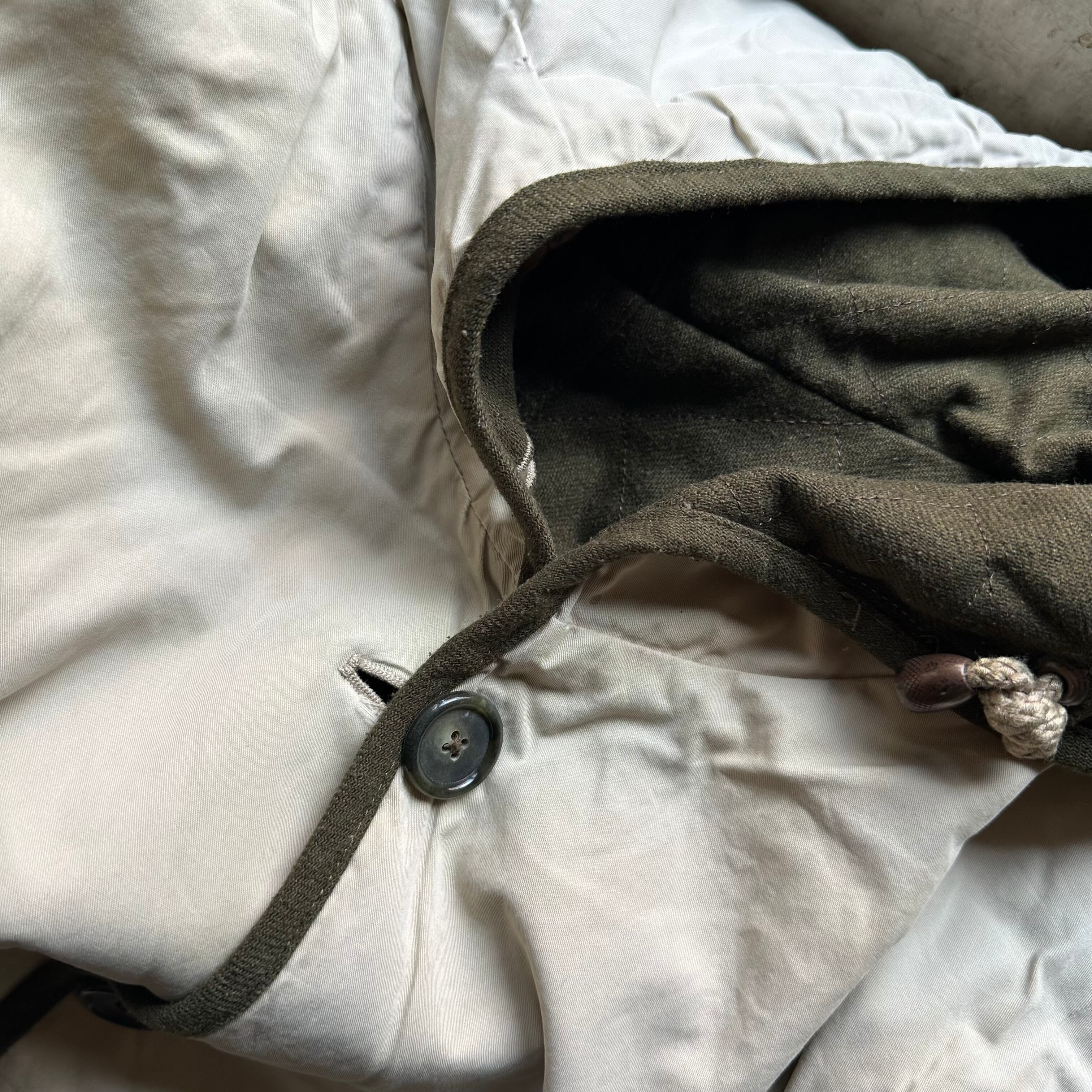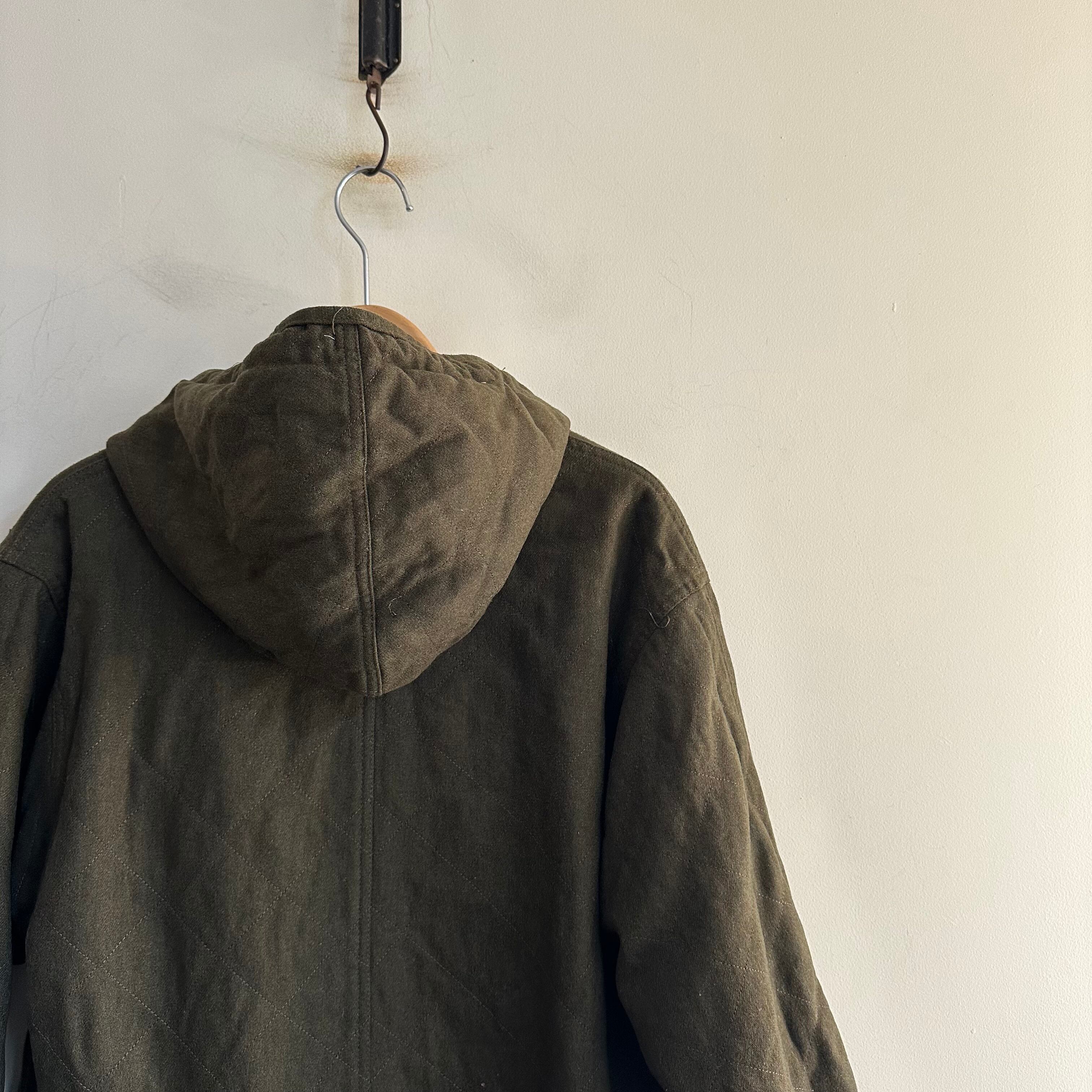 リバーシブルのフードコートです。カーキのウールと生成りのコットン。ウールに、うっすら上からキルティング。洒落てます。タグと形とサイズ感的に90sと思います。お好きな方、いかがでしょうか。