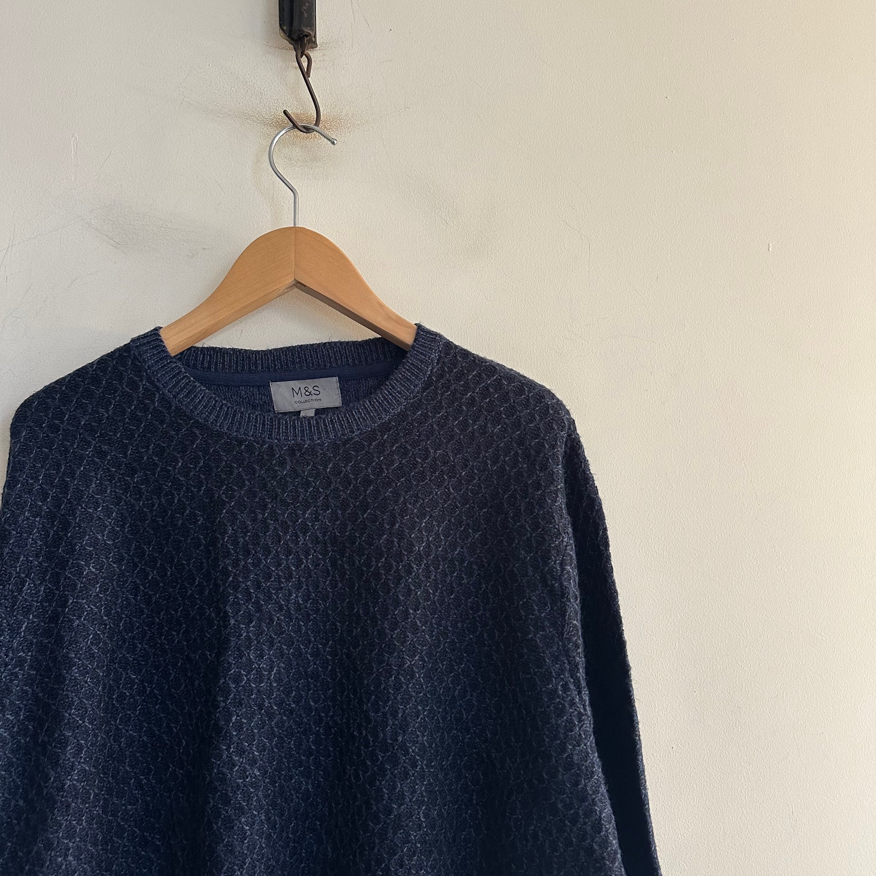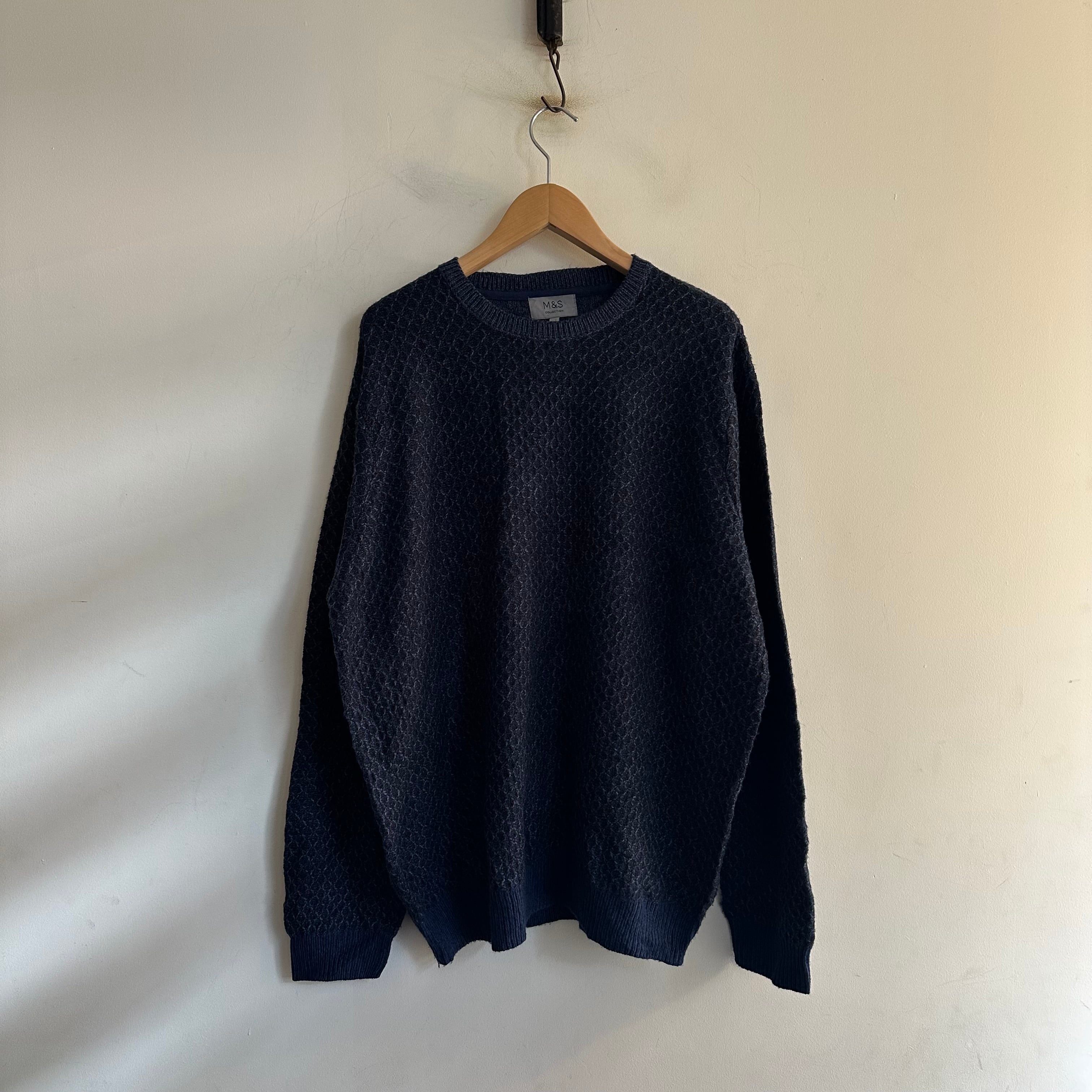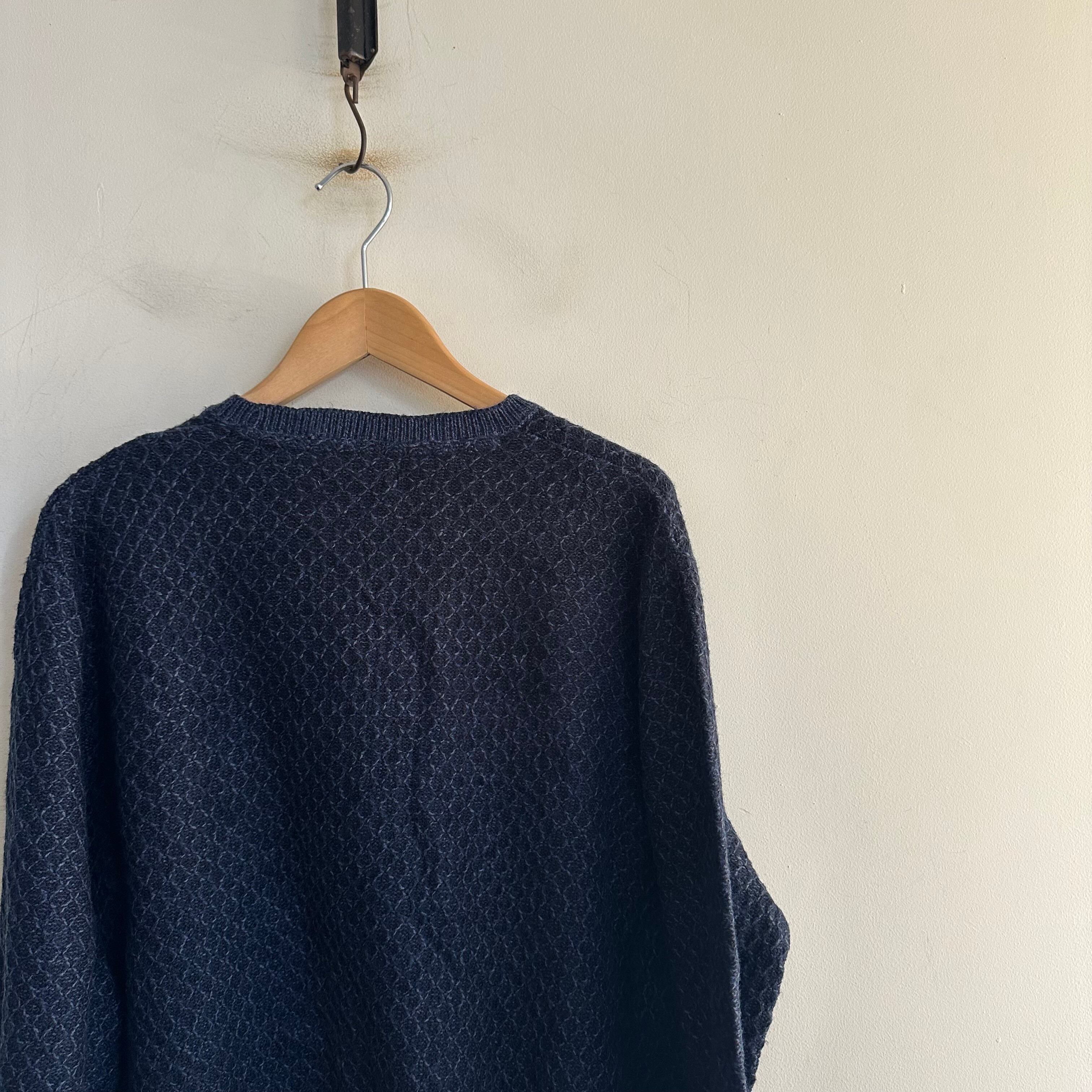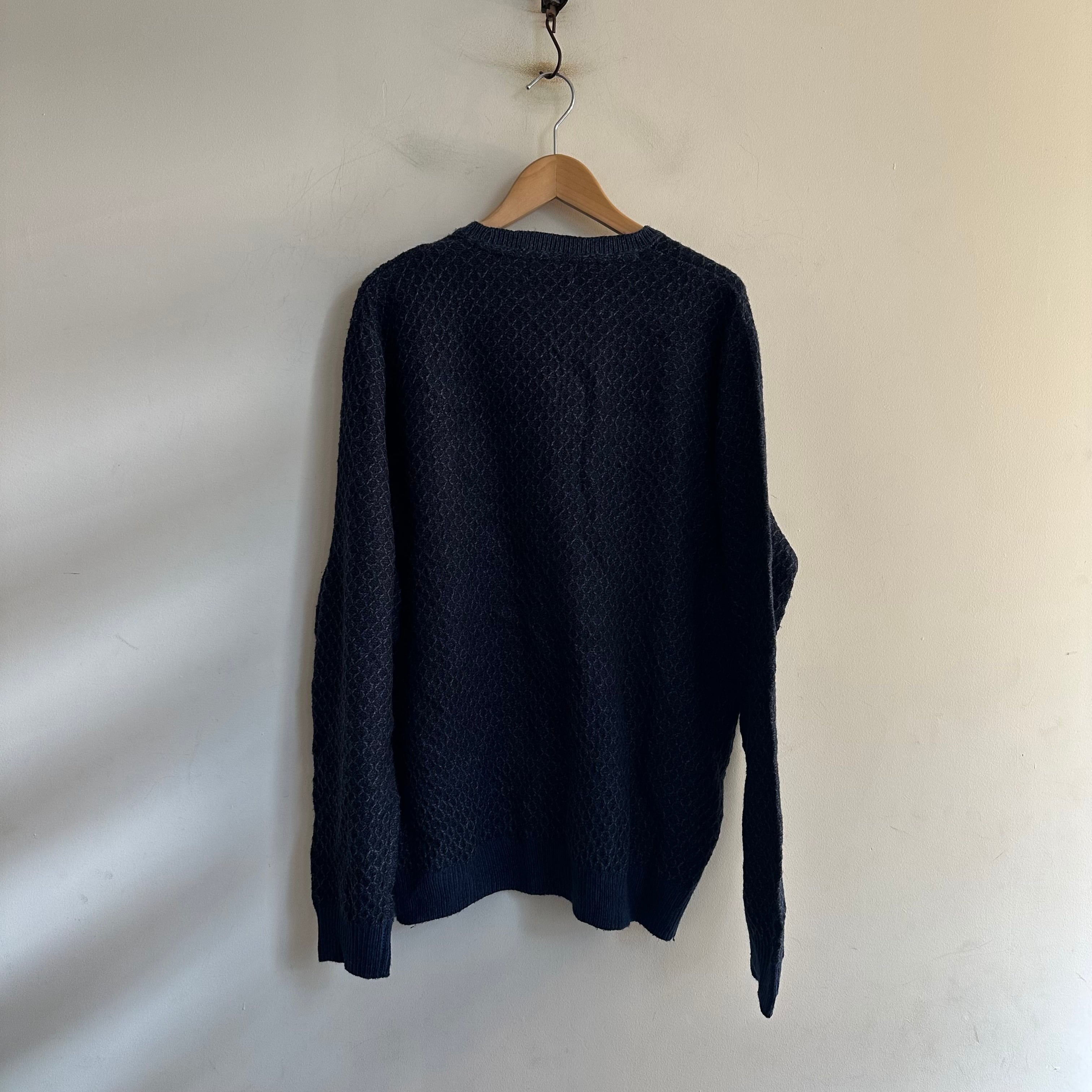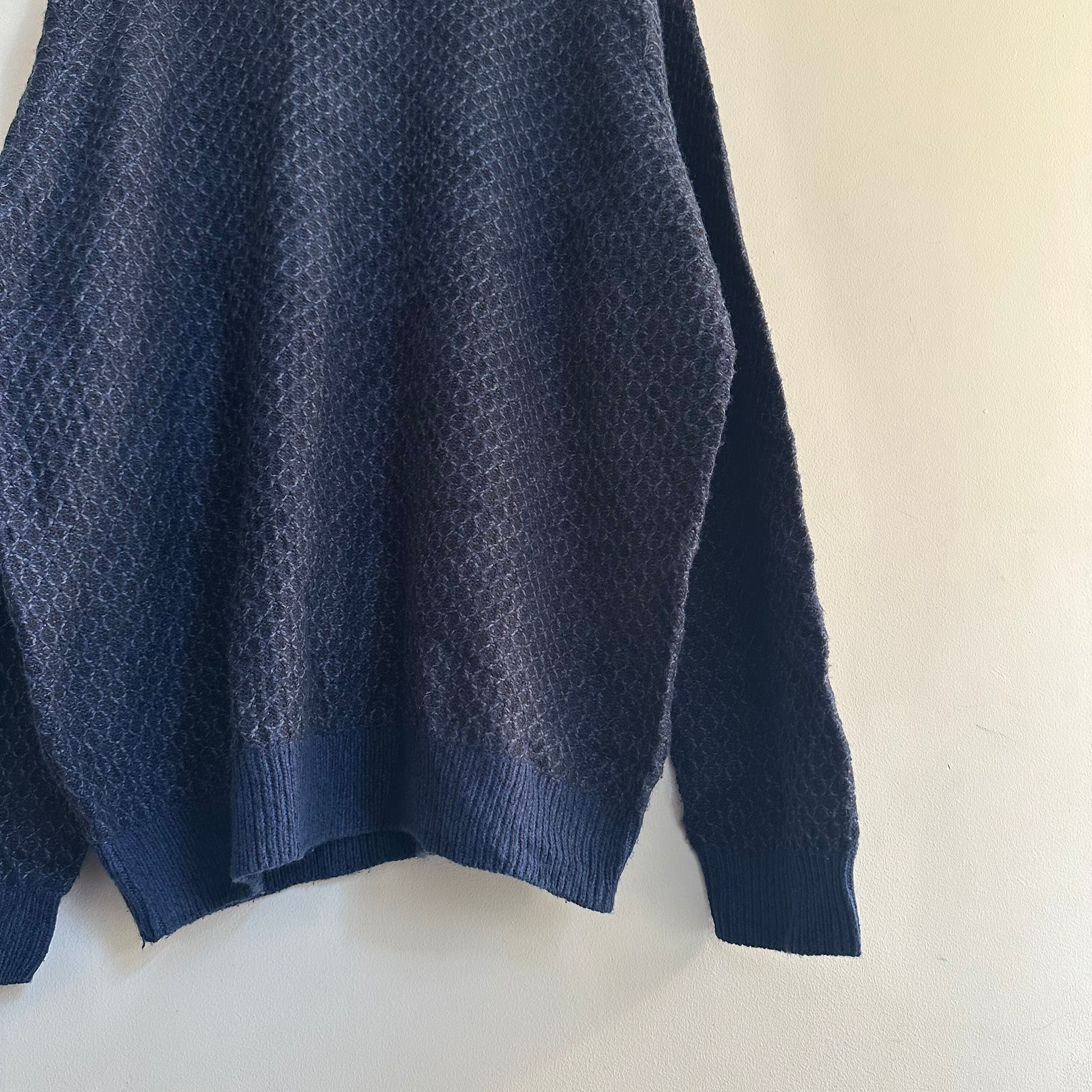 アクリルニットです。触った感じ、アクリルベースの生地感。ネイビーベースに、凹凸感のある織り。カッコいいですよ。ざっくり緩めのサイズ感で。お好きな方、いかがでしょうか。