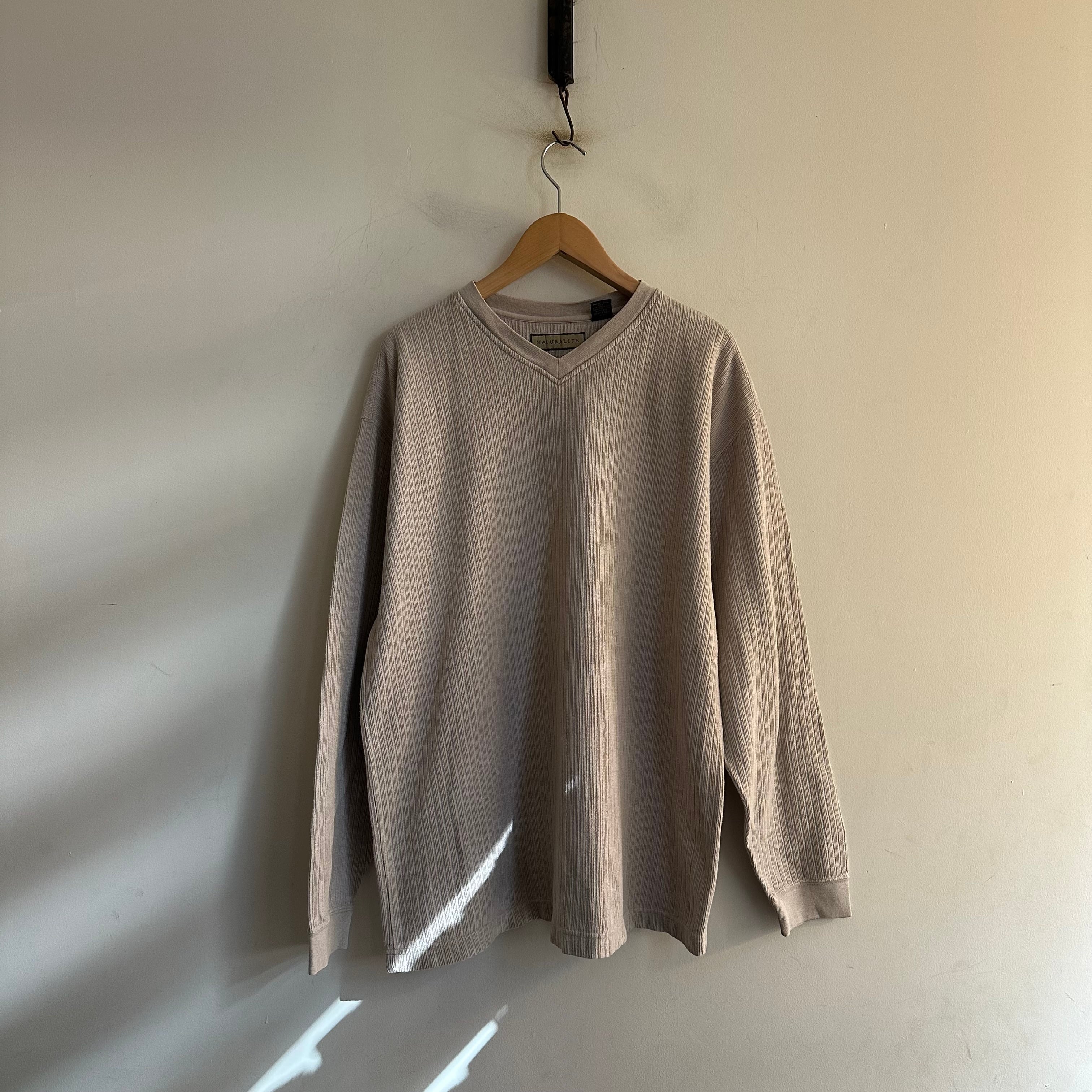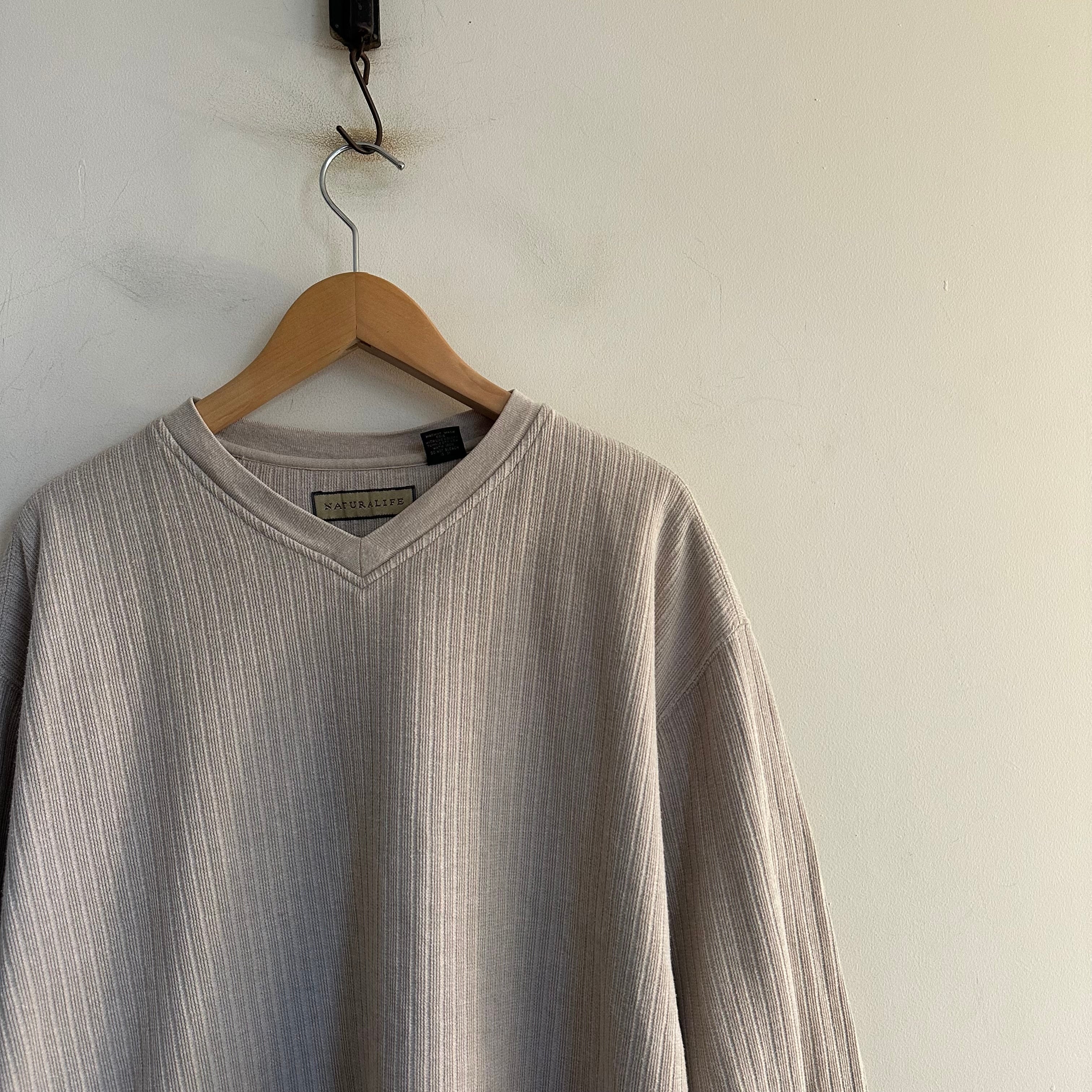 薄ニットです。浅めのVネック。リブ織り。ストンとしたシルエット。カットソー感覚で。お好きな方、いかがでしょうか。