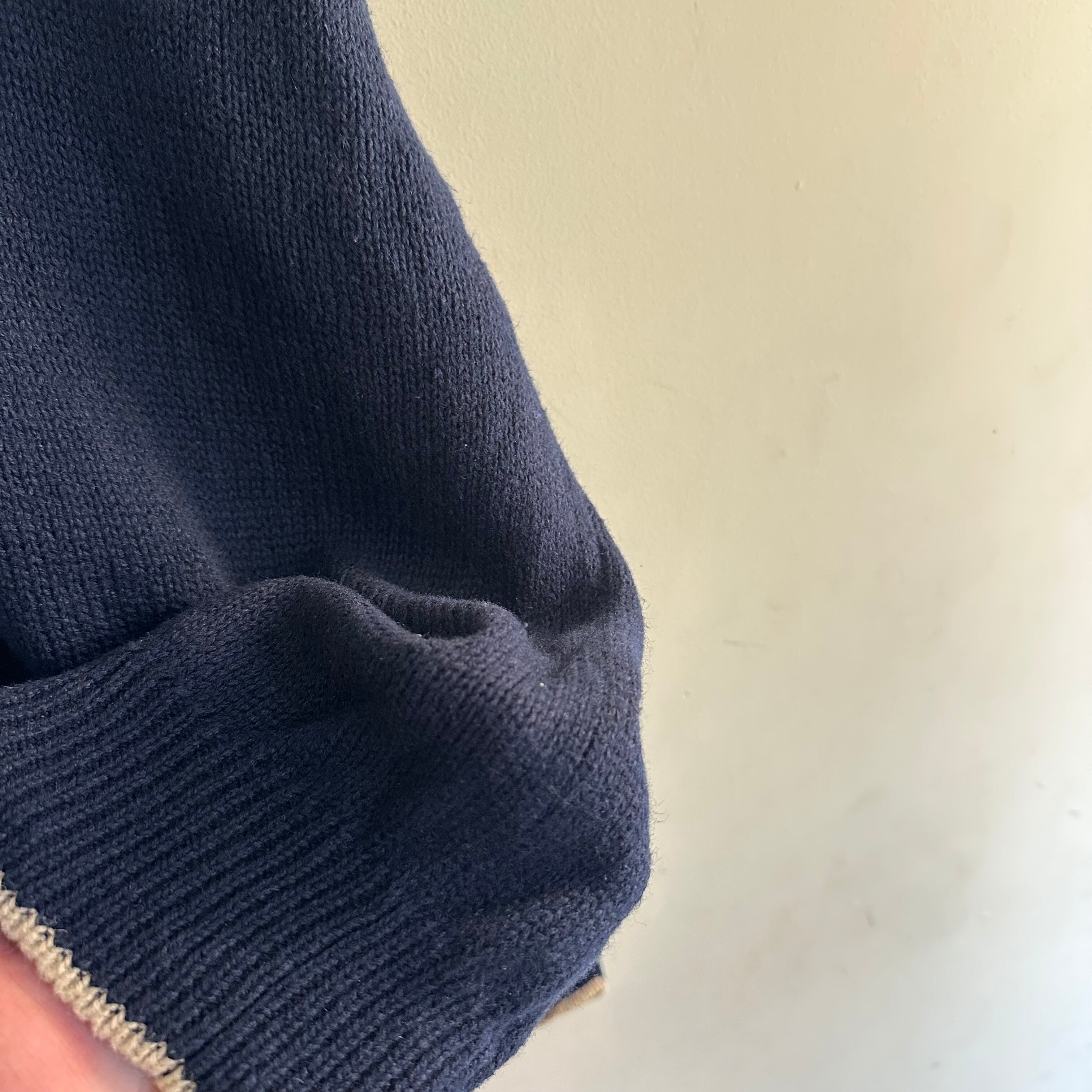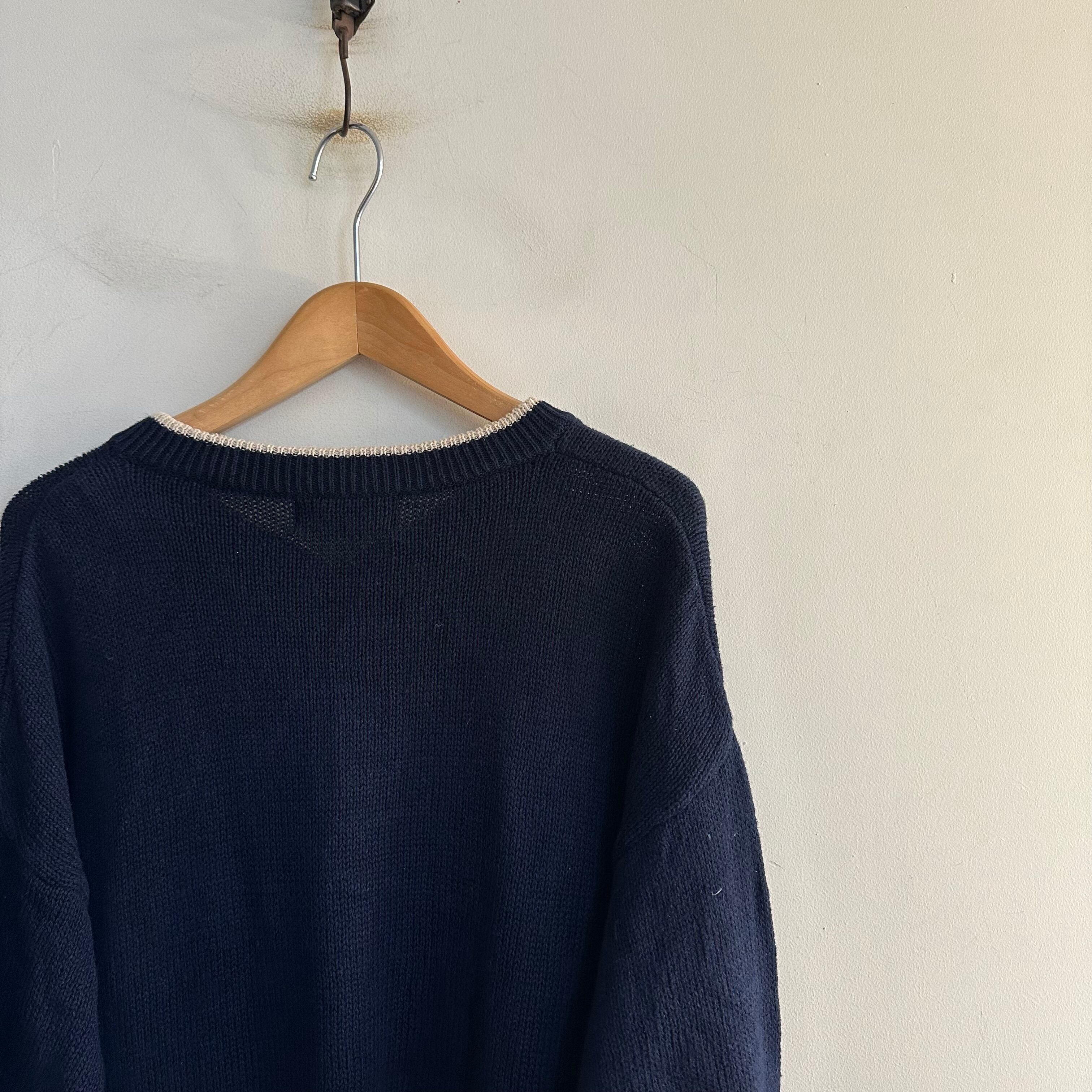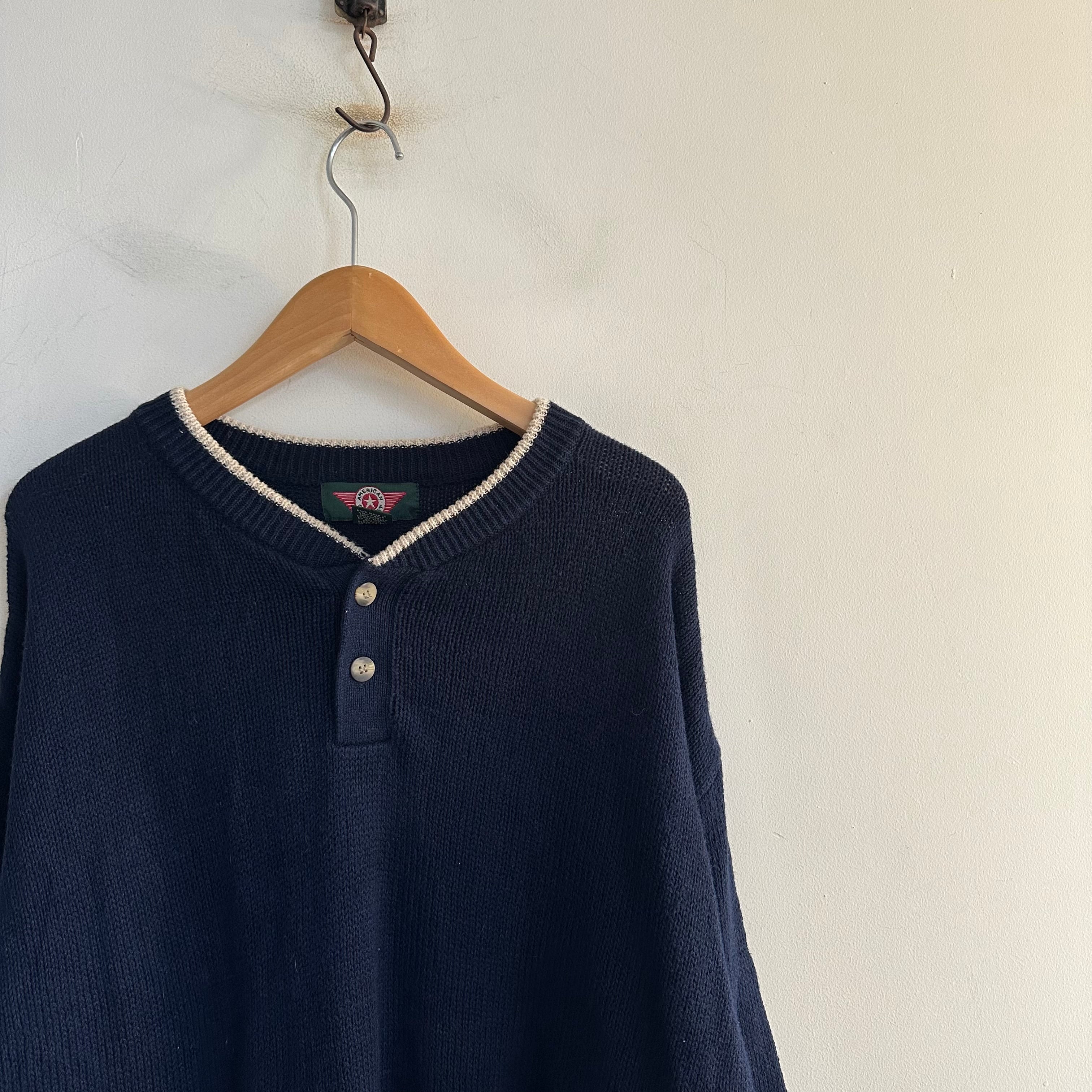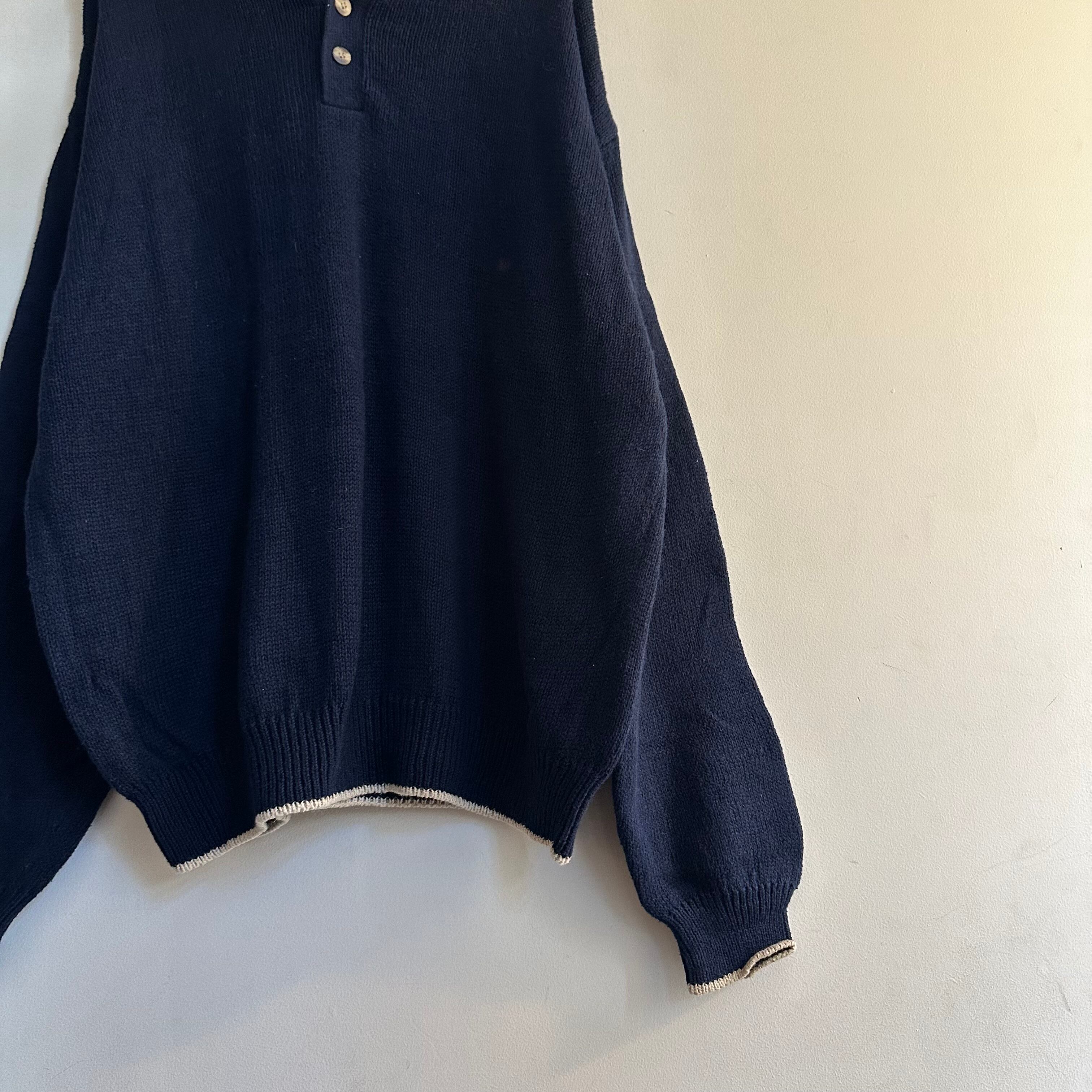 コットンニットです。ヘンリーネック。ネイビーに白のパイピングが可愛いです。緩めに。程よくボリュームだして。お好きな方、いかがでしょうか。